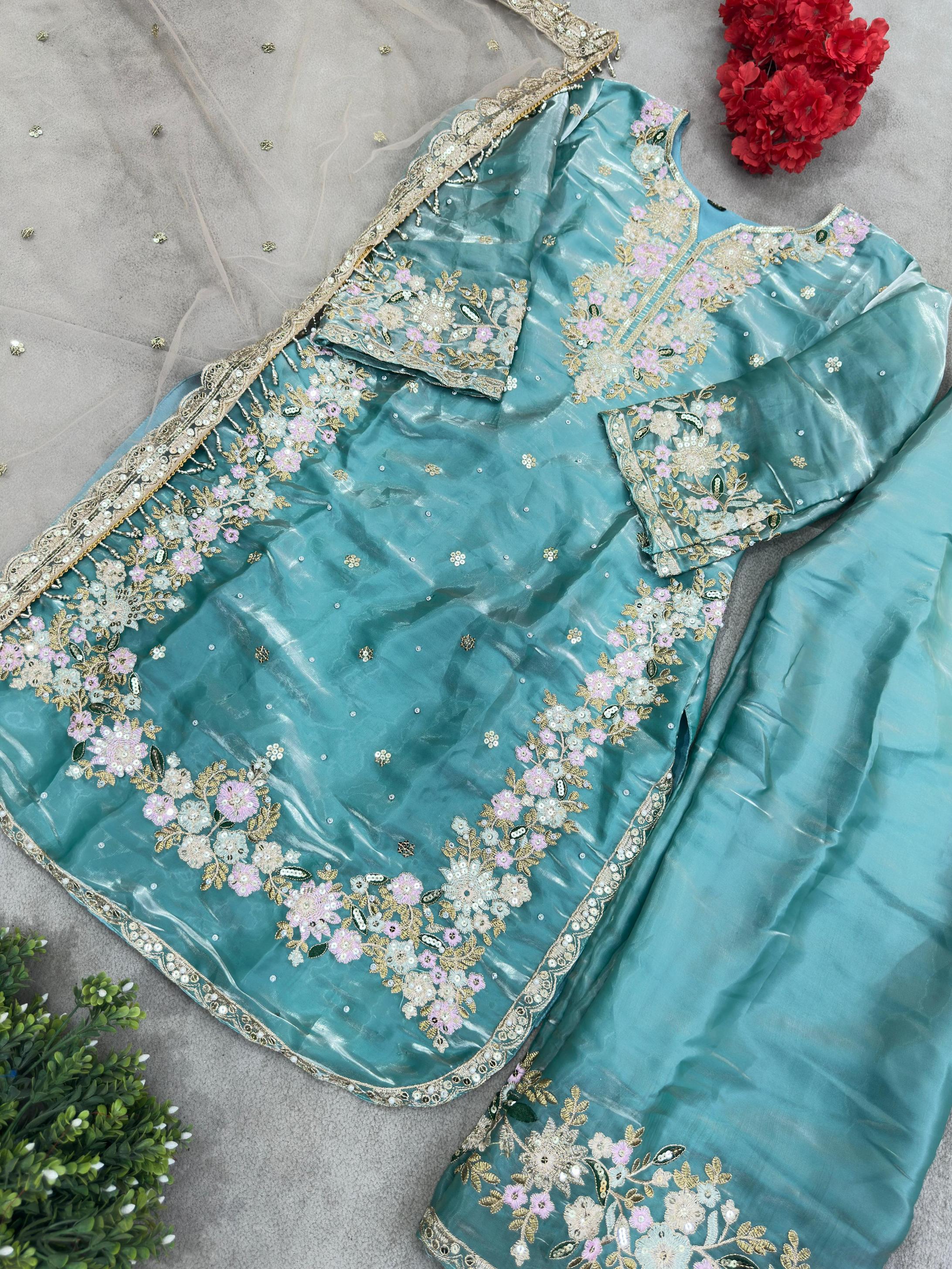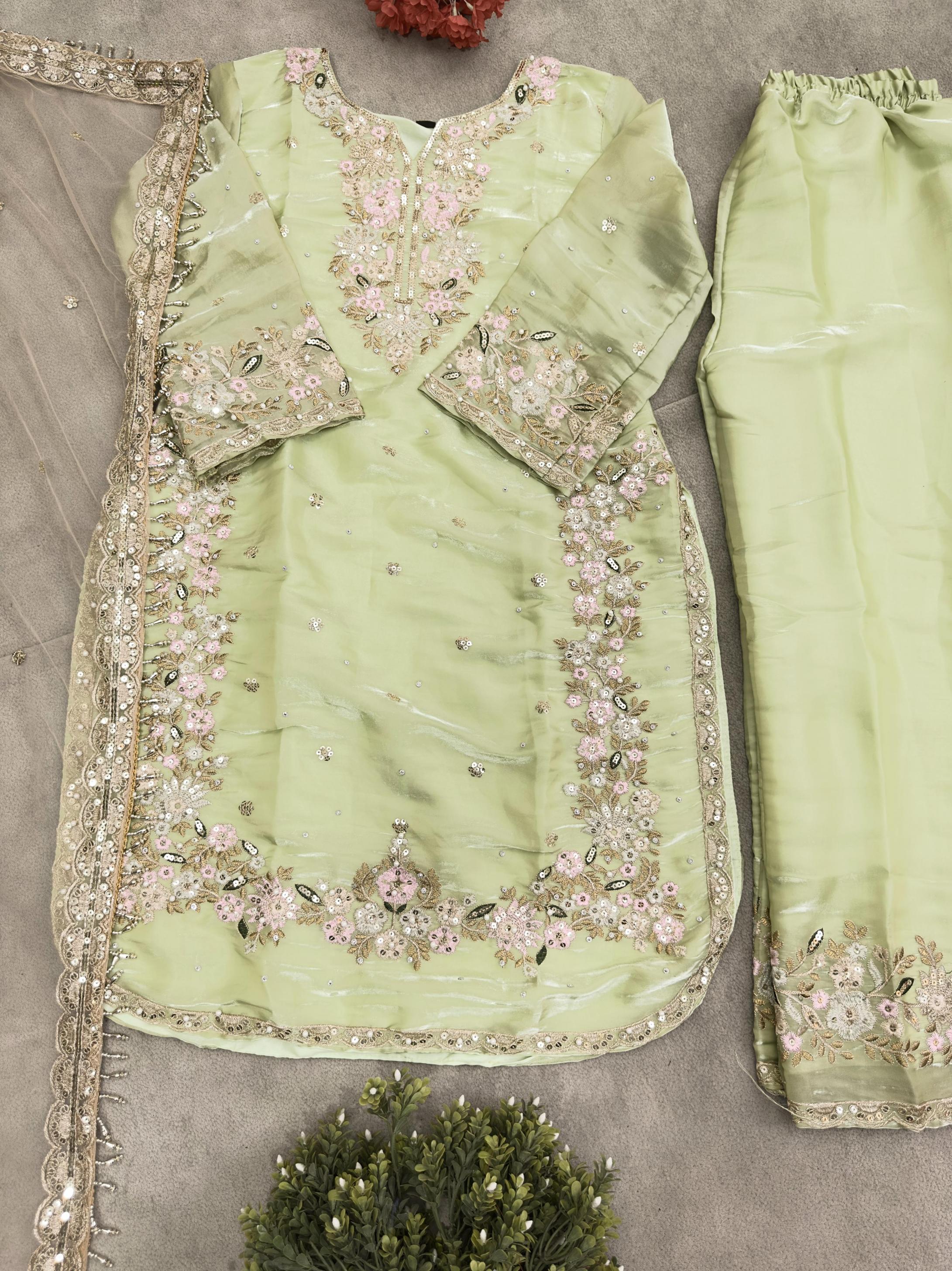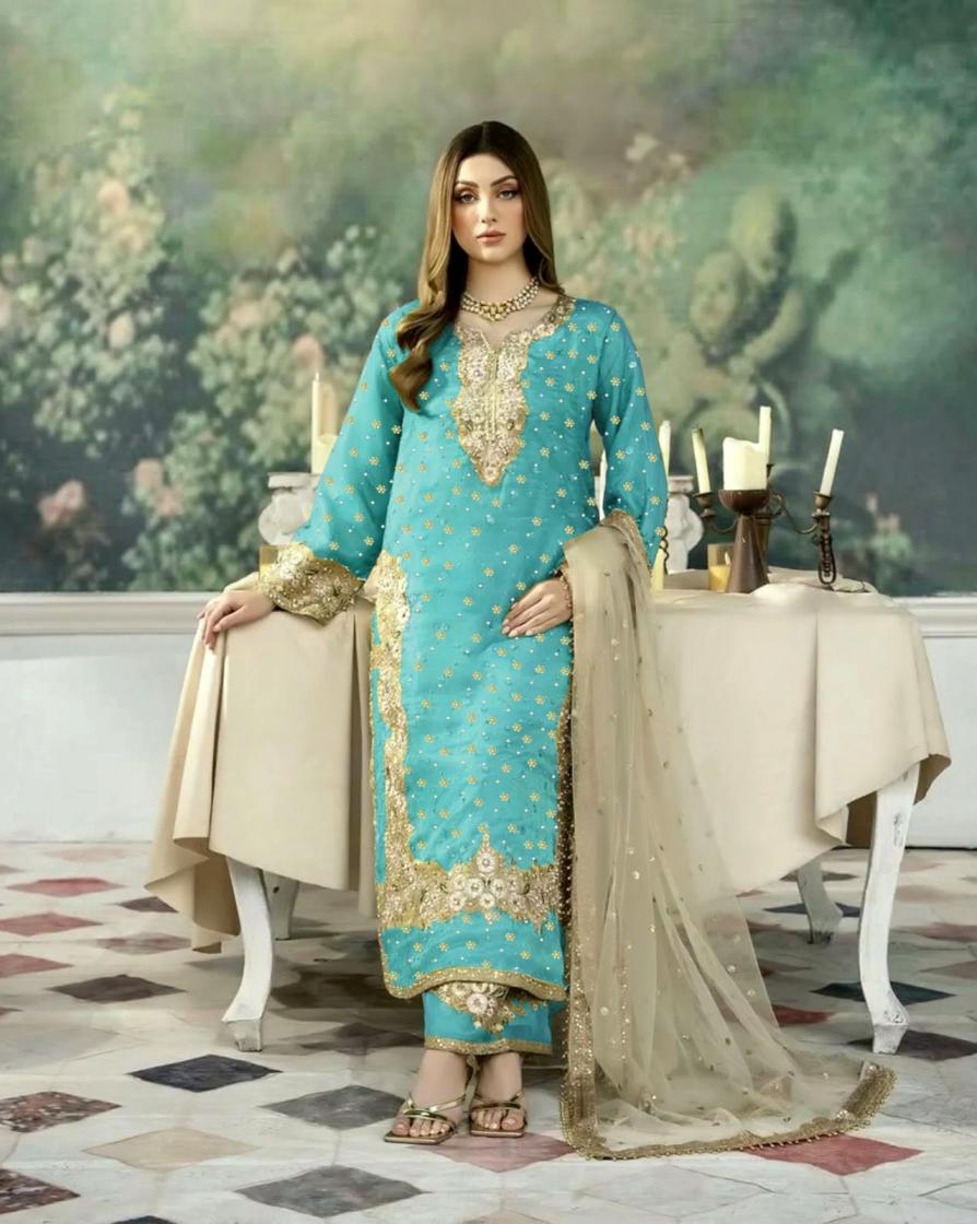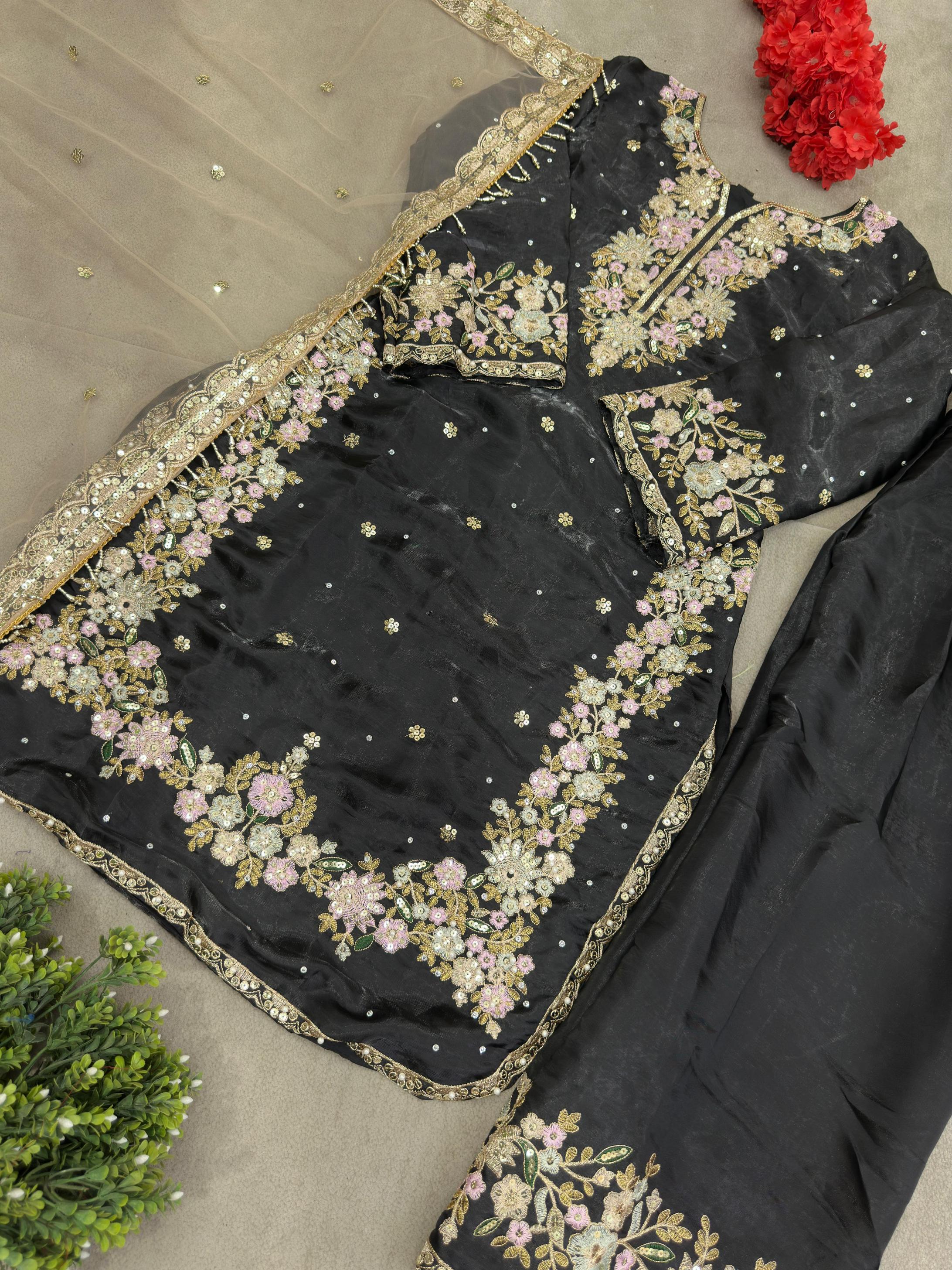 A stunning traditional outfit adorned with intricate golden embroidery, featuring a rich cherry-colored base paired with a delicate beige net dupatta. Perfect for festive occasions and formal gatherings. DN: 5115 👗TOP 👖BOTTOM Fabric :- JIMMY CHOO 👗Dupata Fabric : HEAVY NET Weight :- 1KG Price:- 1350₹ ❤️PREMIUM AND SHOWROOM COLLECTION |