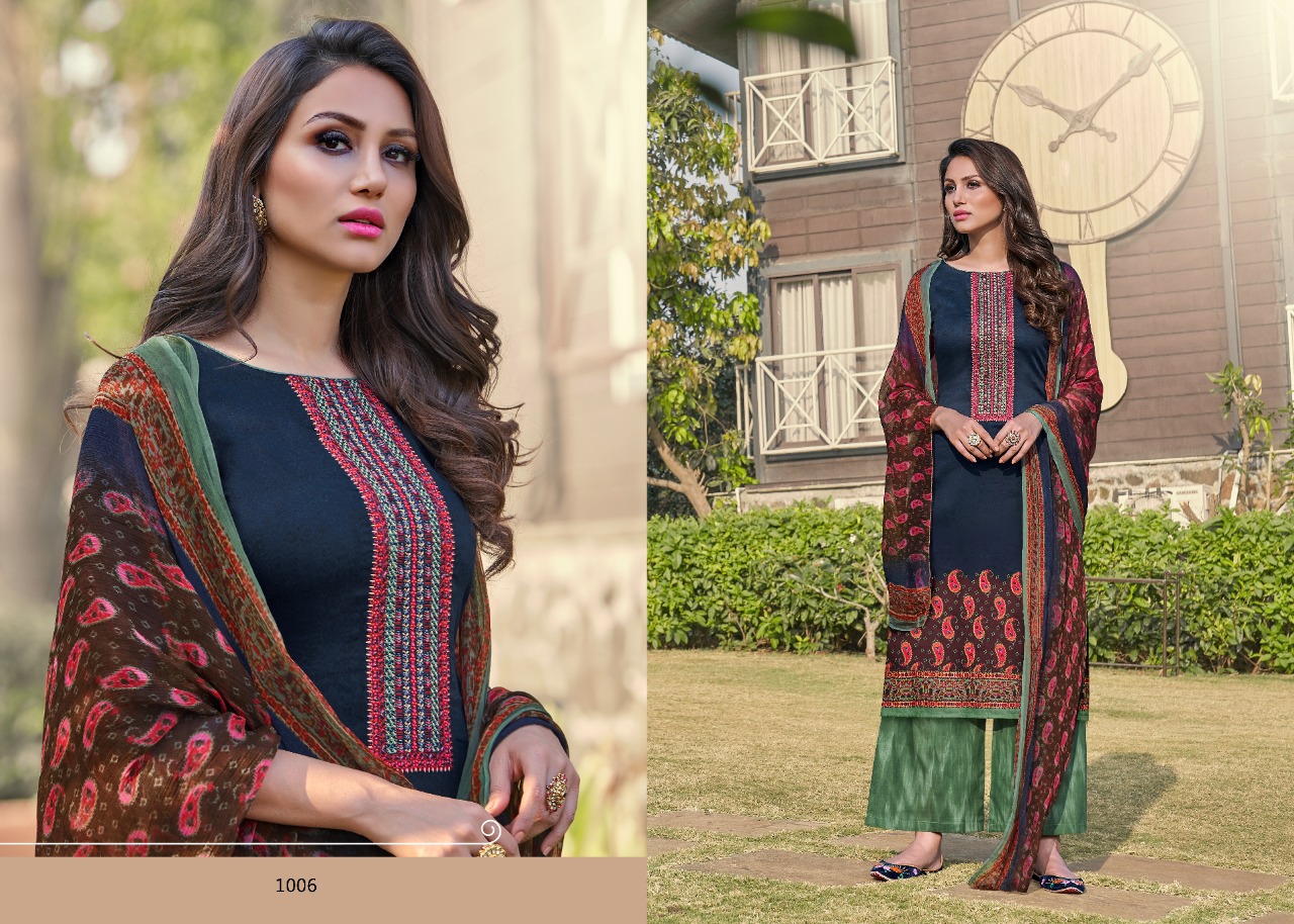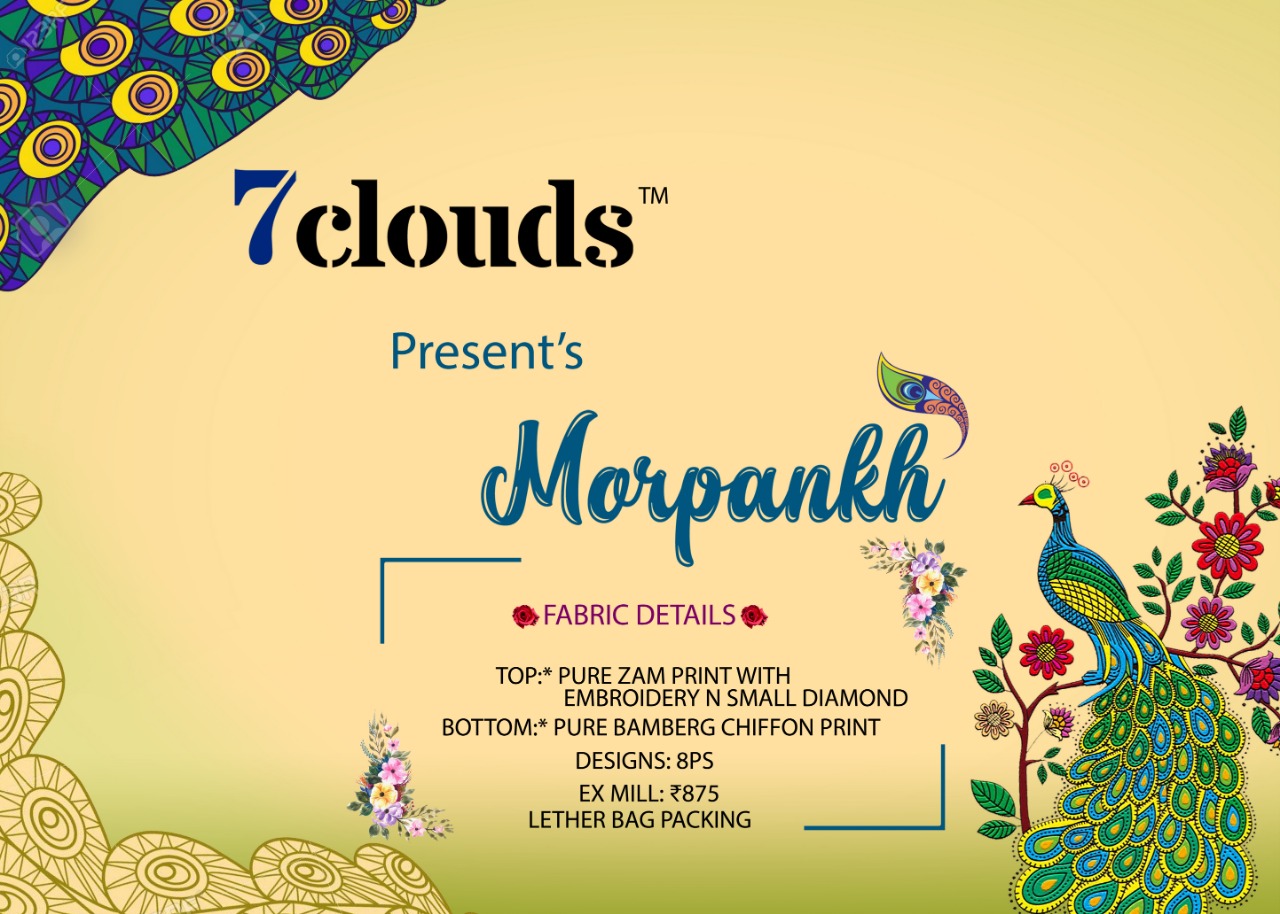 7 CLOUDS Present MORPANKH Fabric Details Top:*PURE ZAM PRINT WITH EMBROIDERY N SMALL DIAMOND Bottom:*PURE CAMRIC Dupatta:*PURE BAMBERG CHIFFON PRINT Designs: 8 PCS Ex Mill:₹875 per Pcs . LETHER BAG PACKING Set to set . GST 5 Percent Extra. Delivery 3-4 days |