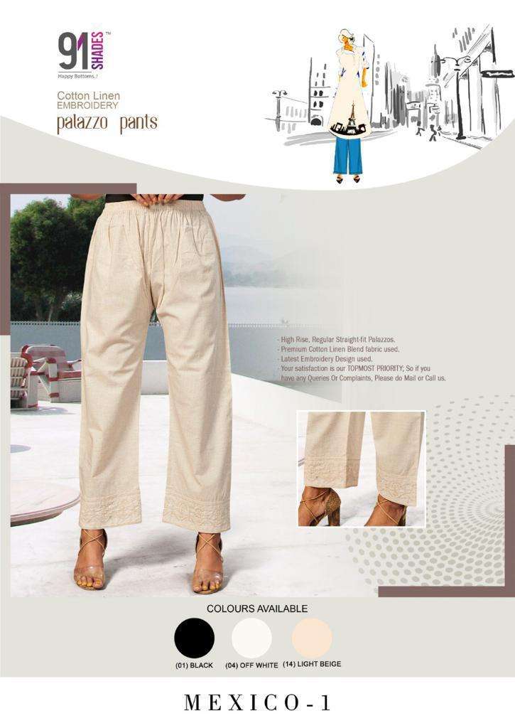 Brand - â91SHADESâ Item - BottomWear Itemname - MEXICO-1 & MEXICO-2 Desc. - EmbroideryWork Palazzo Pants Fabric - Â Cotton Linen Slub (Woven) Colours - 3 colours Sizes - 2 sizes->S/M , L/XL RATE @ 305/- #Kindly Note that Sizes are Optional & Colours Compulsory. |