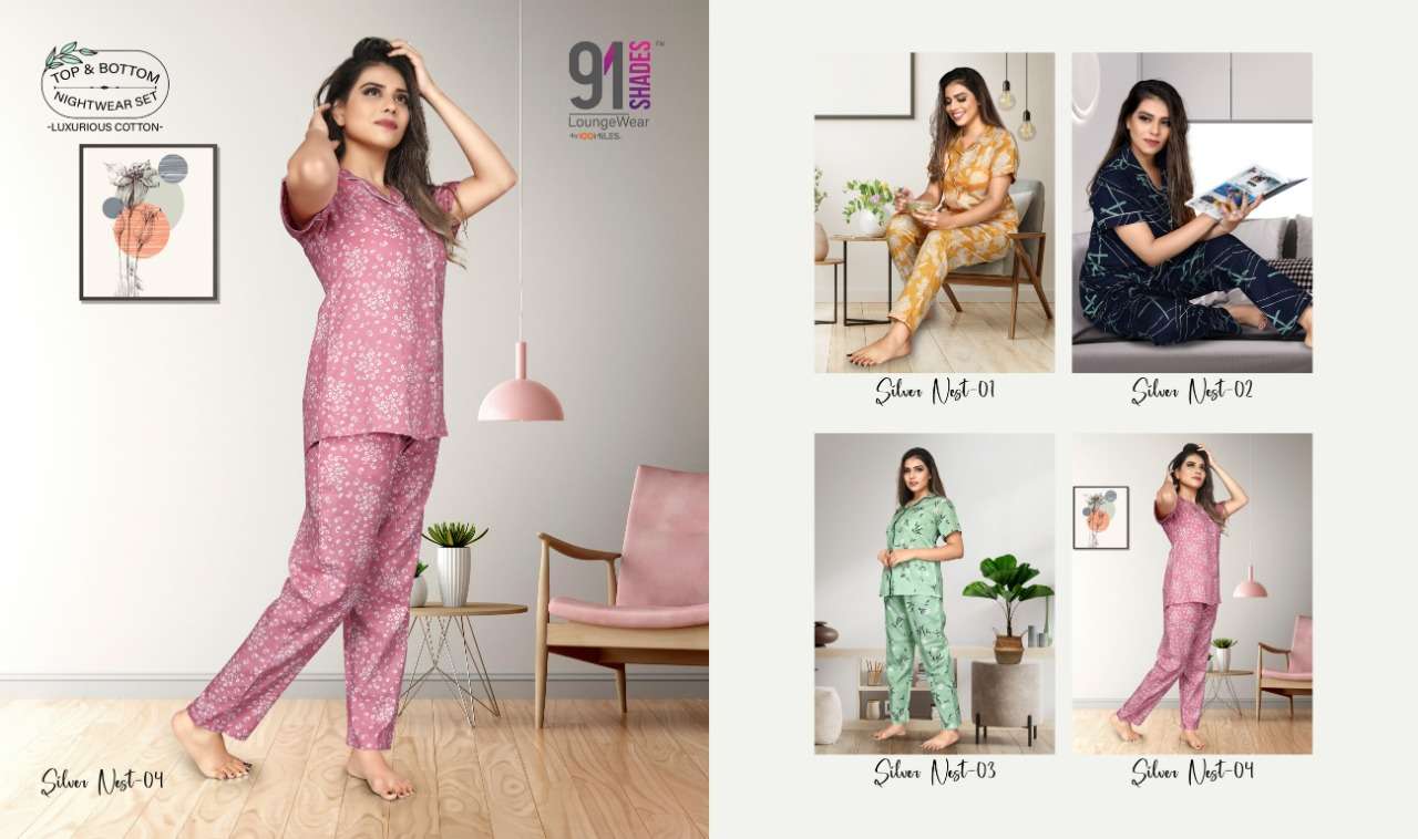 Brand -91SHADES⢠ItemType- Nightwear/Loungewear Catalog - Silver Nest Product Desc -  *Pure Cotton Printed Top & Bottom Set * Sizes - S, M, L, XL Pieces - 4 per bag RATE - 445/-(with bottom)  |