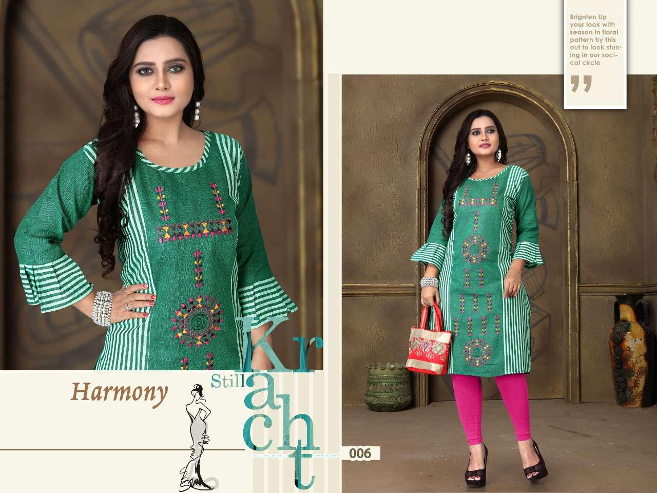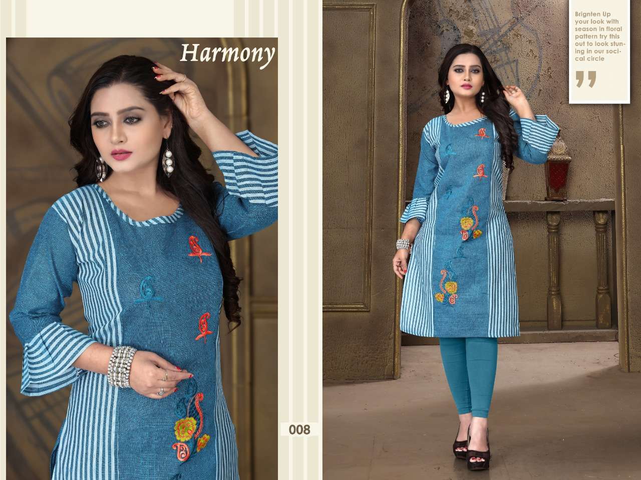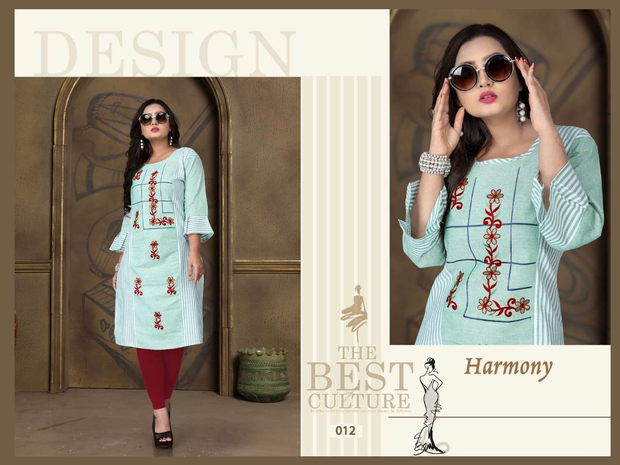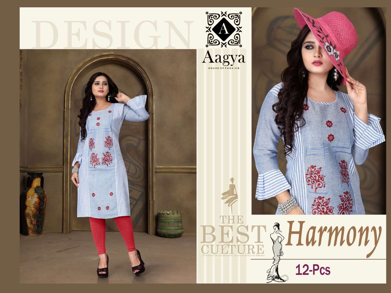AAGYA Catalogue name-Â Â HARMONY Details Fabrics - Kurta - South Cotton With Embroidary Work Size - Â L(40)XL(42)XXL(44) Â Â Designs- 12 pcs Rate - 210/- Limited stock ... |