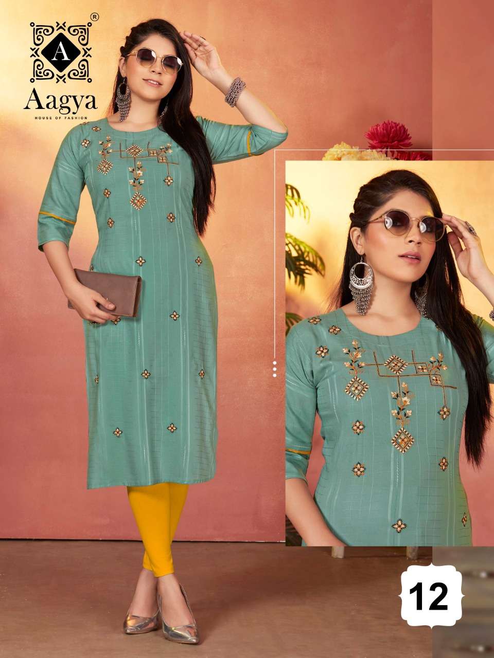 AAGYA KIA V.2 HEAVY WEAVING RAYON MUMBAI FABRIC KURTI CATALOG WHOLESALER BEST RATE