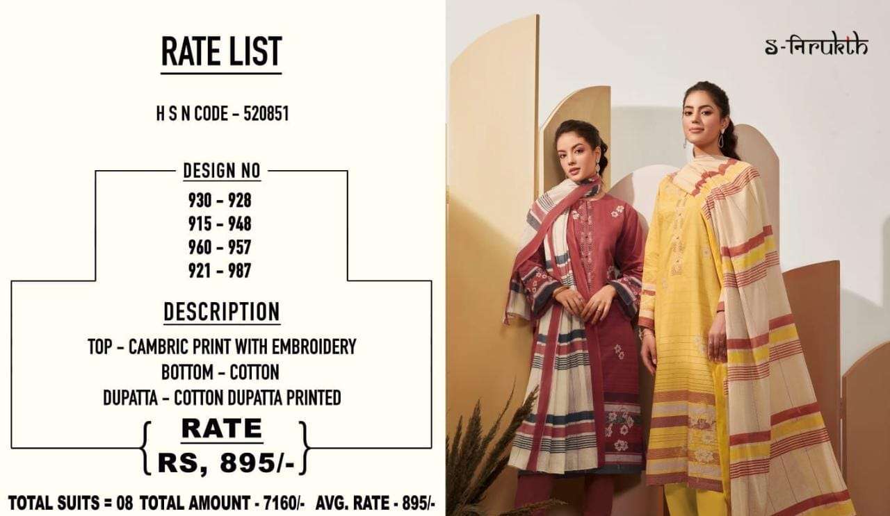S Nirukth Presents Latest Collection Launched on 18-05-2023. Presenting Beautiful collection of 8 PCS with Unstitched .