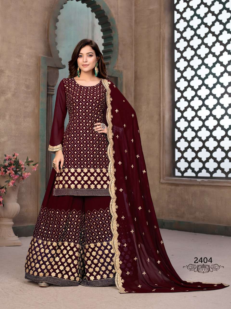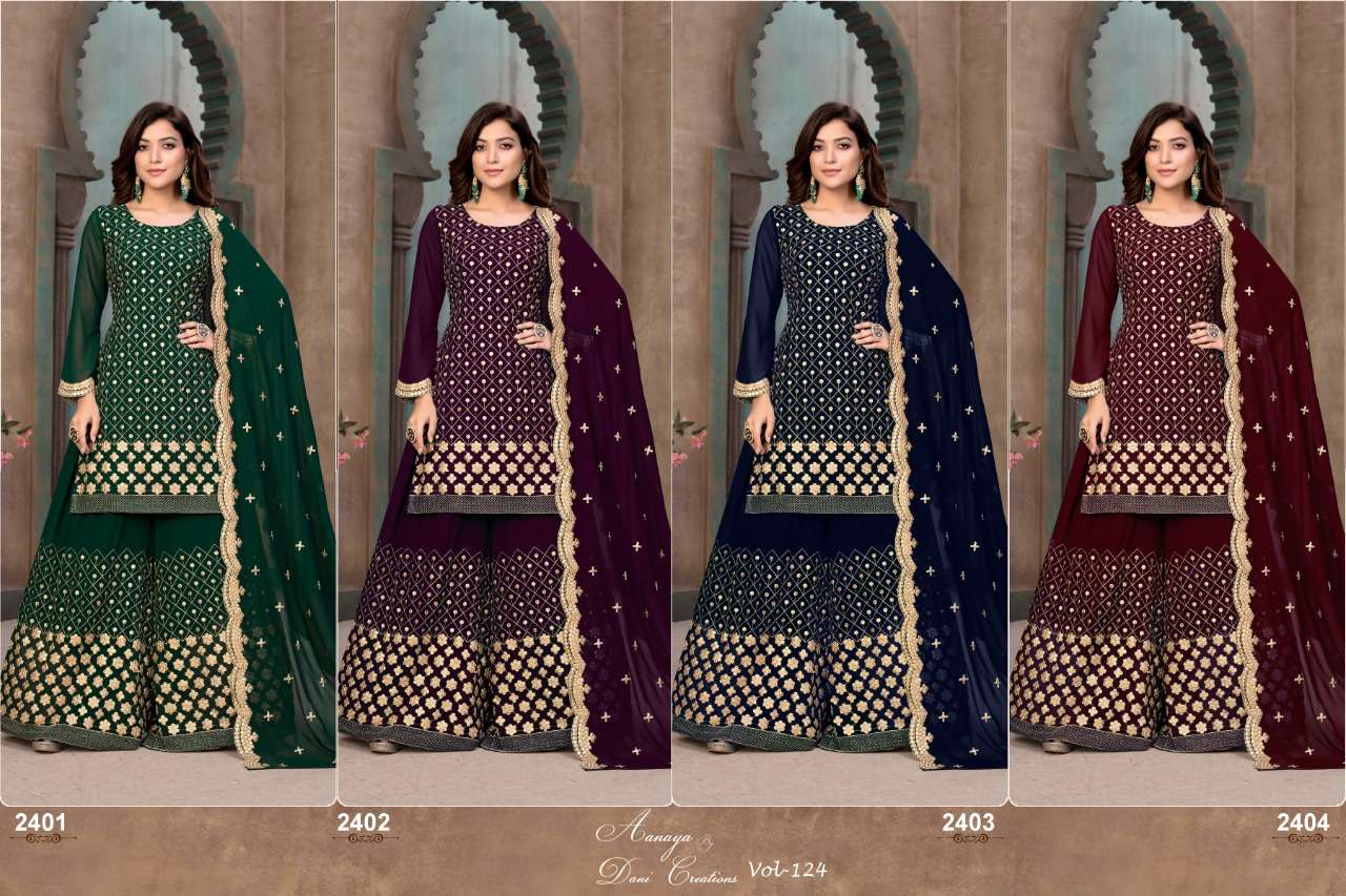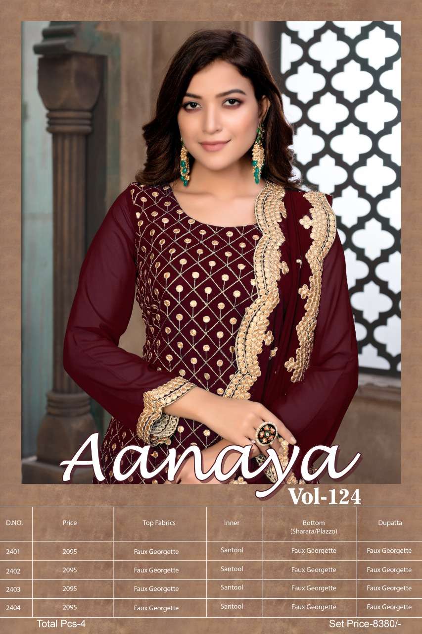 🌹Aanaya Vol-124* 🌹 👗Top. – Faux Georgette 👖Inner/Bottom- Santool 👖Plazo-Faux Georgette 🇫🇲 Dupatta –Faux Georgette Price :- 2095/- Rs Dispatch Ready Semi stitched product upto size 50 GST 5 Percent Extra |