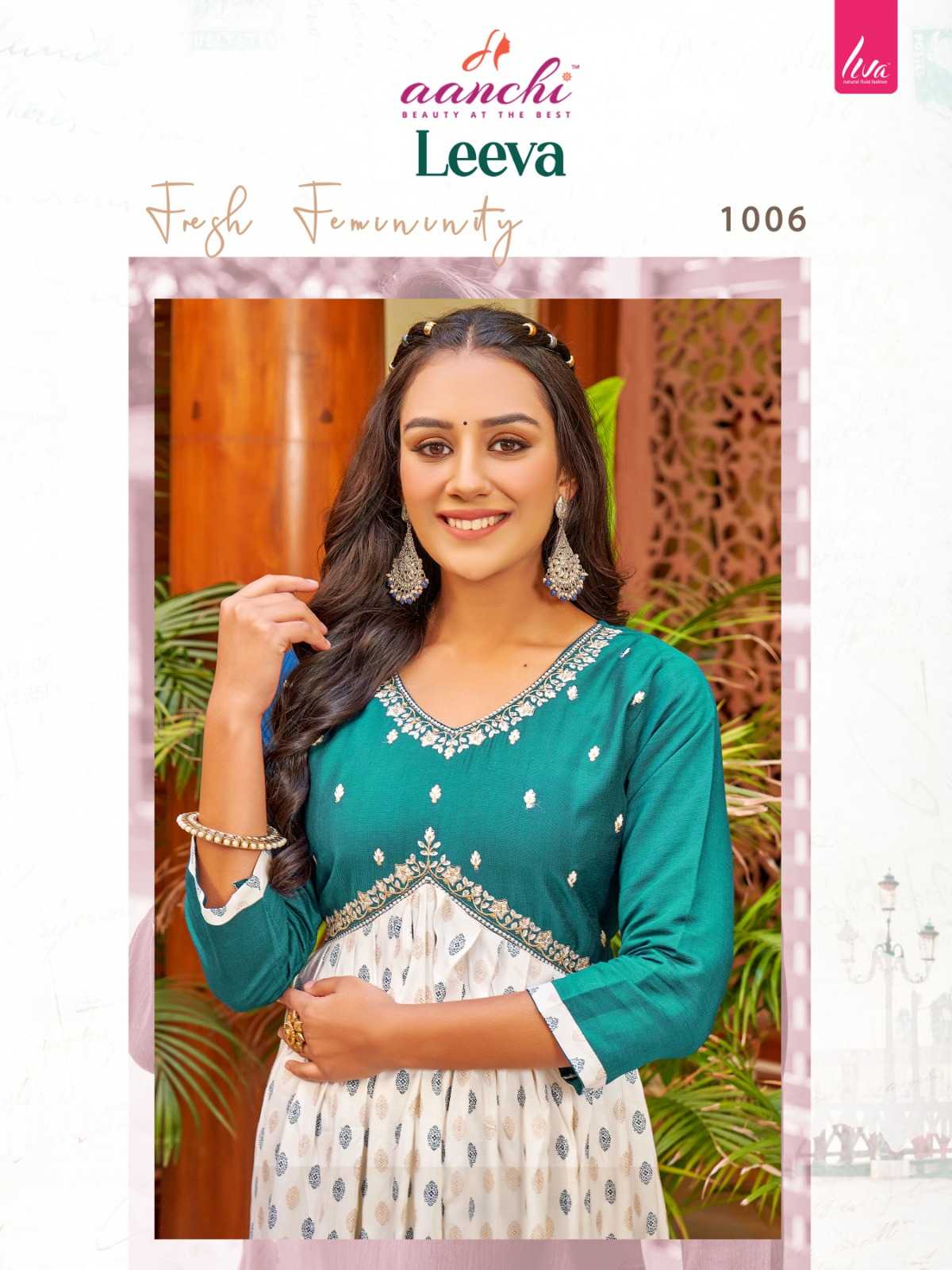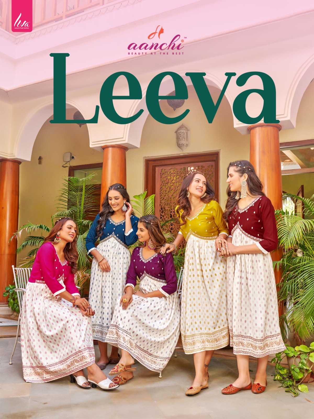🔅Aanchi Kurtis🔅 Catalogue name: LEEVA ⭐Details: 👗Fabrics: 👚Pattern- 🎗Size - M(19) L(20) XL(21) XXL(23) ☣Designs- 6 Pcs Rate 545