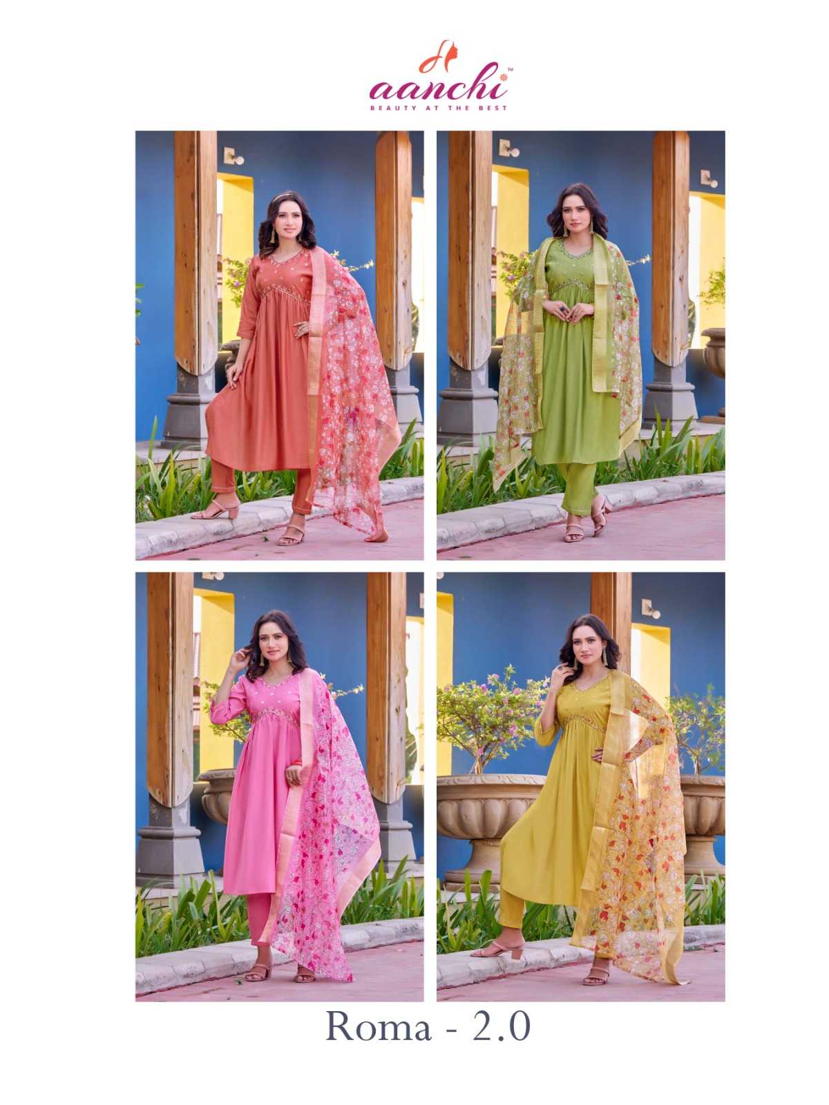 🔅Aanchi Kurtis🔅 Catlogue Name: Roma-2.0 ⭐Details: 👗Fabrics - ▶️ Roman Silk Alia Cut Top With Bottom & Digital Dupatta 👚Pattern- 🎗Size - L TO XXL ☣Designs- 4 pcs