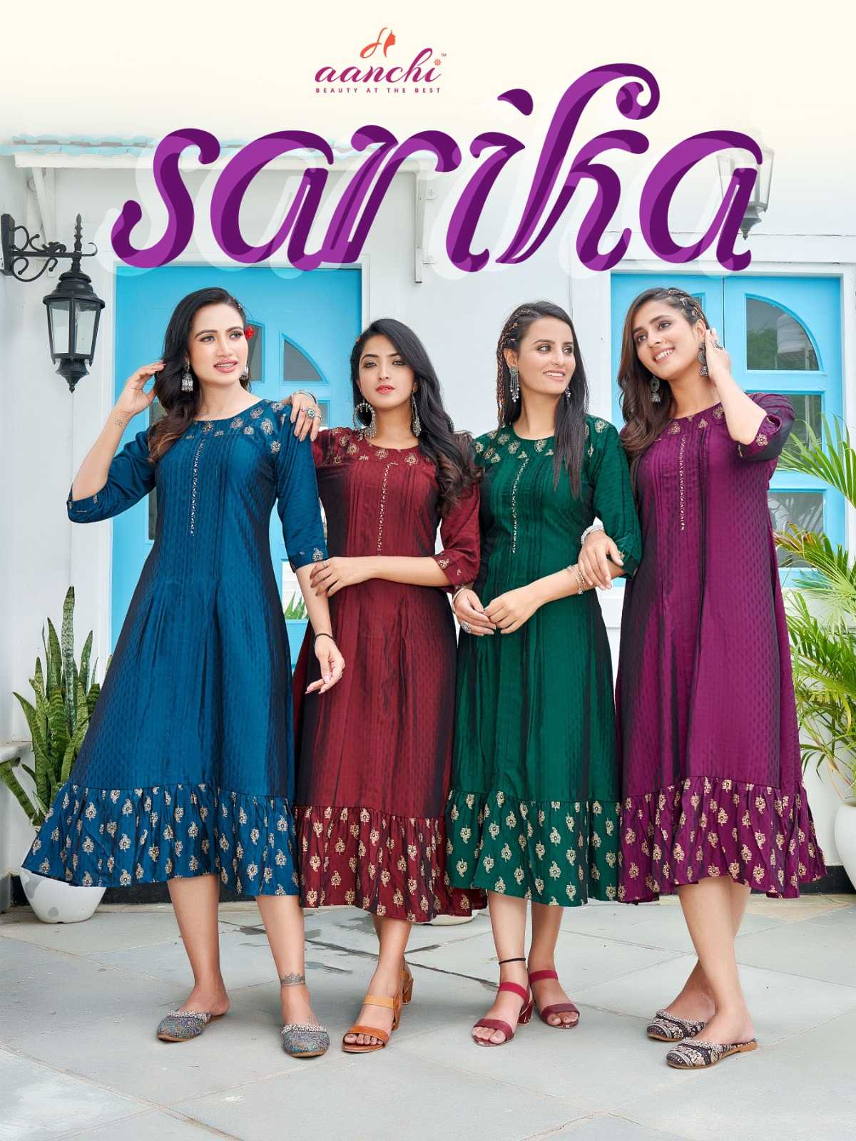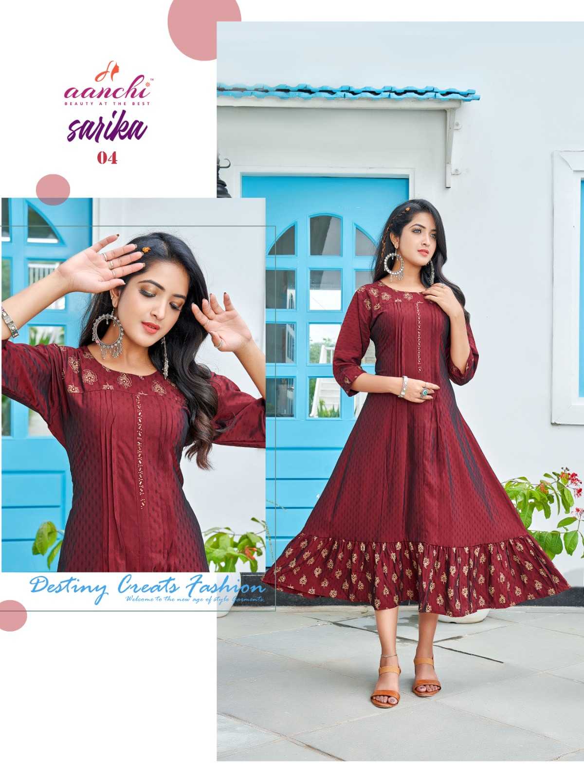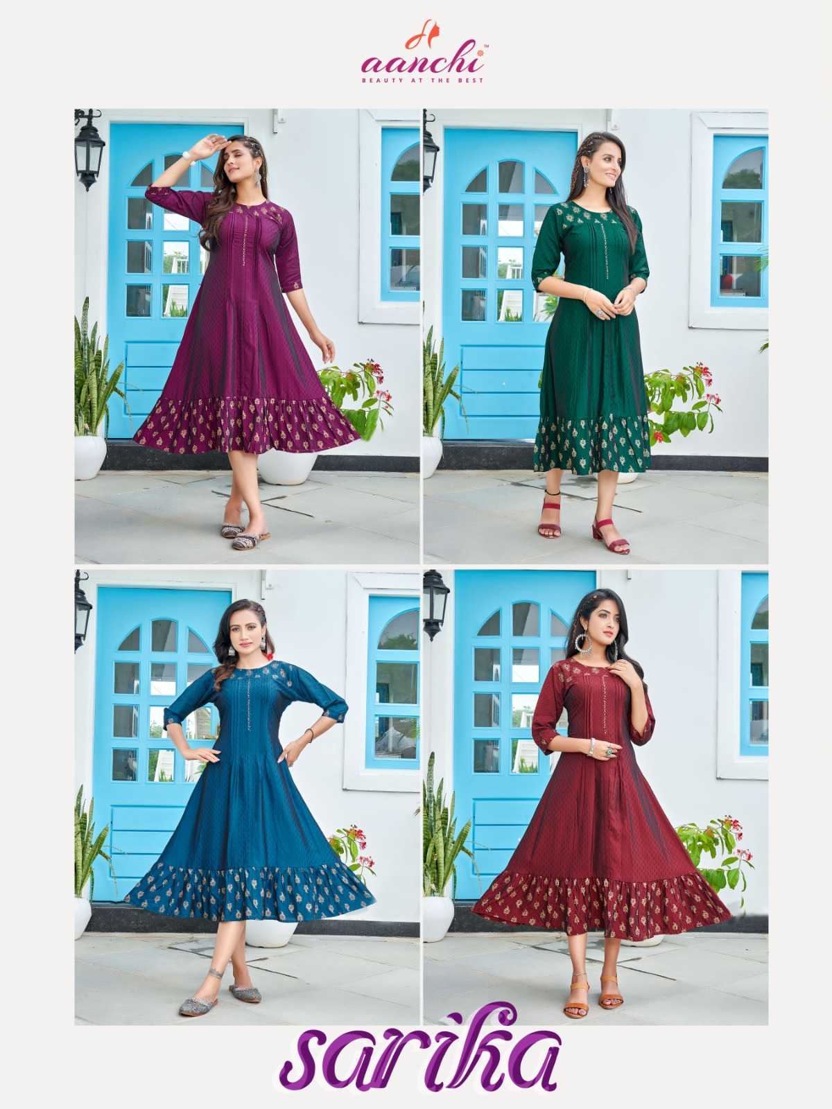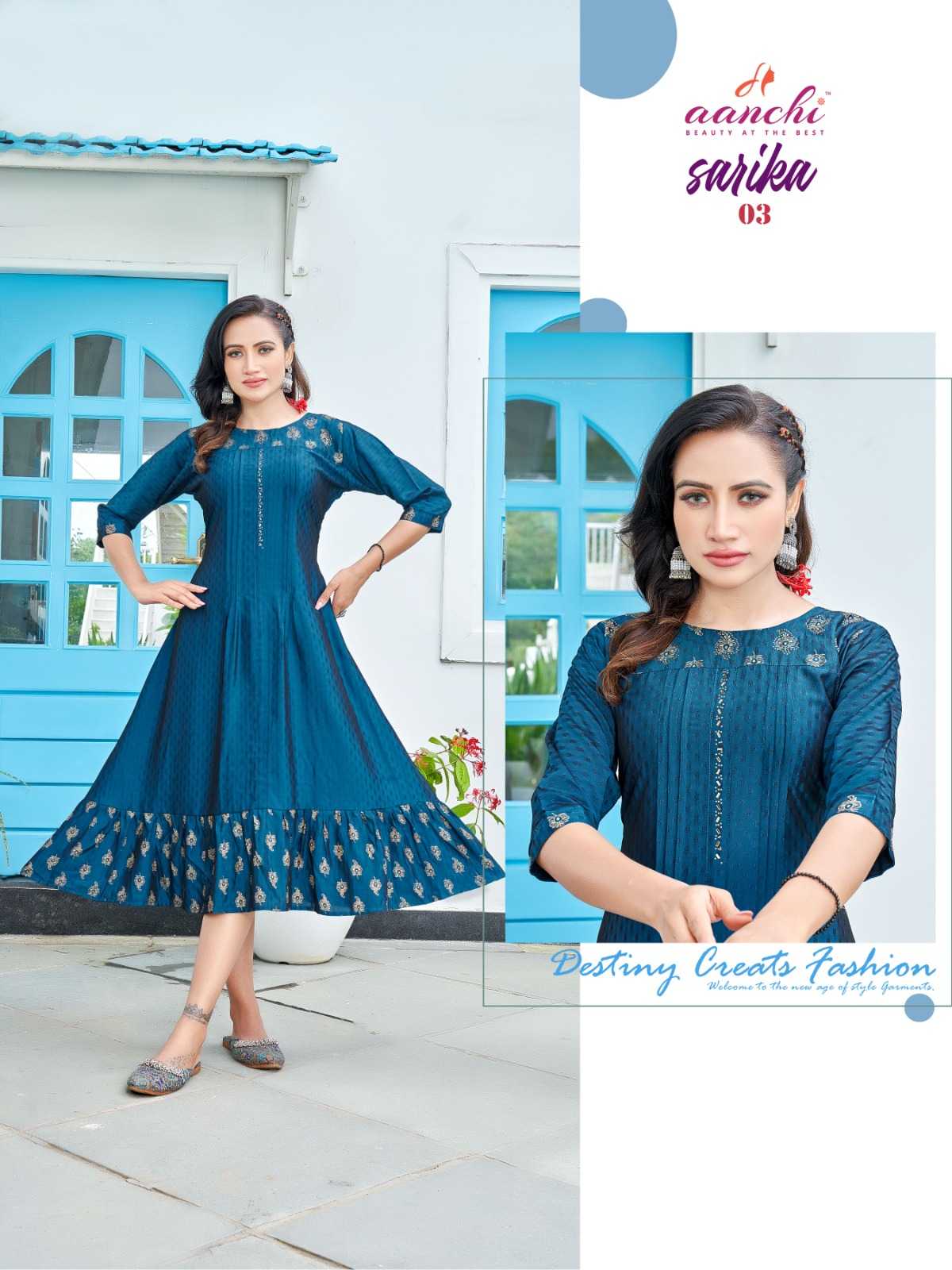 aanchi sarika readymade fancy print with diamond work flair long kurti