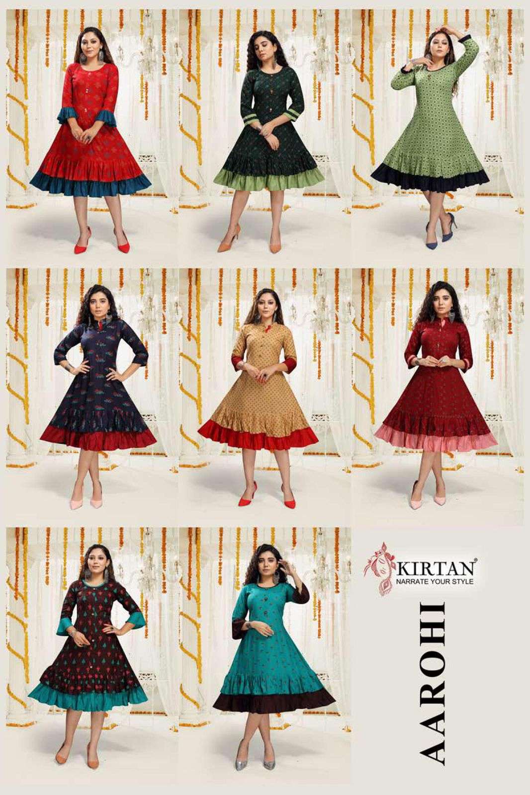 Aarohi by kirtan heavy rayon print flair pattern with ghaghari kurti catalog wholesaler best rate