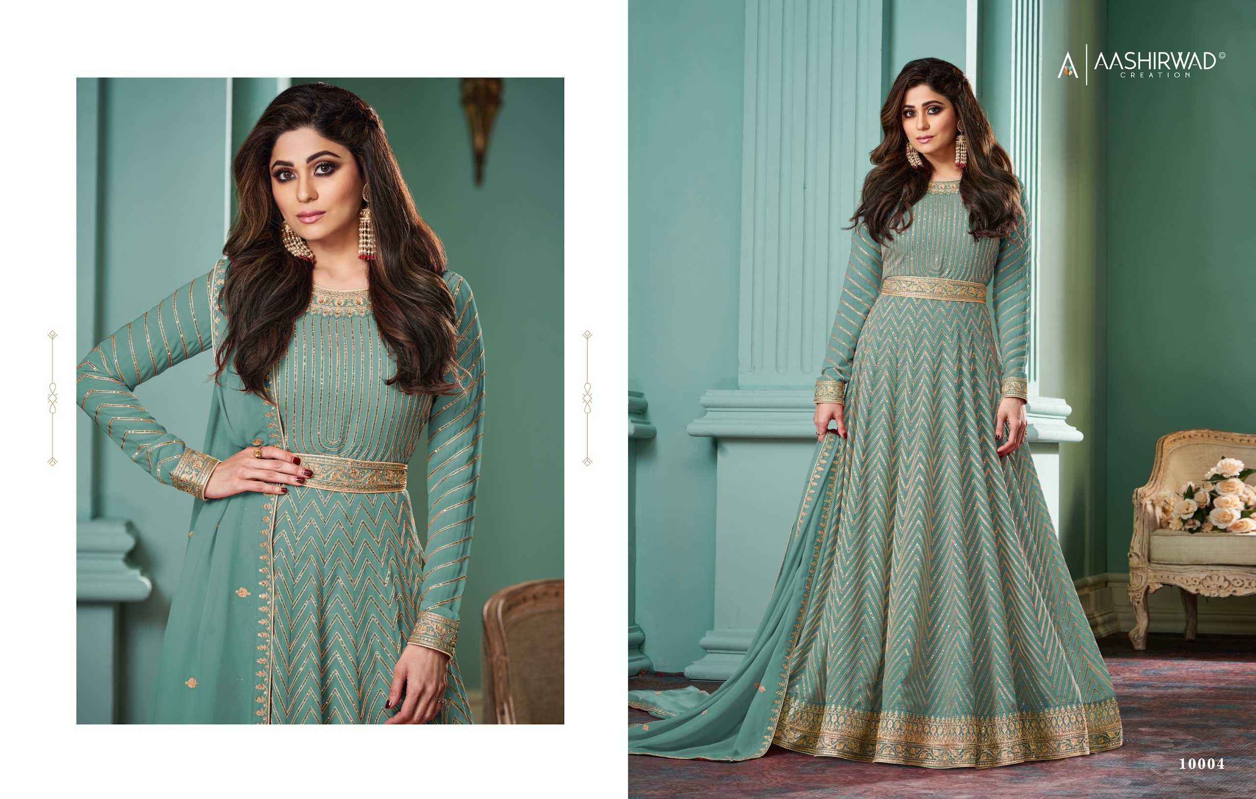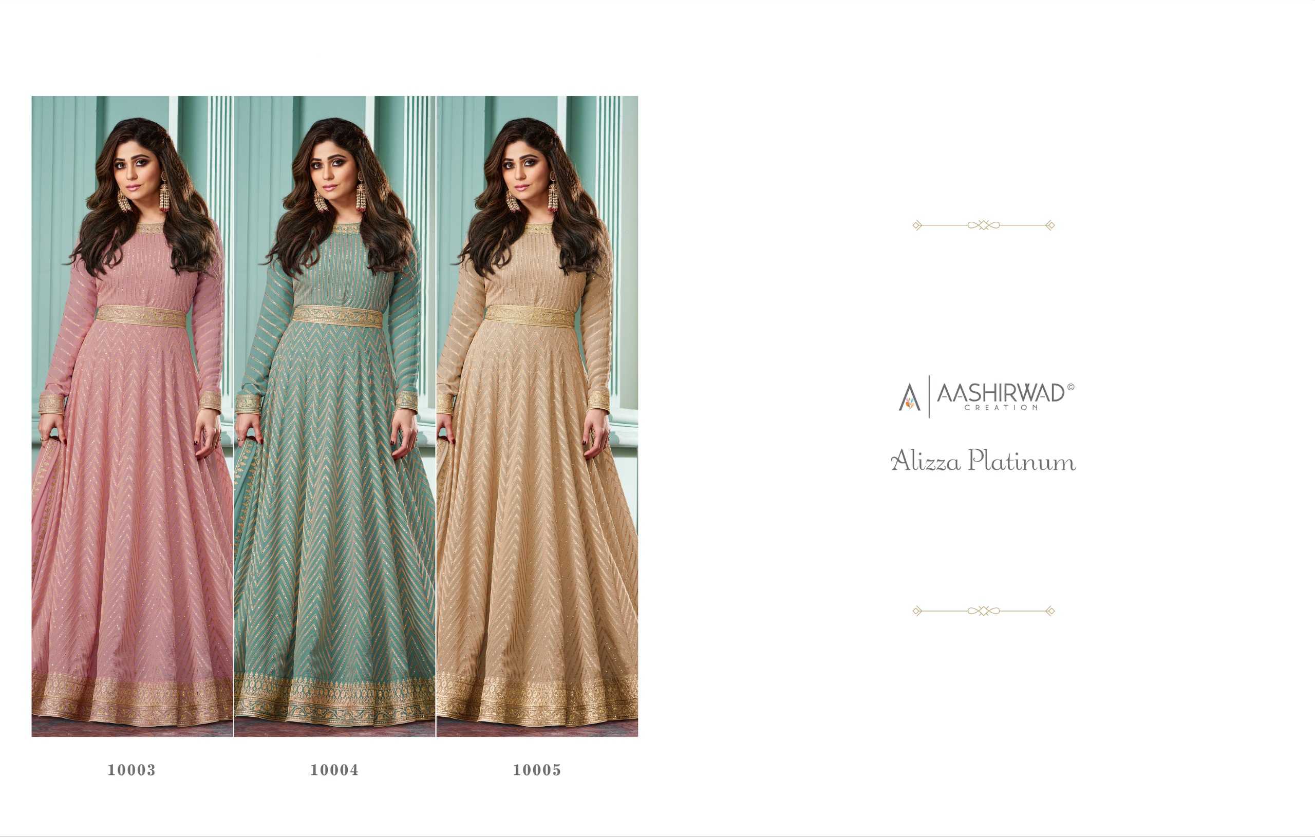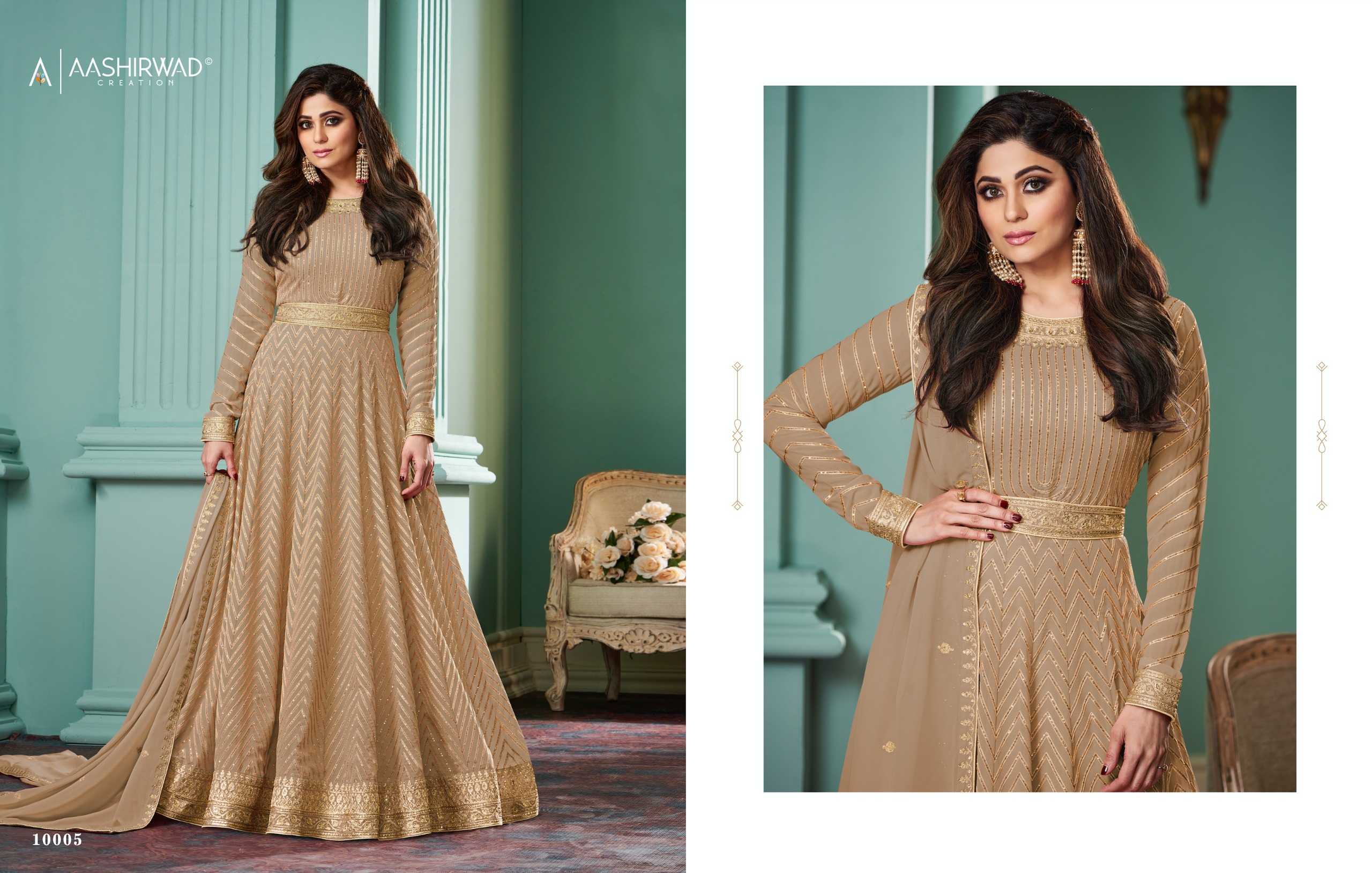 aashirwad creation alizza platinum wedding wear fancy georgette full stitch gown set