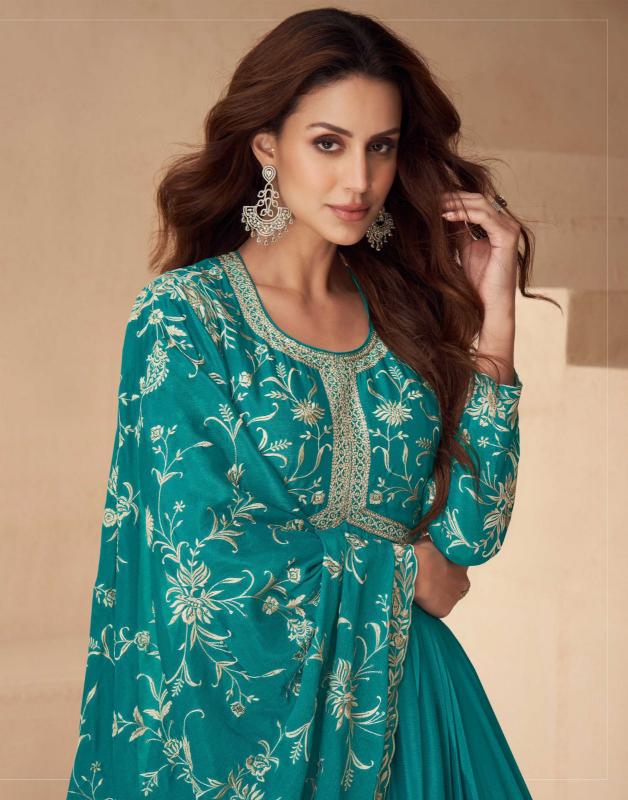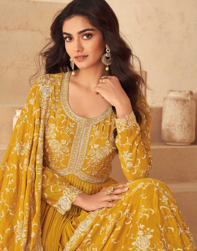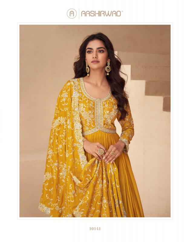 AASHIRWAD CREATION CATALOGUE : KESARIYA TOP-CHINNON SILK (free size stitch ) Price - 2595 per pcs |