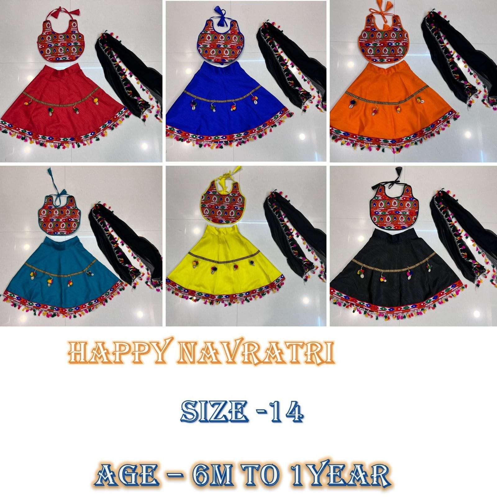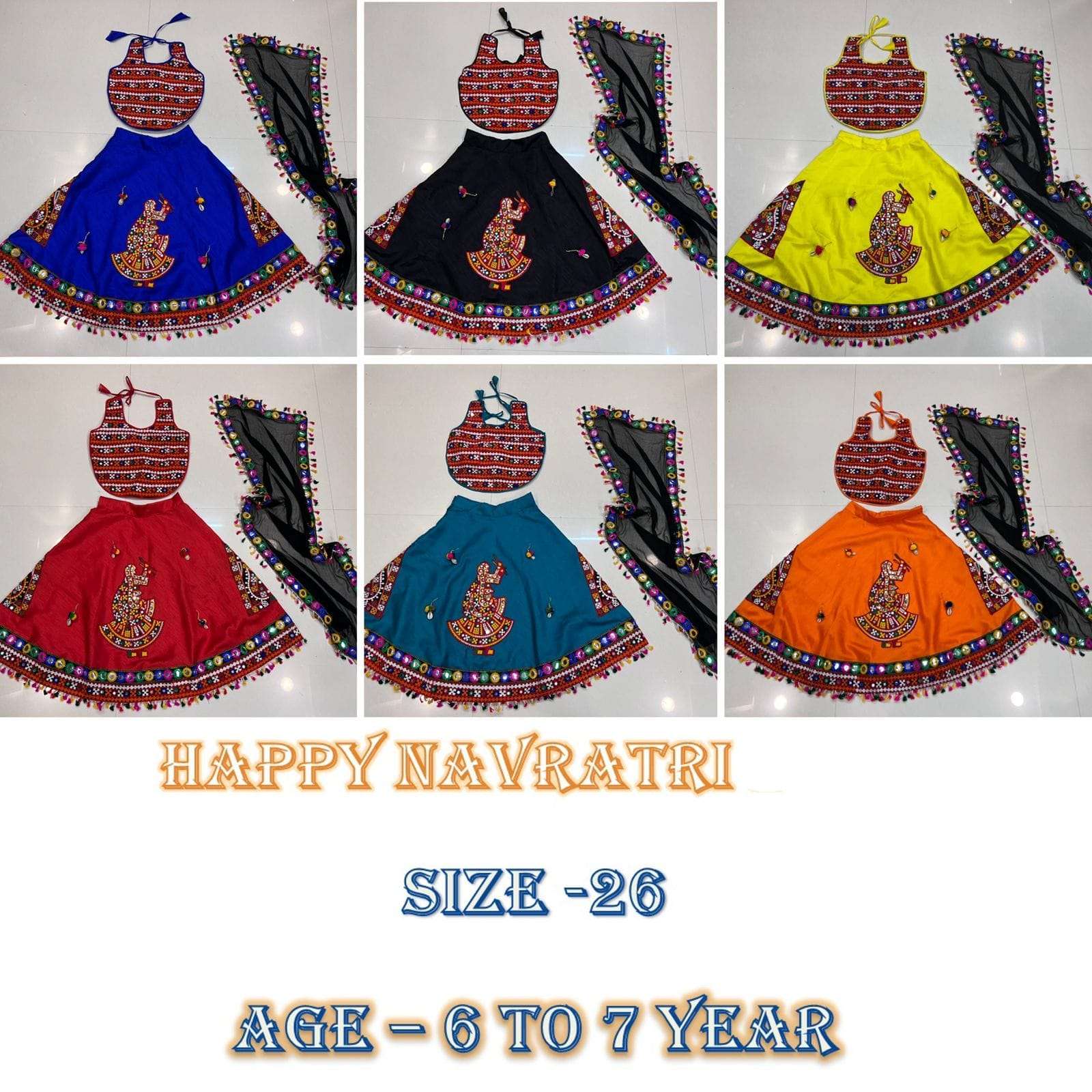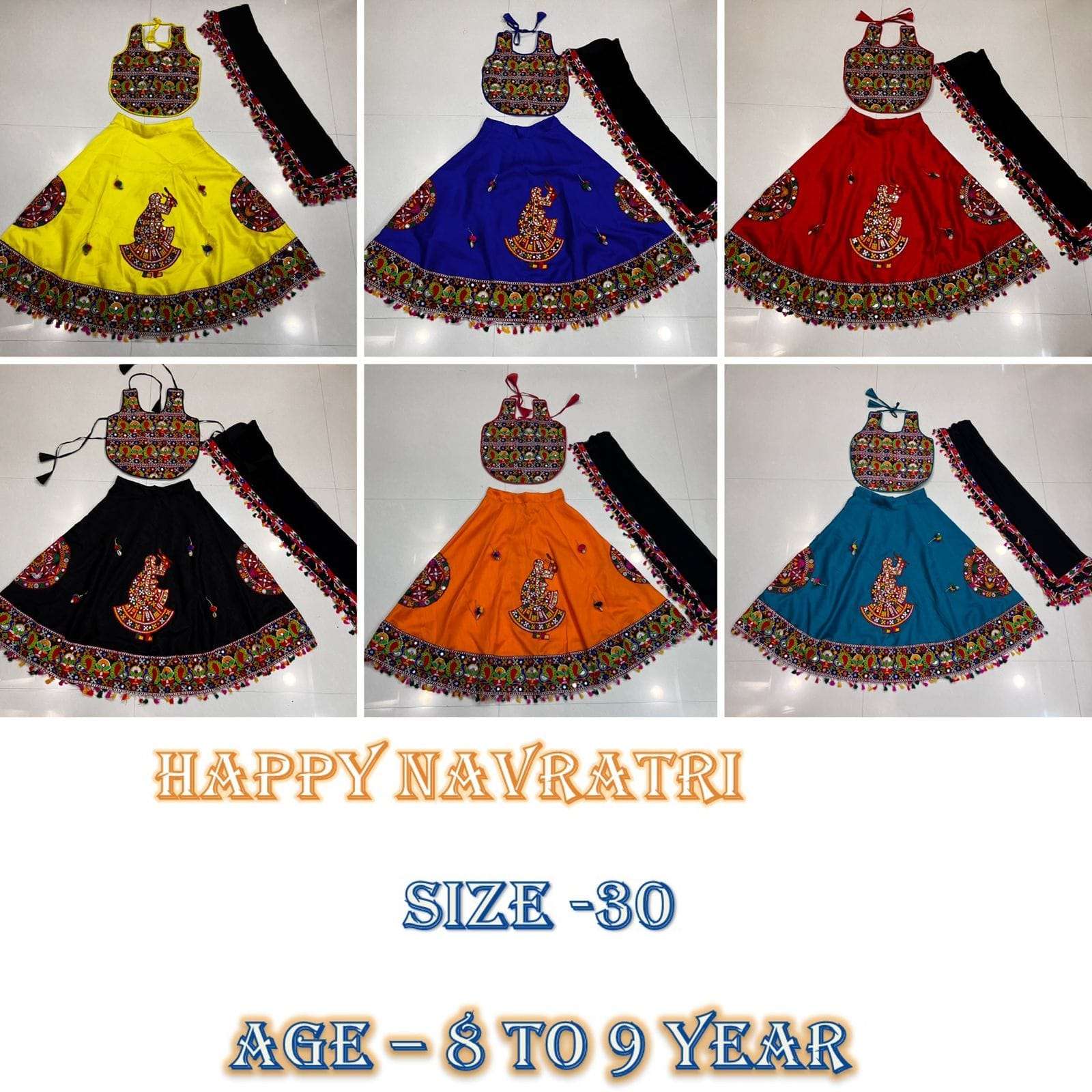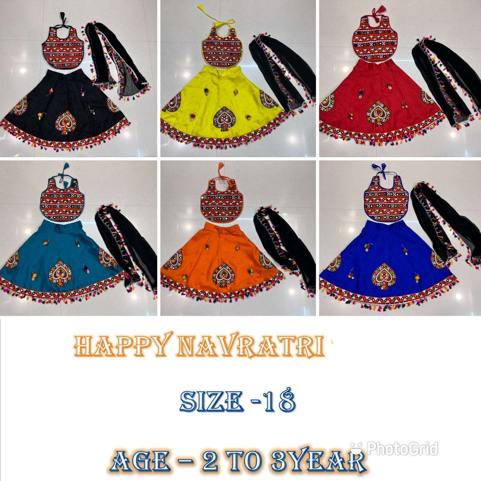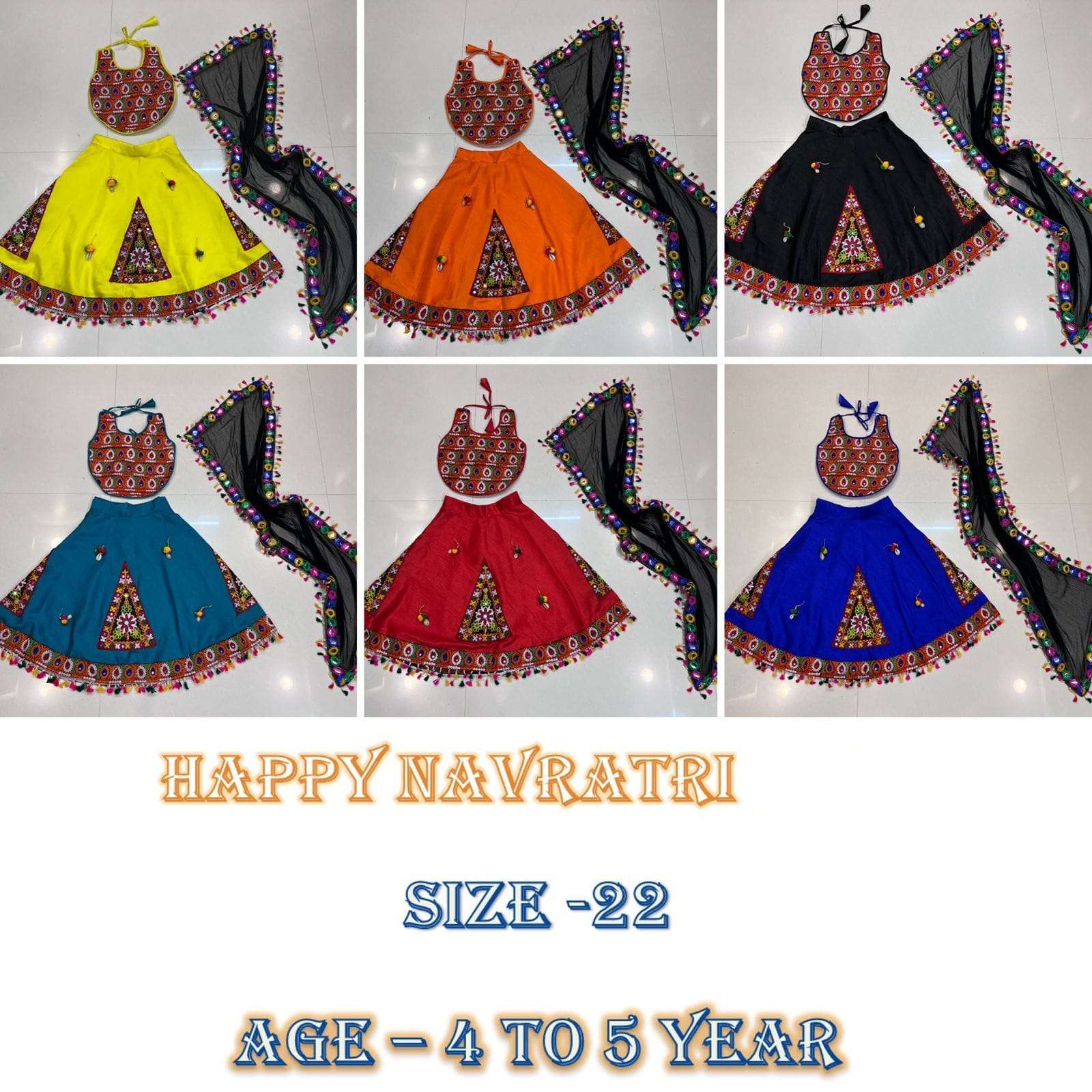 KIDS SPECIAL NAVRATRI GARBA OUTFITS 2023 ➡NAVRATRI KIDS SPECIAL NAVRANGI KUTCHI WORK CHANIYA CHOLI WITH DUPPTA. FABRIC DETAILS 6 COLOURS AVAILABLE ALL SIZE RED, BLACK, ORANGE, ROYAL BLUE, C-GREEN, LEMON DETAILS