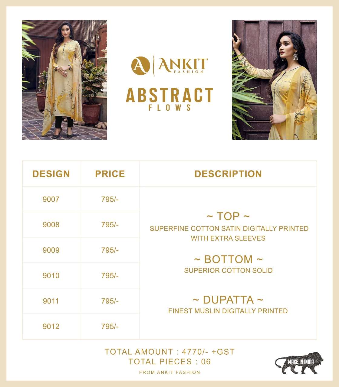 * Greetings of the day* Catalouge :- Abstract Flows Top :- superfine cotton satin Digitally printed with extra sleeves Bottom :- Superior cotton  Solid Dupatta:- Finest muslin Digitally printed Rate:- 795-/ + Gst 5% Warm Regards Ankit Fashion |