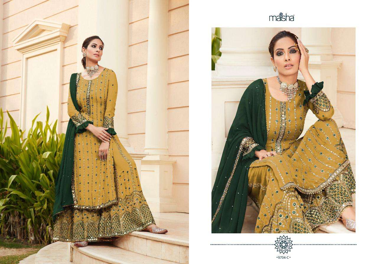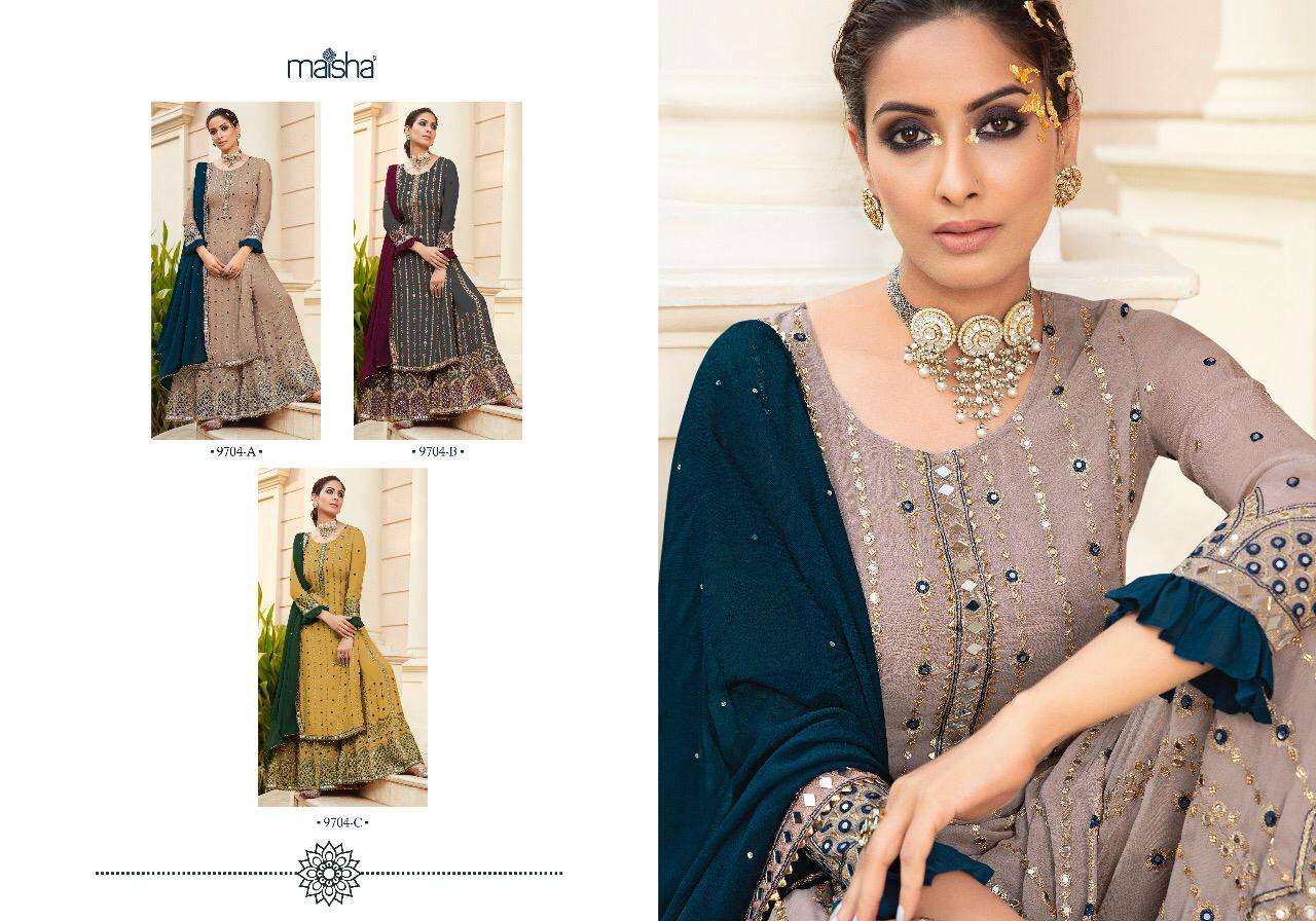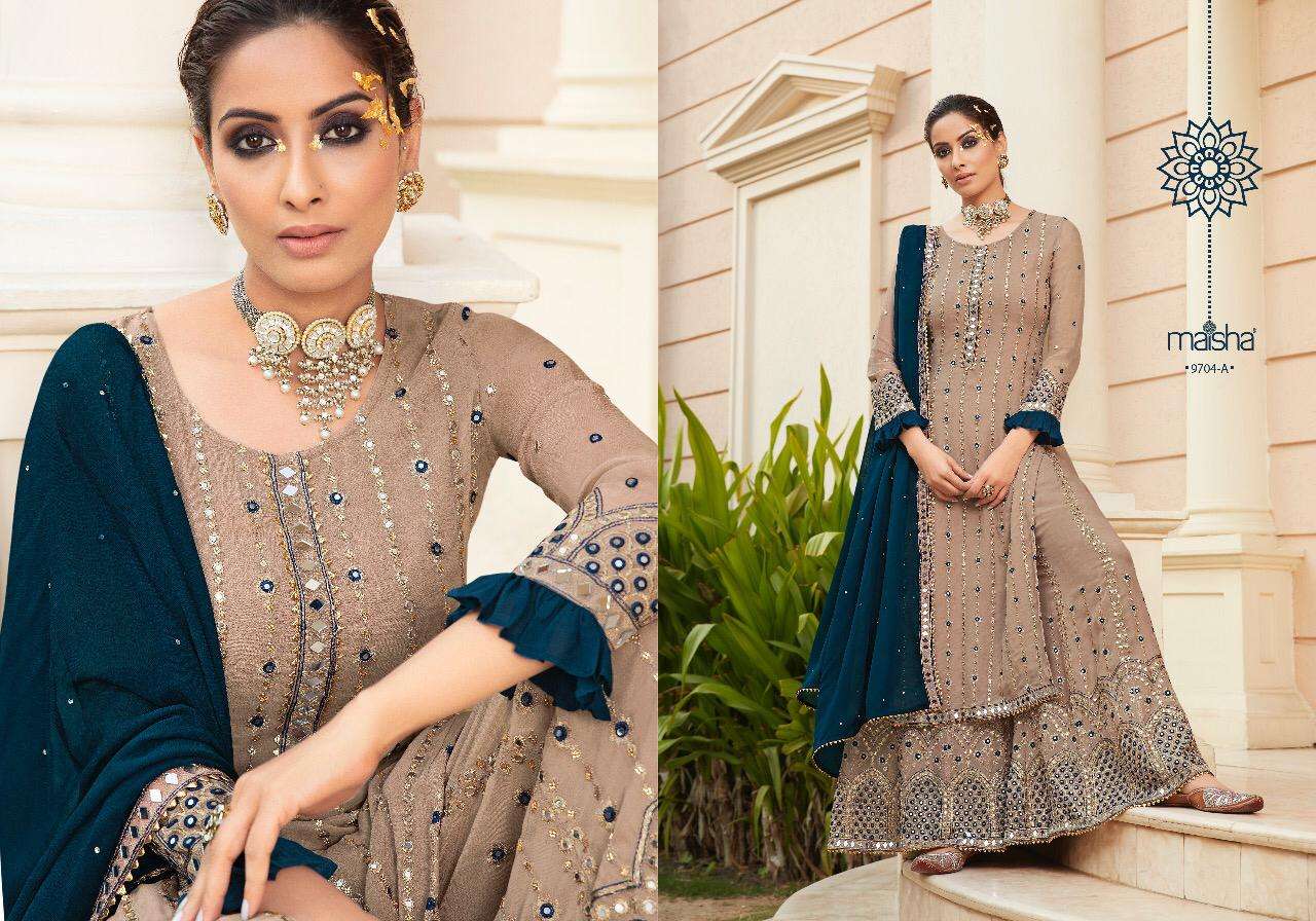 "maisha" ADDICTION VOL 1 âbeutyfull collours of super hit design *fine  georgett with fine georgett dhuppata * PRICE_2641/- Set to set . Delivery next week . * GST 12 Percent Extra * Top     - *fine pure georgett  with beautiful mirrorwork with  heavy emboidery and handwork * Bottom -georgett with mirrorwork emboidery and handwork.. Inner Bottom. -shantoon Inner top - *shantoon * Dhuppata -*georgett with beutyfull handwork And mirrorwork*  Regards Ss fashion Gst 12% |