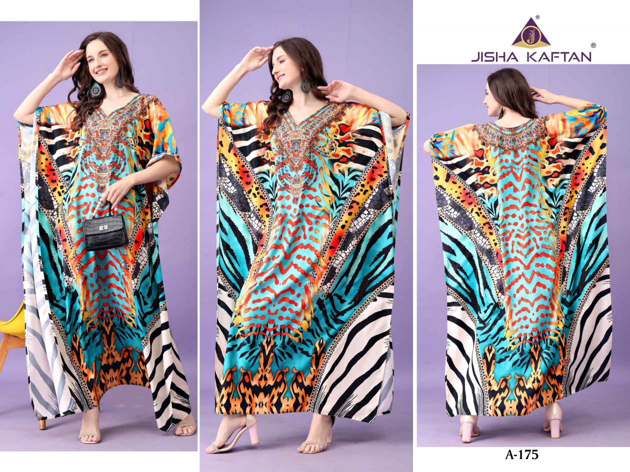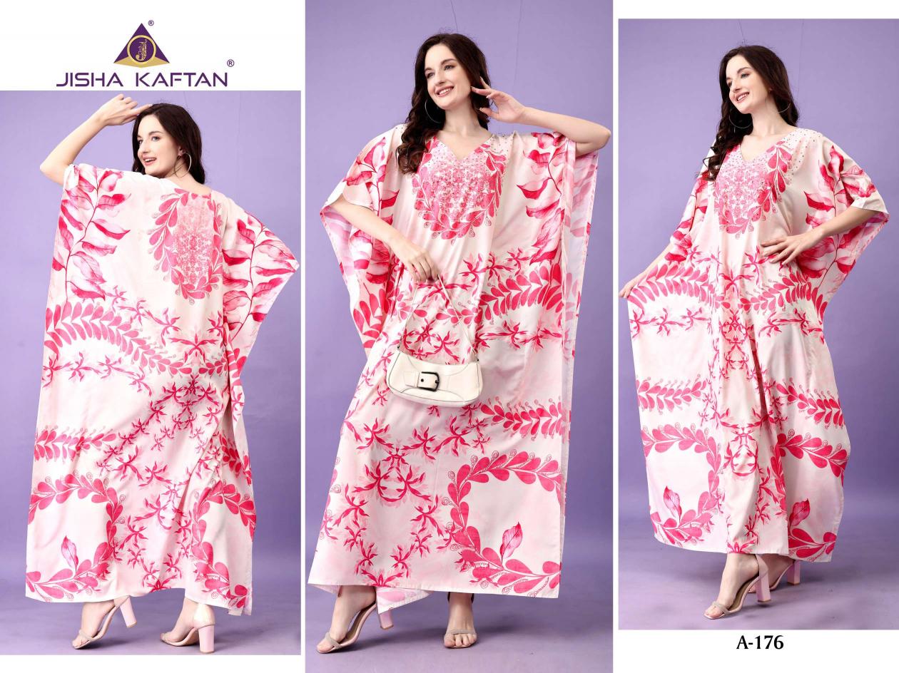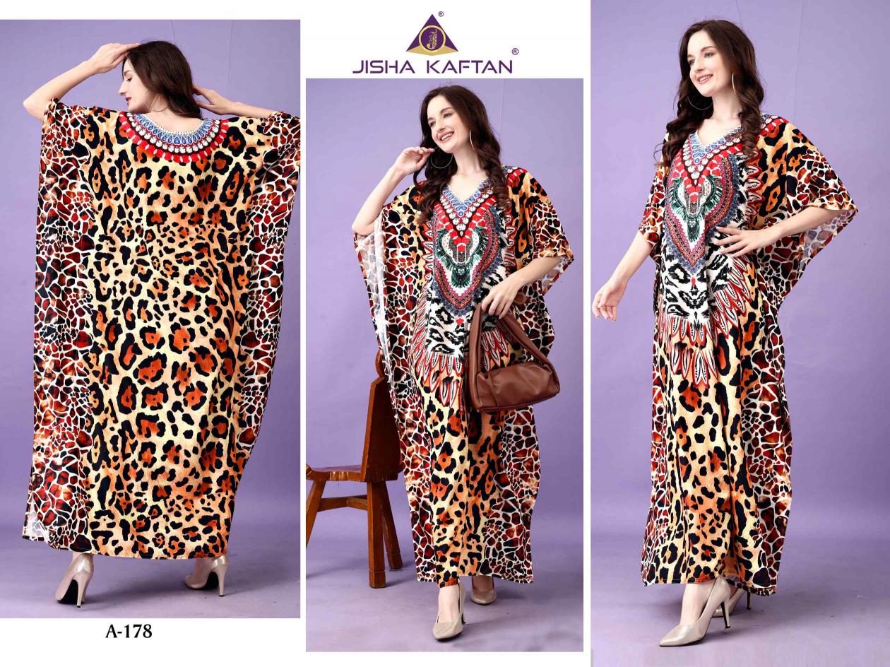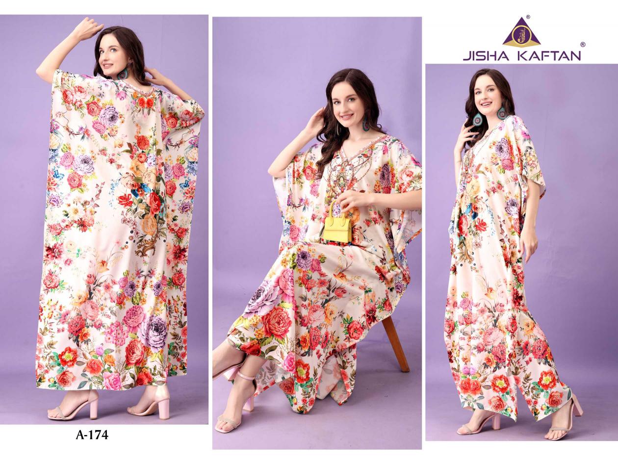 JISHA KAFTAN PRESENTS AFREEN KAFTAN VOLUME 10 Fabric - Polyester Crepe These kaftans have an extraordinary lustrous, opaque, and soft texture weaved in premium polyester Crepe fabric. Its beautiful silhouette and great fall are enhanced by the export-level digital printing on it and is available in unique designs with stone work. With a length of 57 inches and a drawstring at the waist, it empowers you to customize it to fit you perfectly. This season, grab this absolute comfortable wear and stay versatile. JISHA KAFTAN®. |