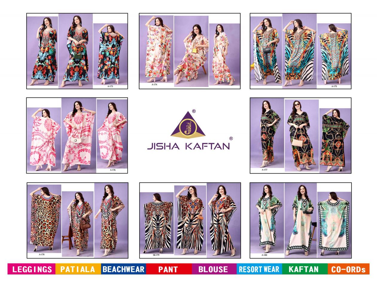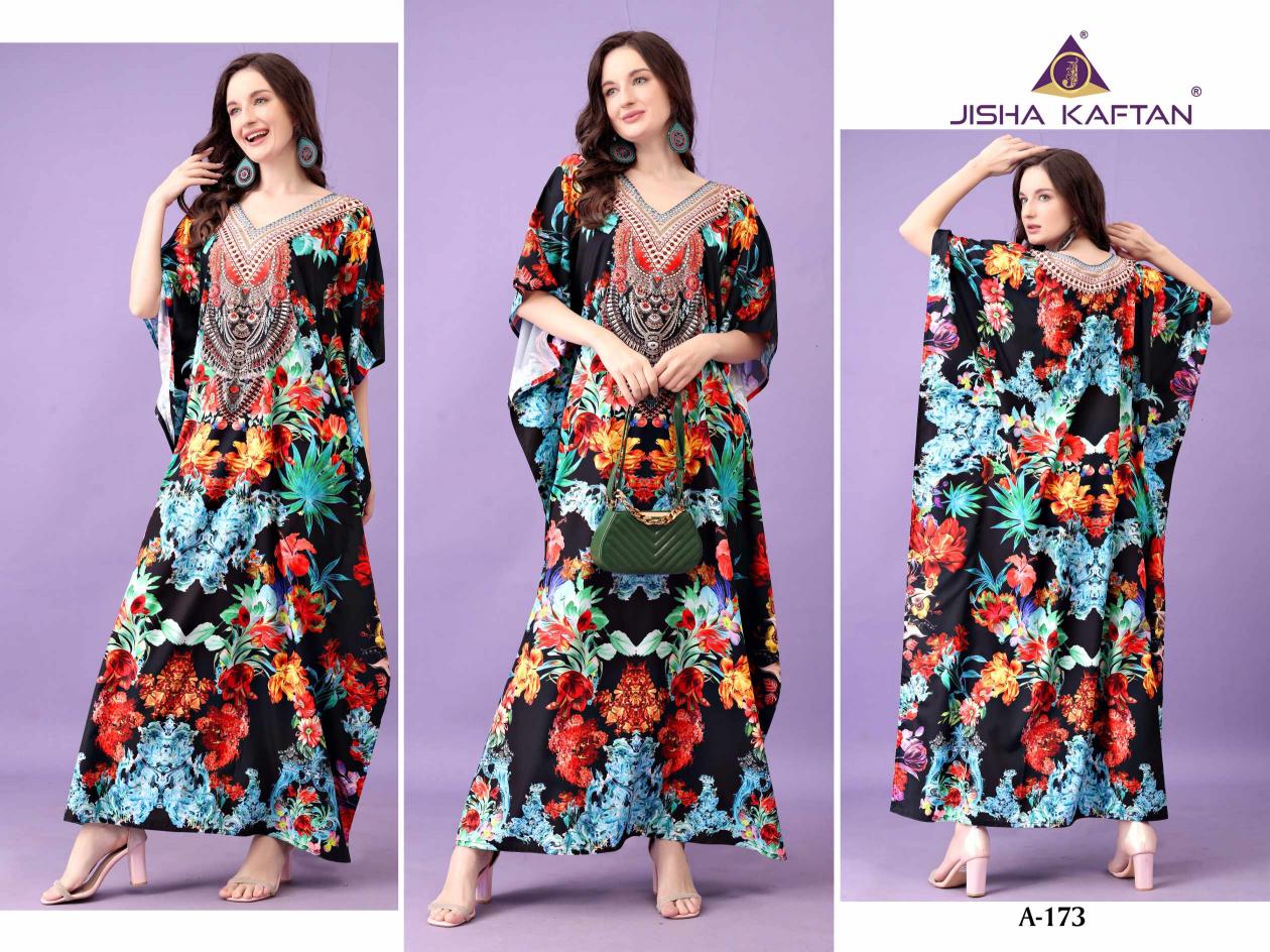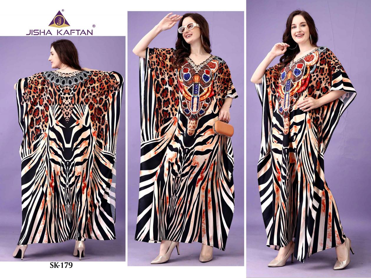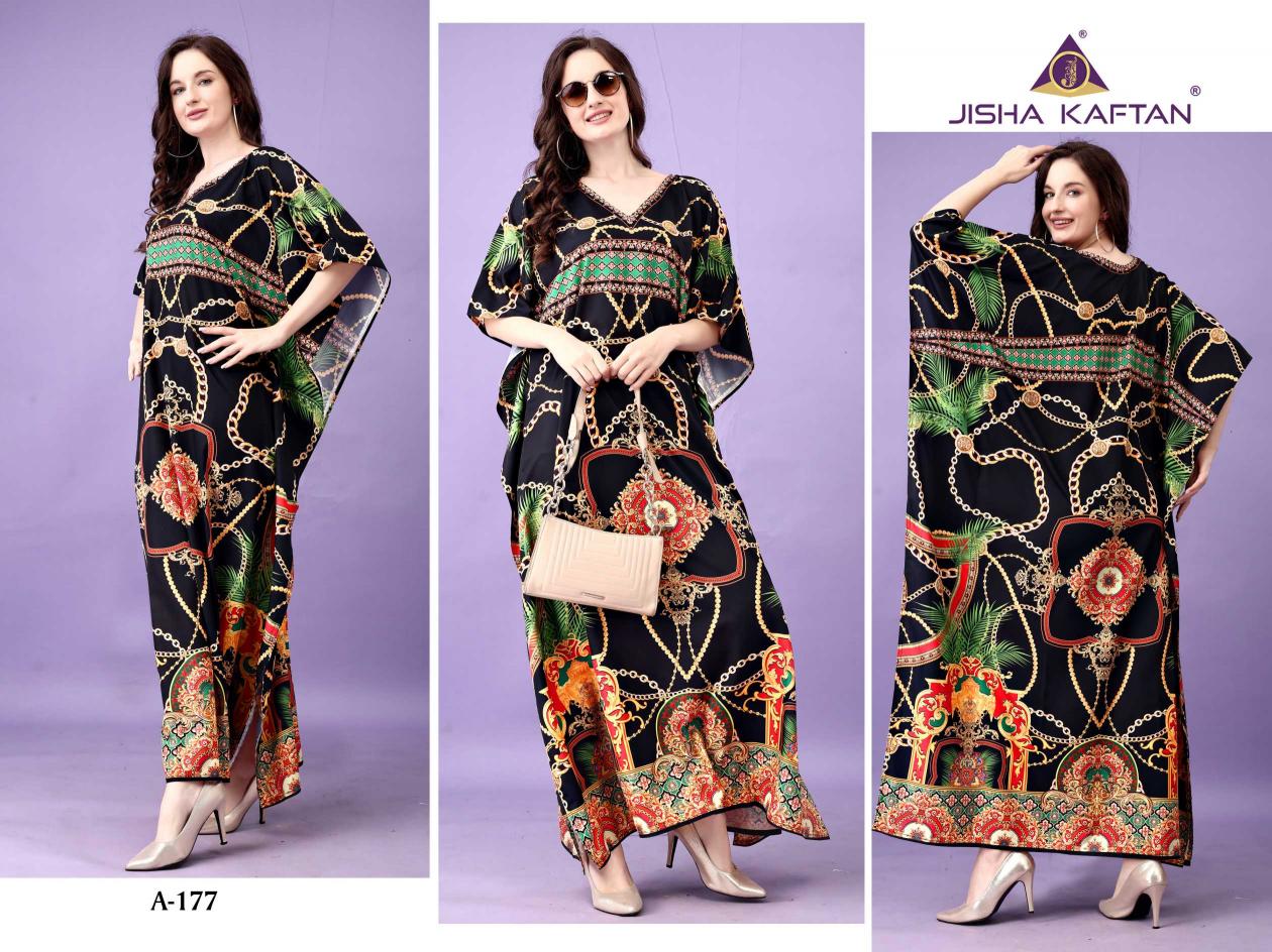 JISHA KAFTAN PRESENTS AFREEN KAFTAN VOLUME 10 Fabric - Polyester Crepe These kaftans have an extraordinary lustrous, opaque, and soft texture weaved in premium polyester Crepe fabric. Its beautiful silhouette and great fall are enhanced by the export-level digital printing on it and is available in unique designs with stone work. With a length of 57 inches and a drawstring at the waist, it empowers you to customize it to fit you perfectly. This season, grab this absolute comfortable wear and stay versatile. JISHA KAFTAN®. |