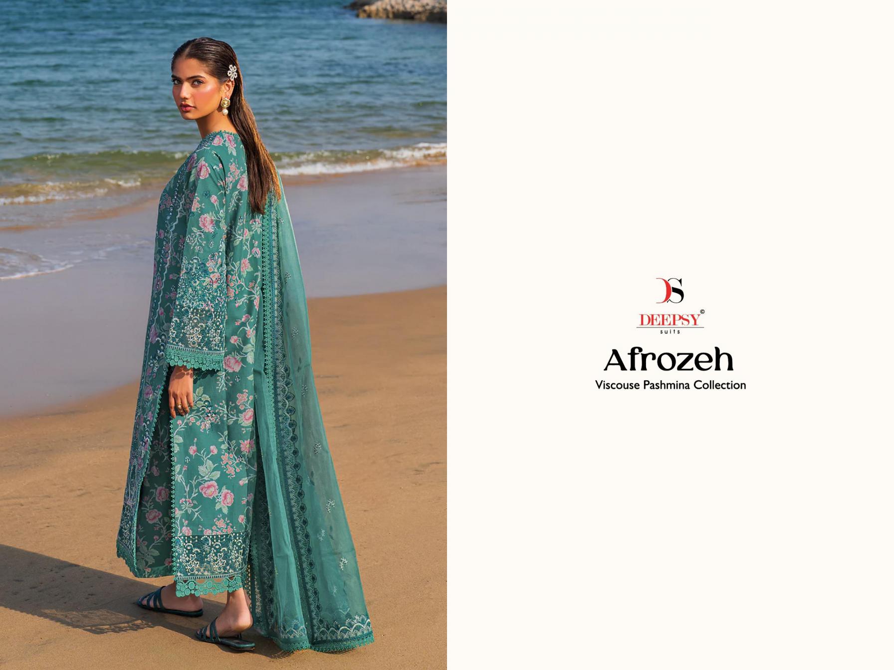 AFROZEH Viscous Pashmina collection 25 By DEEPSY SUITS Top - Pure Viscous Pashmina with heavy self emb & patches Bot - Viscose Pashmina Dup - Viscous Pashmina with embroidery Pcs: 8 *Rate - 1250+Gst Splendid Quality With Digitally Printed Fabric Quilted Fabric Used For best quality results |