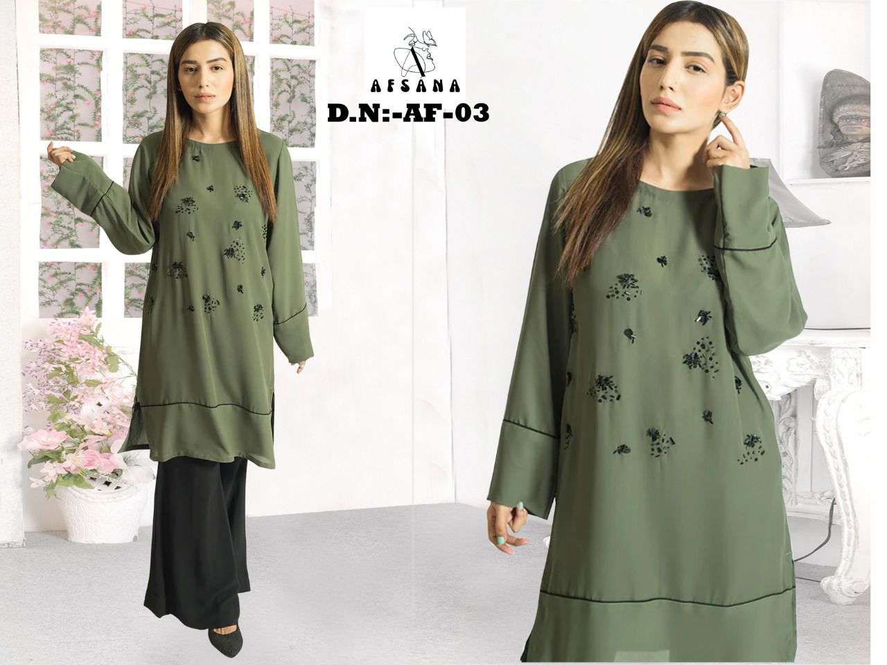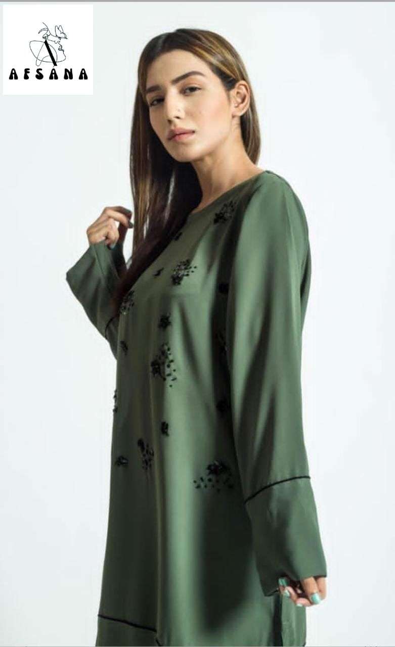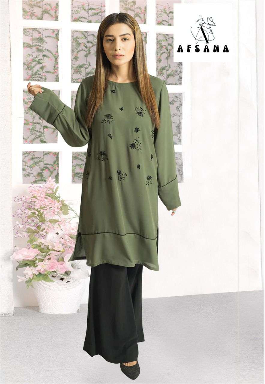 AF 03 We are Introducing our LUXURY PRET FORMAL WEAR COLLECTION To Make You Unique and Classy.. Product Description This top made in soft JORJET long sleeves in medium length with side slit. Garment is paired with black bell bottoms to complete the Look! Color: Green |