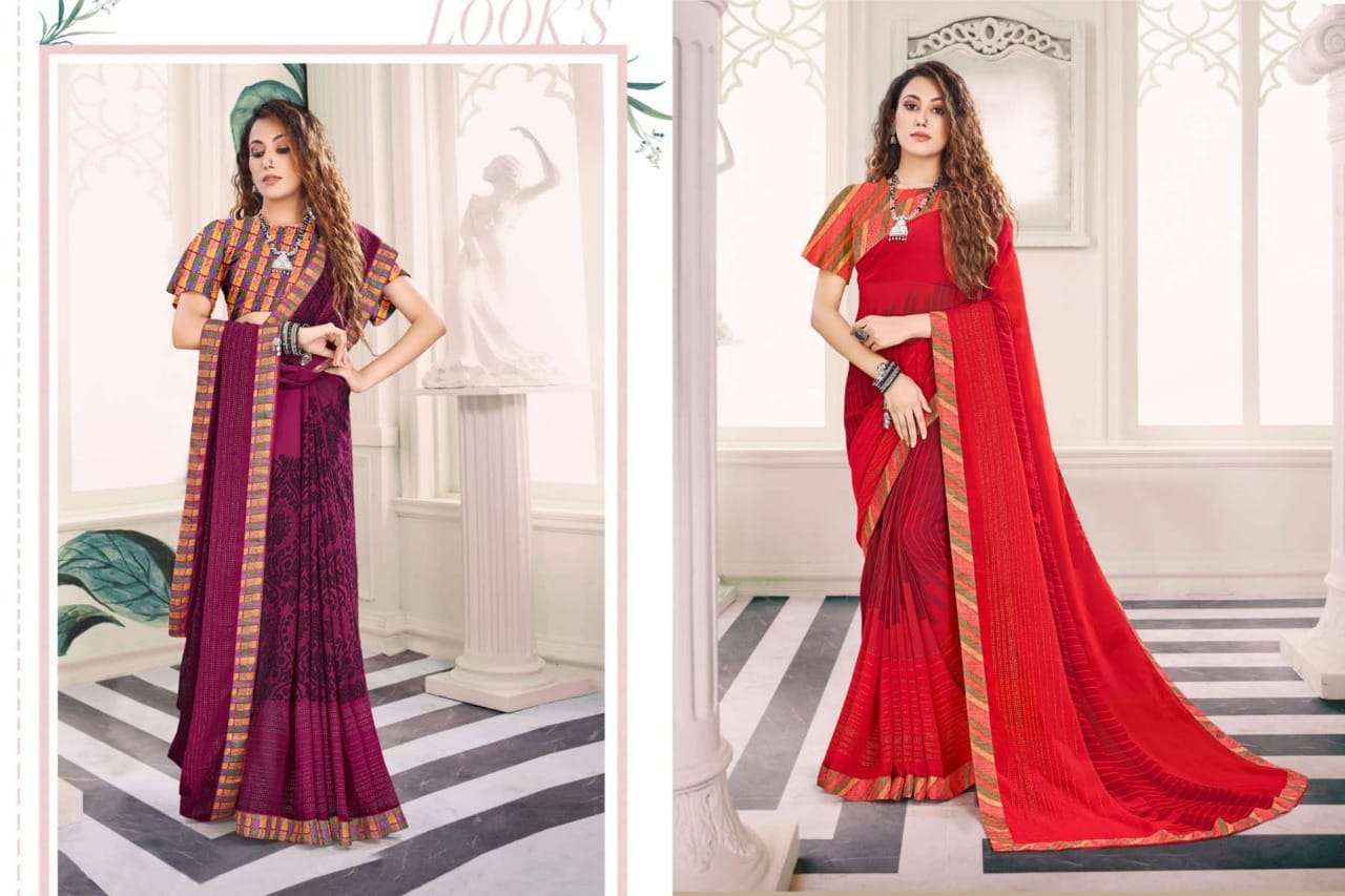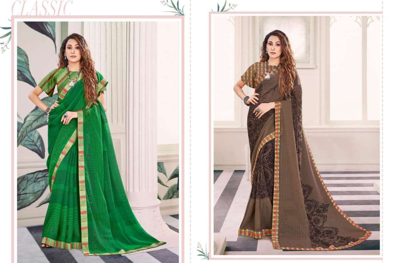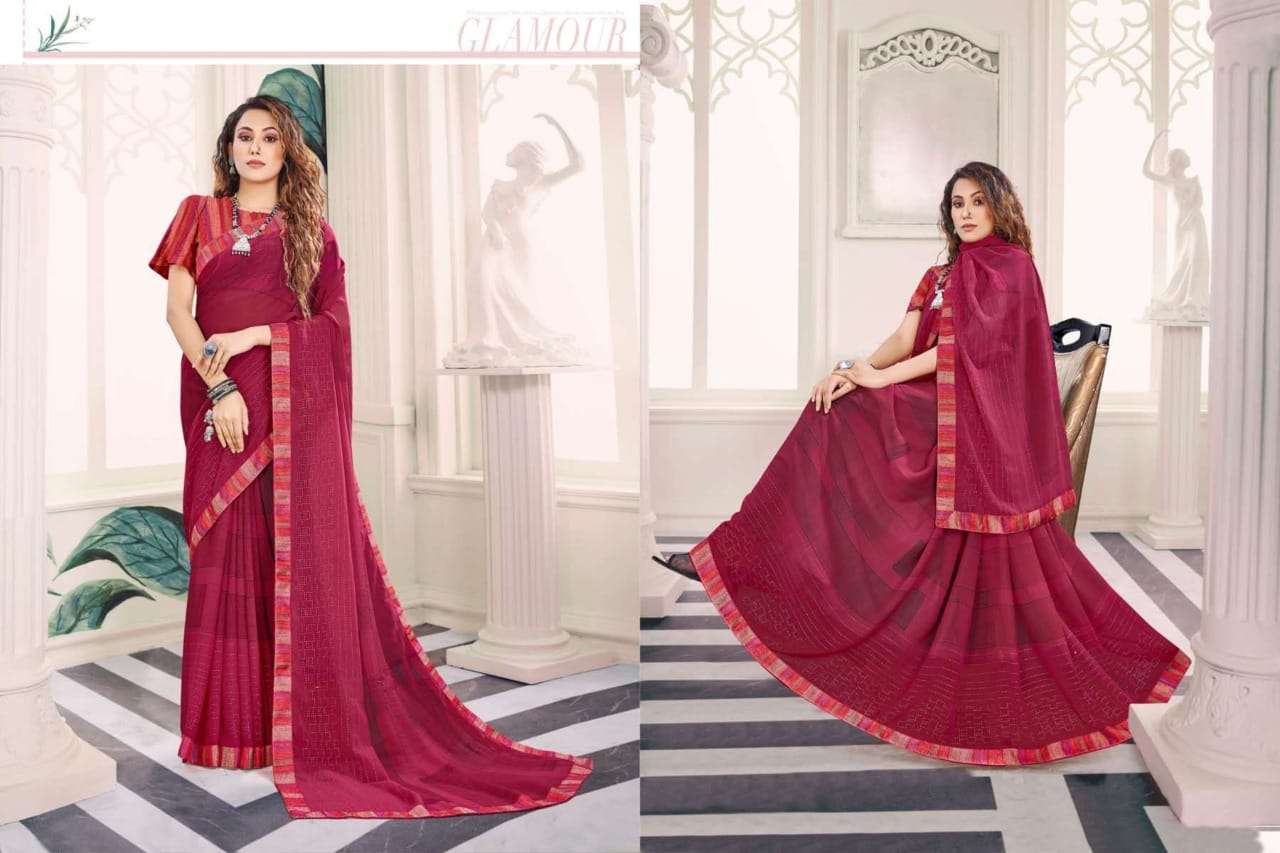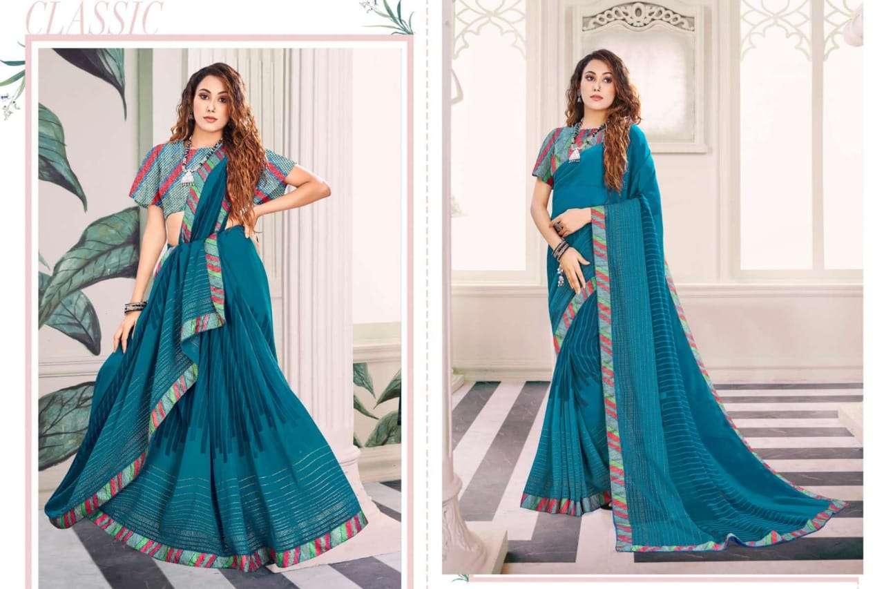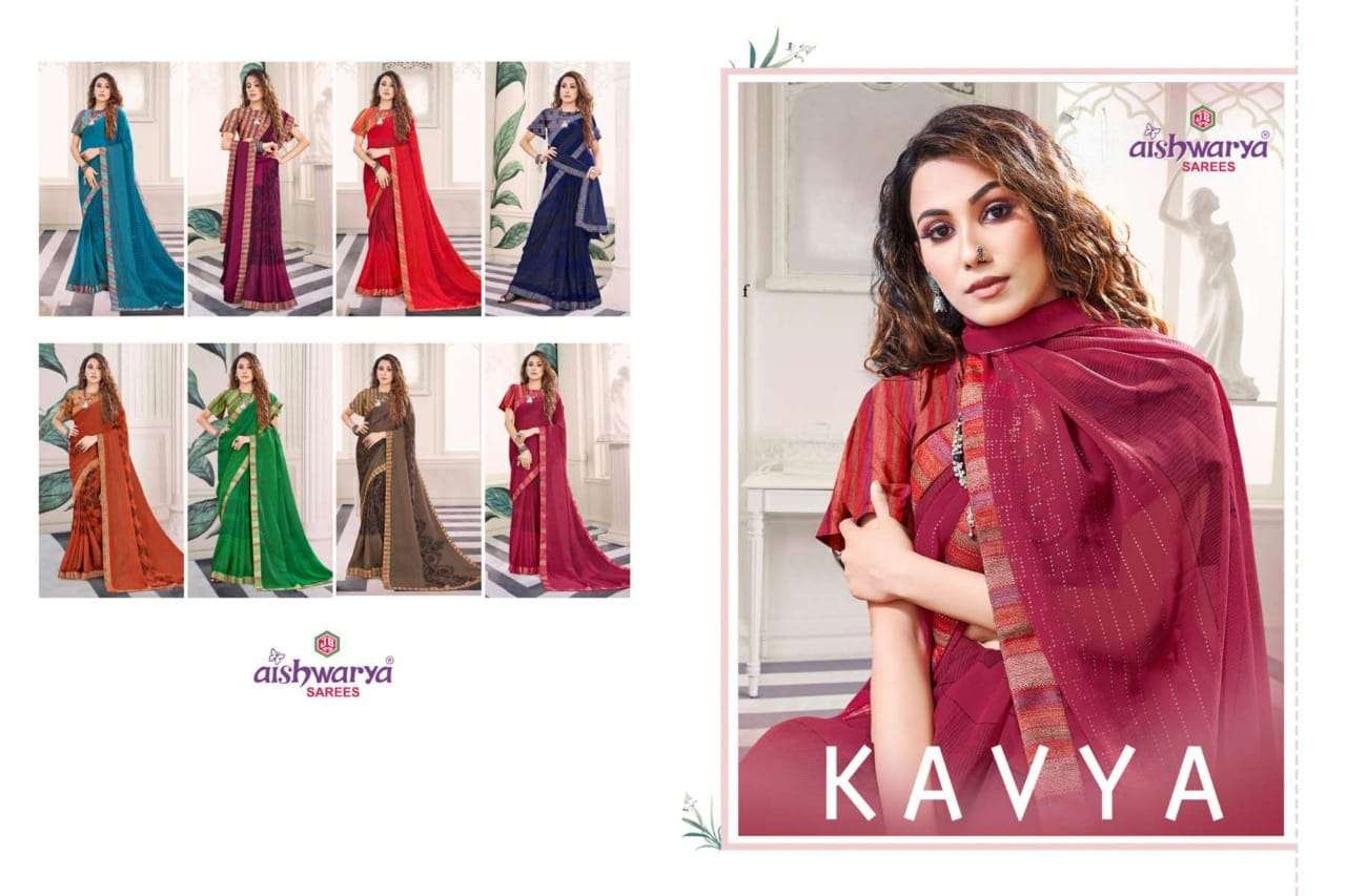 Brand - Aishwarya. *KAVYA * FABRIC - WEIGHTLESS FOIL WITH FANCY LACE AND BLOUSE RATE - 460 per pcs . Set to set GST 5 Percent Extra |
