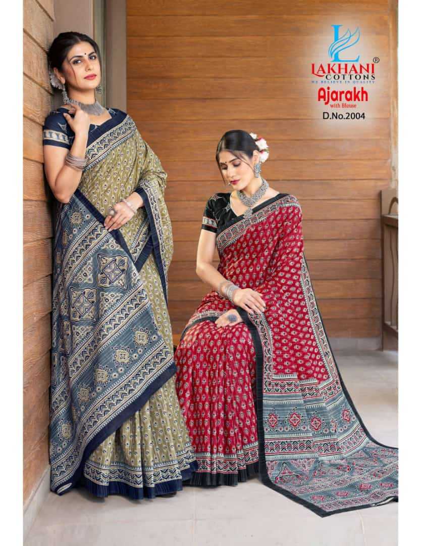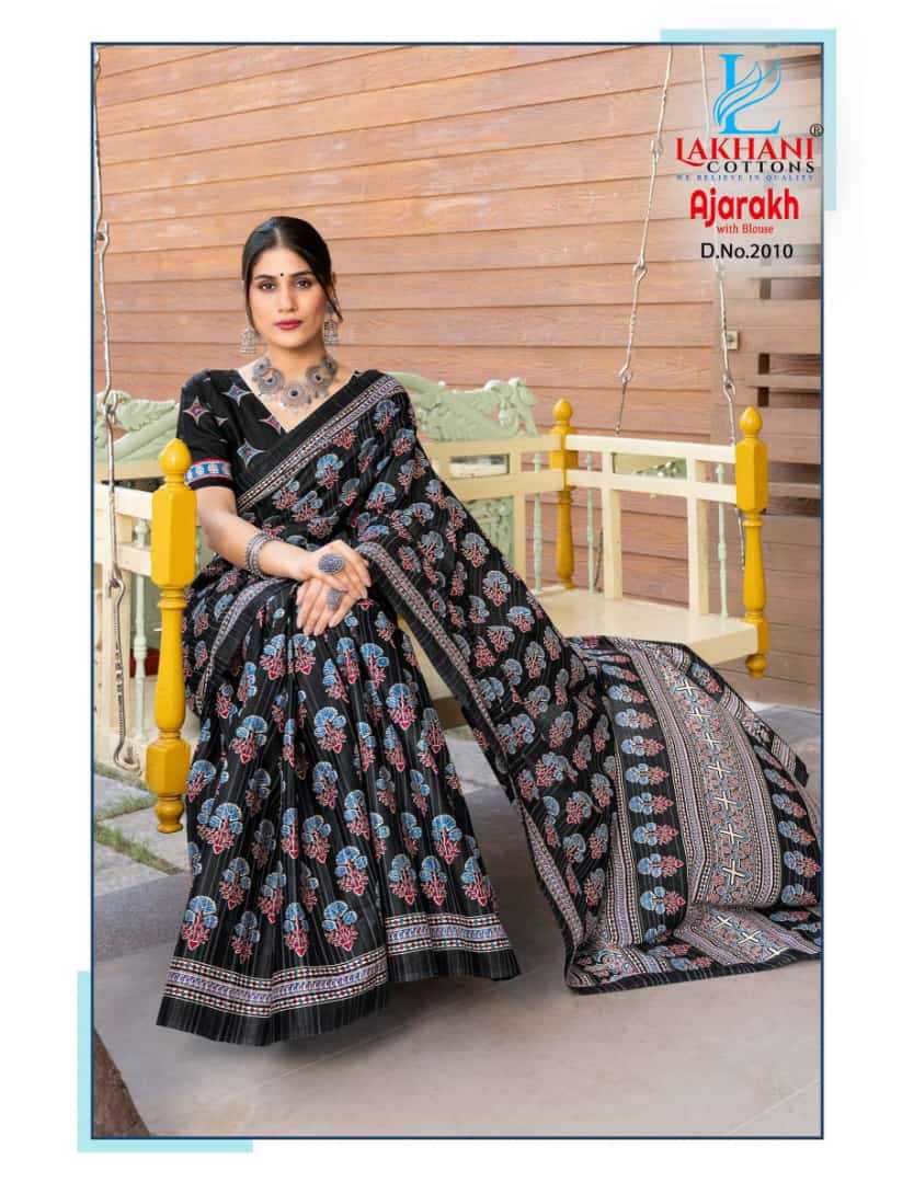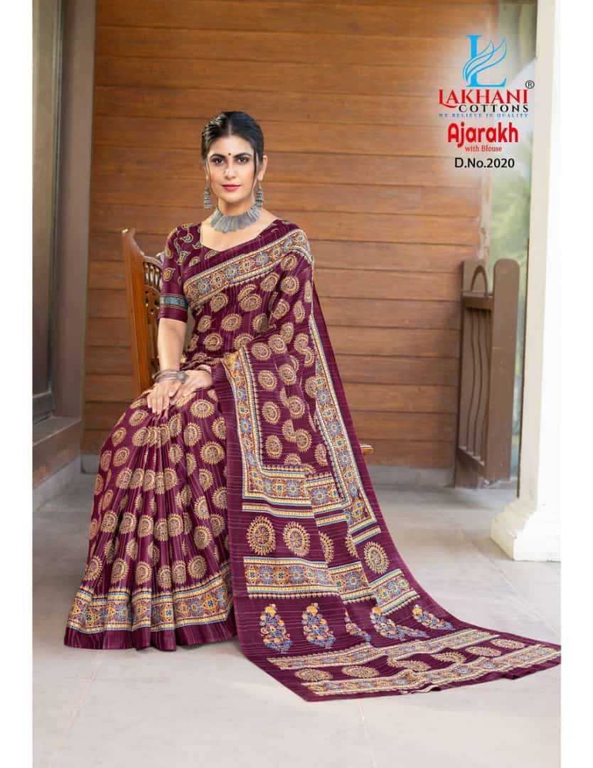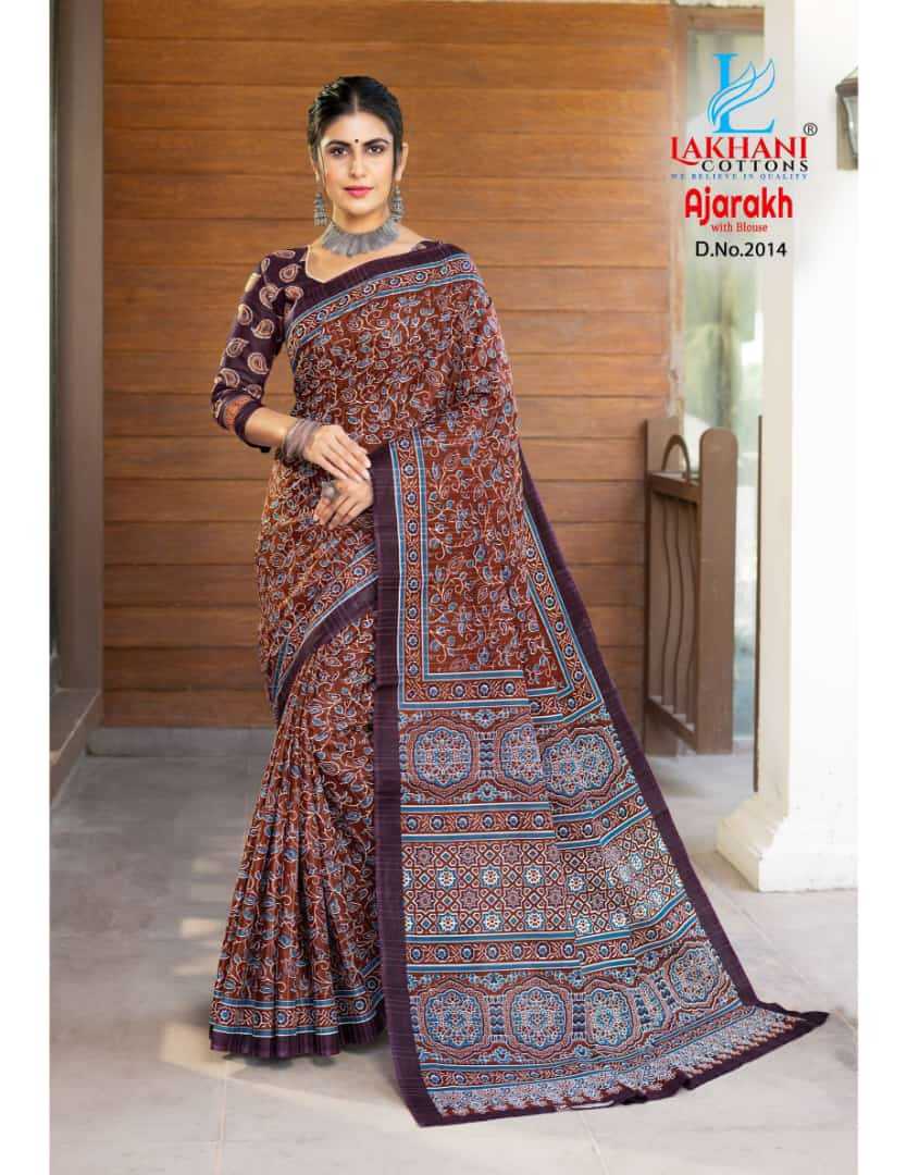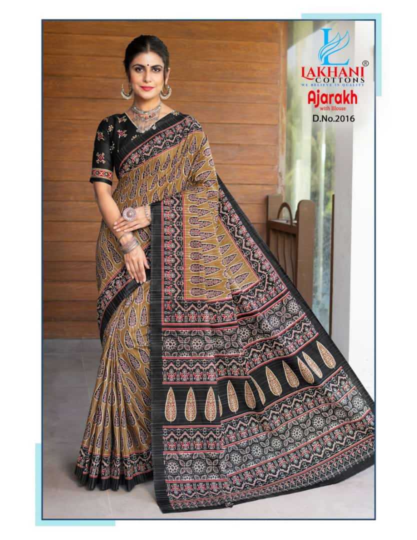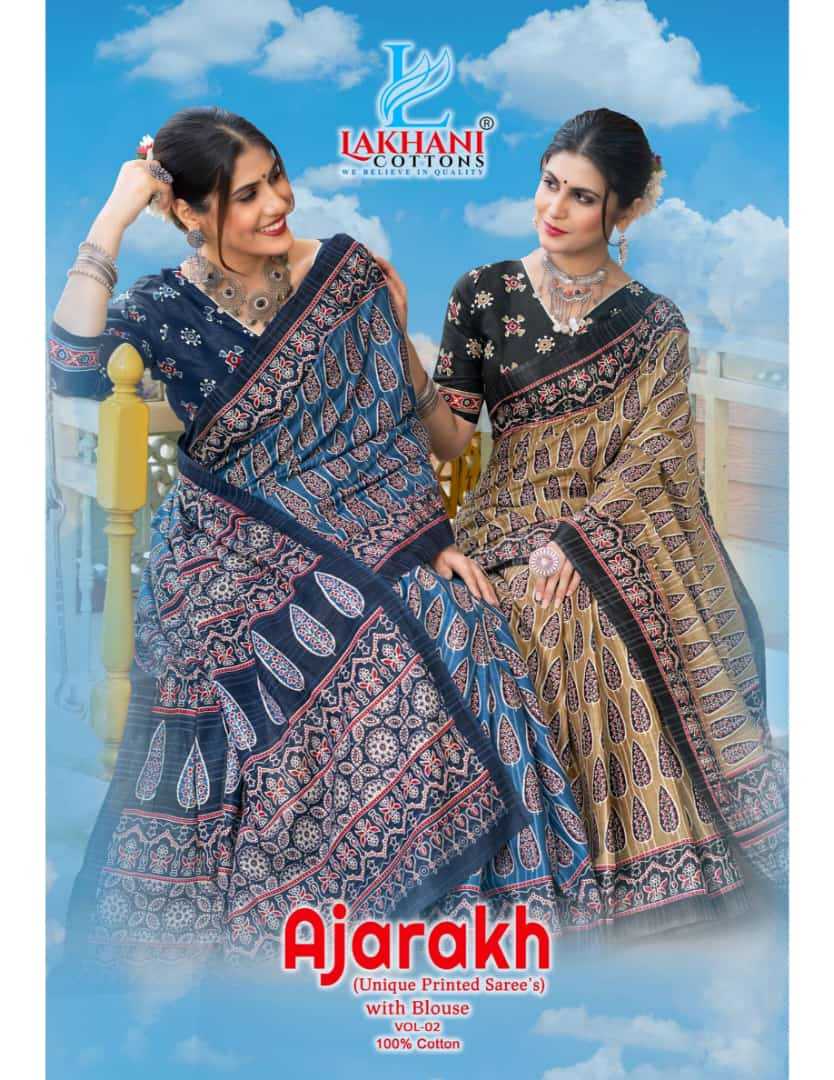 LAKHANI COTTON AJARAKH VOL 2 PURE COTTON MALAI COTTON SAREE WITH BLOUSE PCS :- 20 |