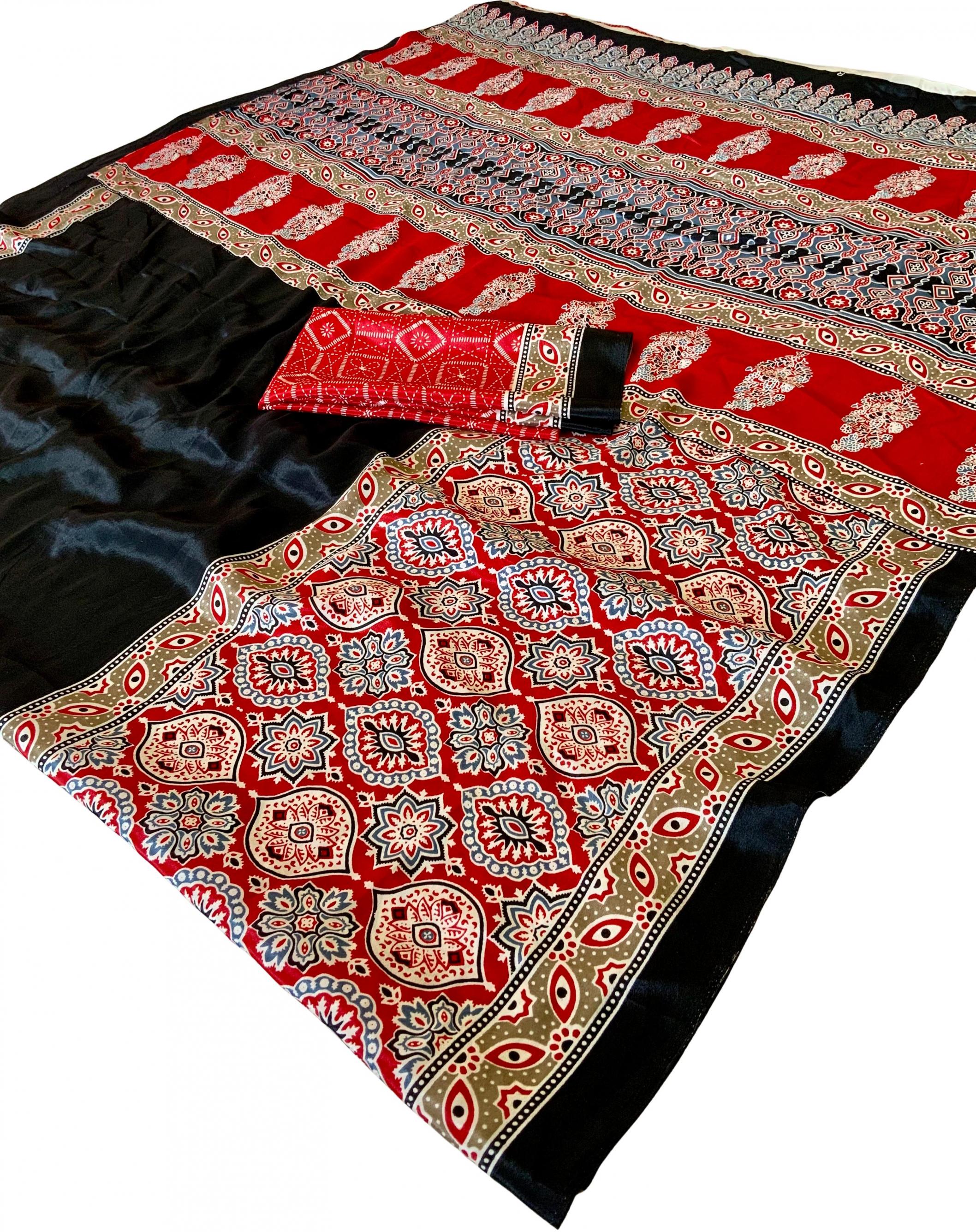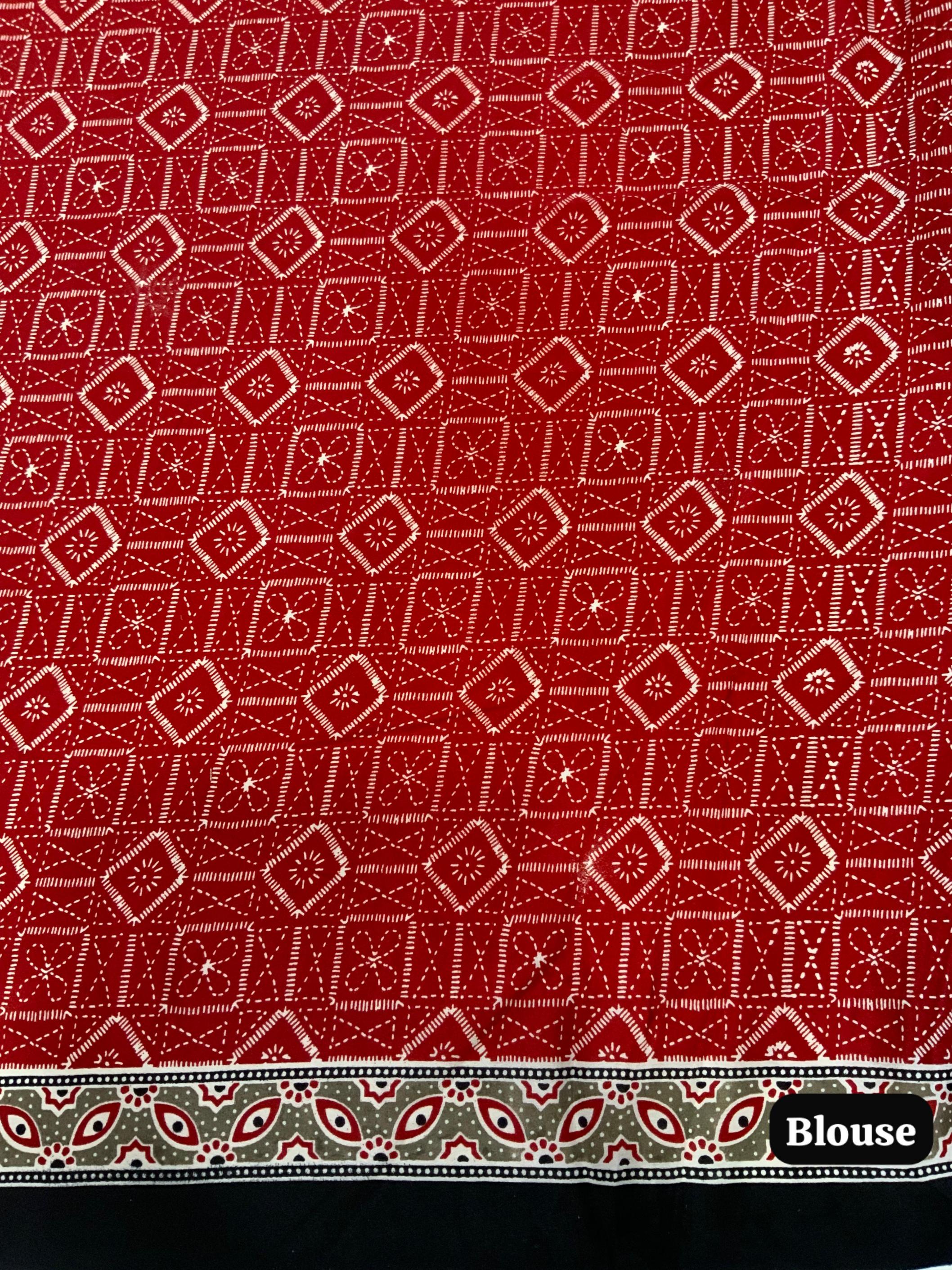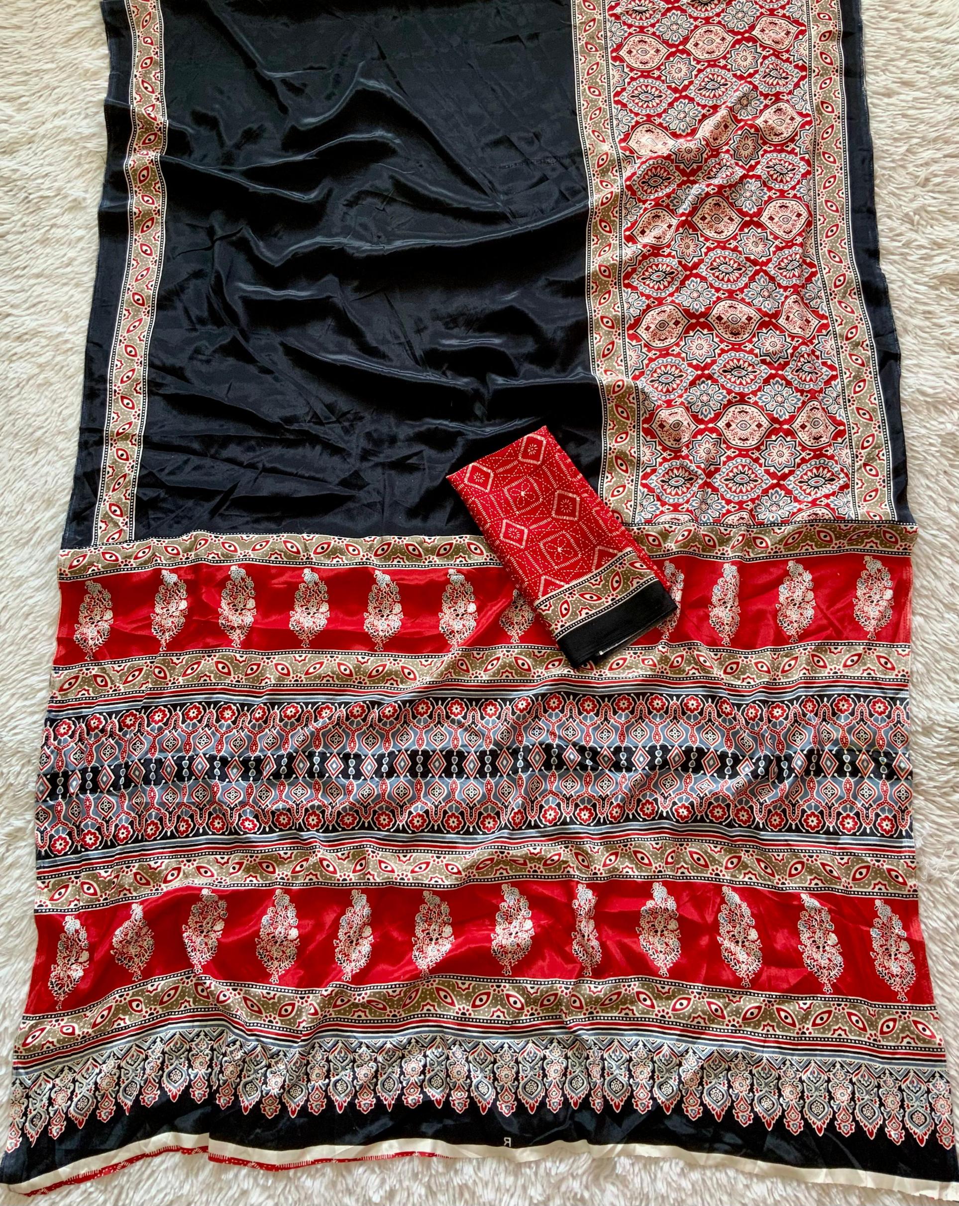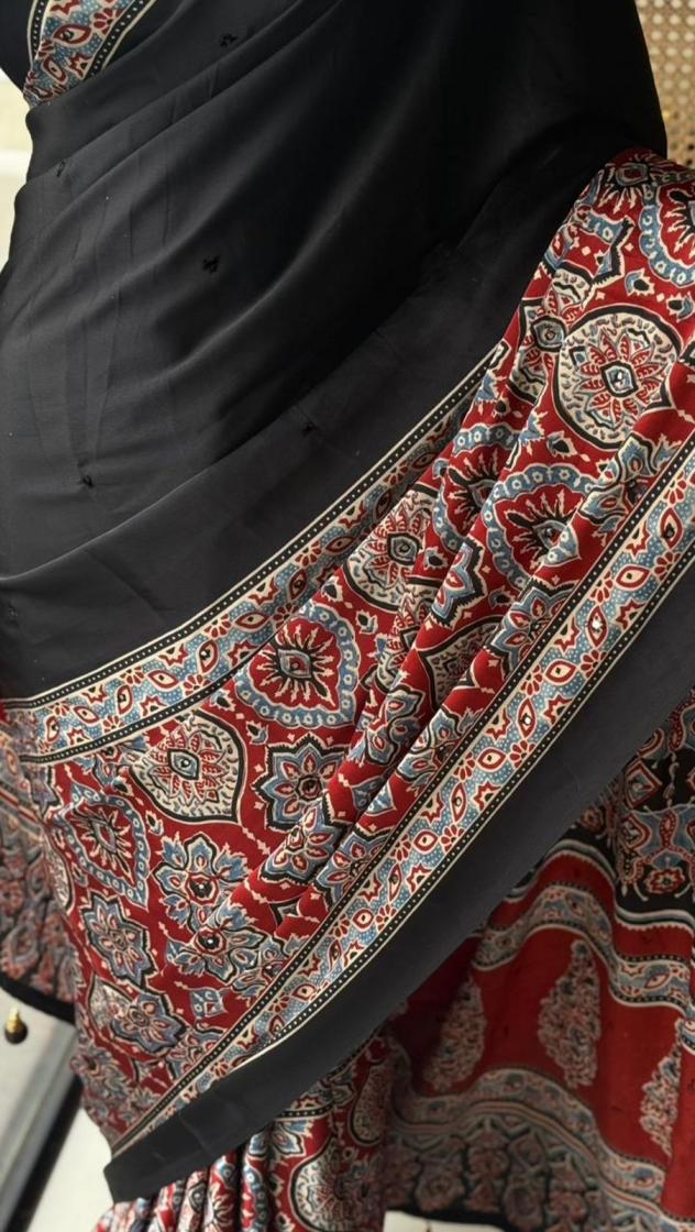 AND - Ajarakhi Quality - Premium Crape Silk Saree, Ajrakh Gala Design All Over. Ajarkh Style Print Design. Blouse - Printed Running Crepe Silk Blouse. Rate - 600+ship Full length 6.30 meters. Top Trusted Quality. |