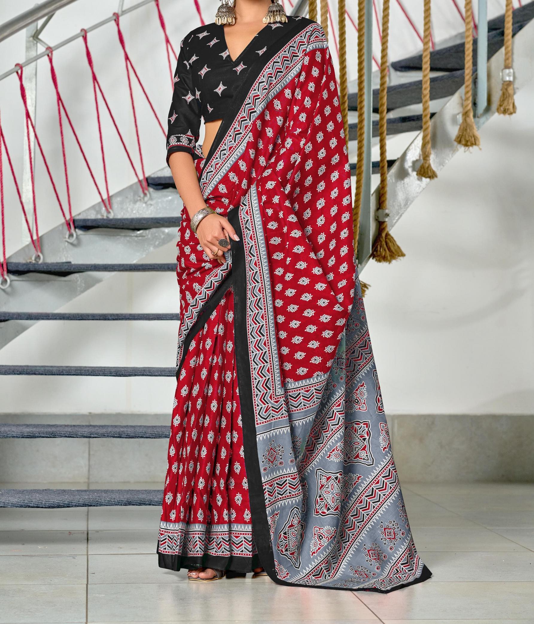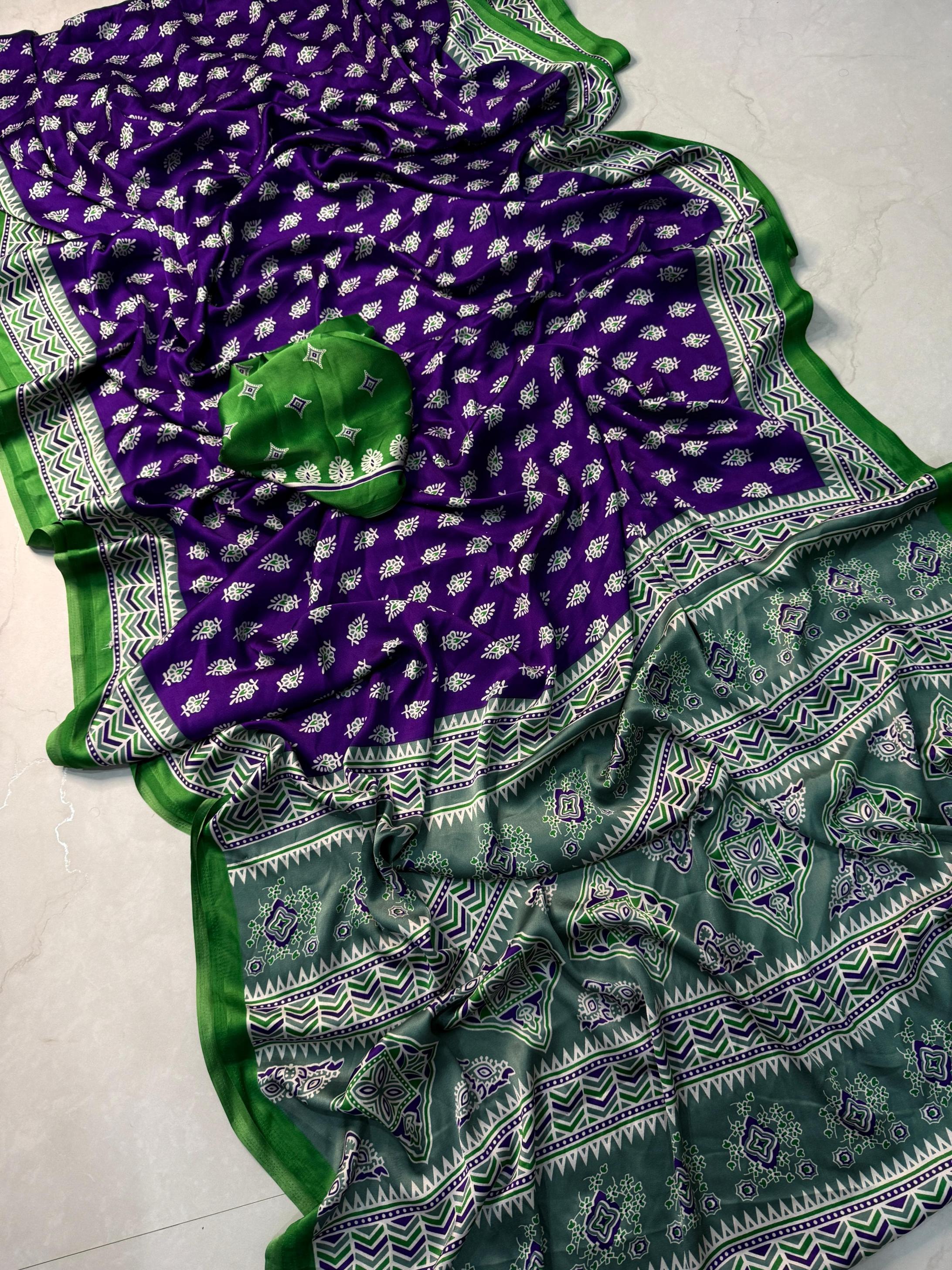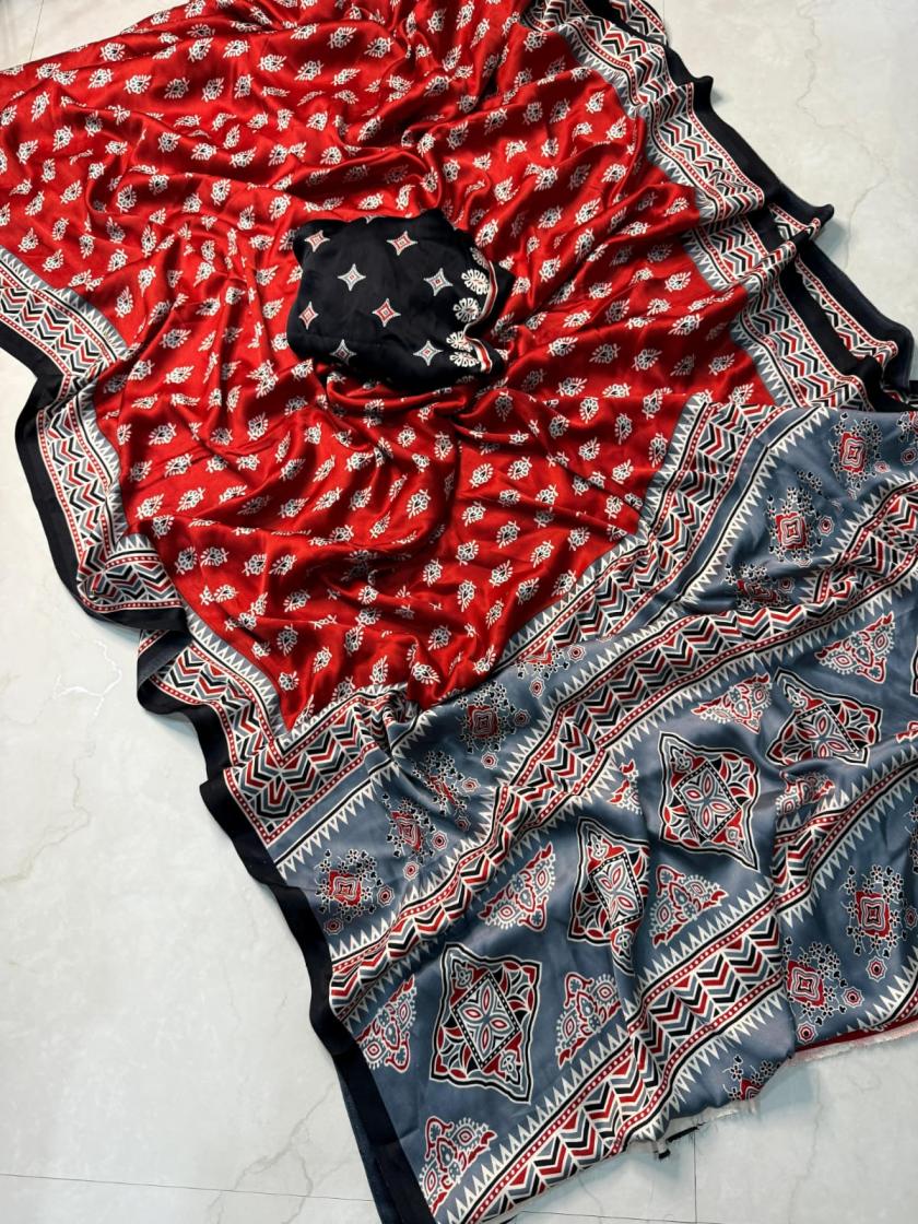 New Arrivals AND- Ajrakh-2 Quality - Premium Crape Silk Saree, Ajrakh Design All Over. Ajarkh Style Print Design. Blouse - Separate Prints Running Crepe Silk Blouse. Rate - 600+ship Top Trusted Quality |