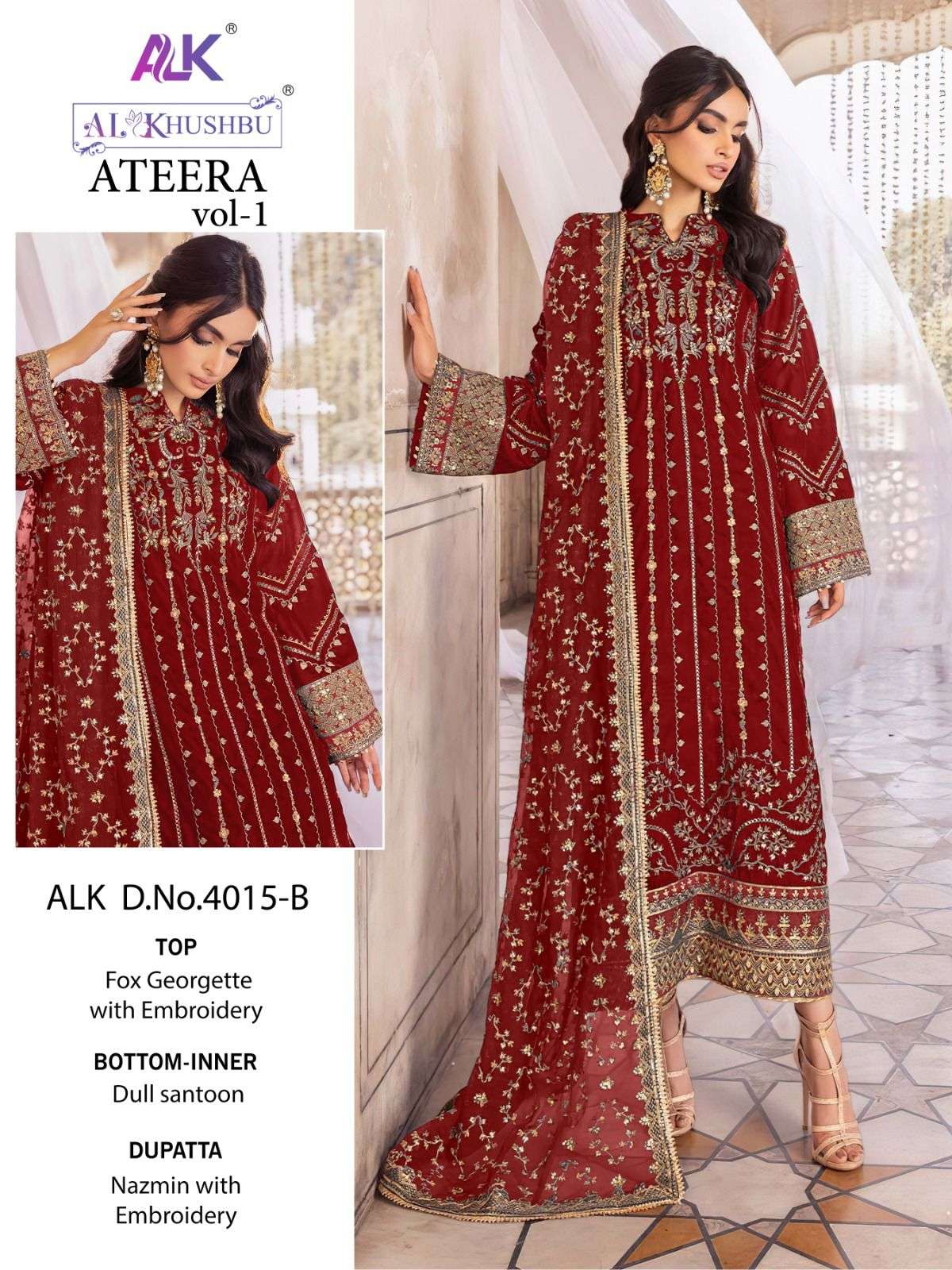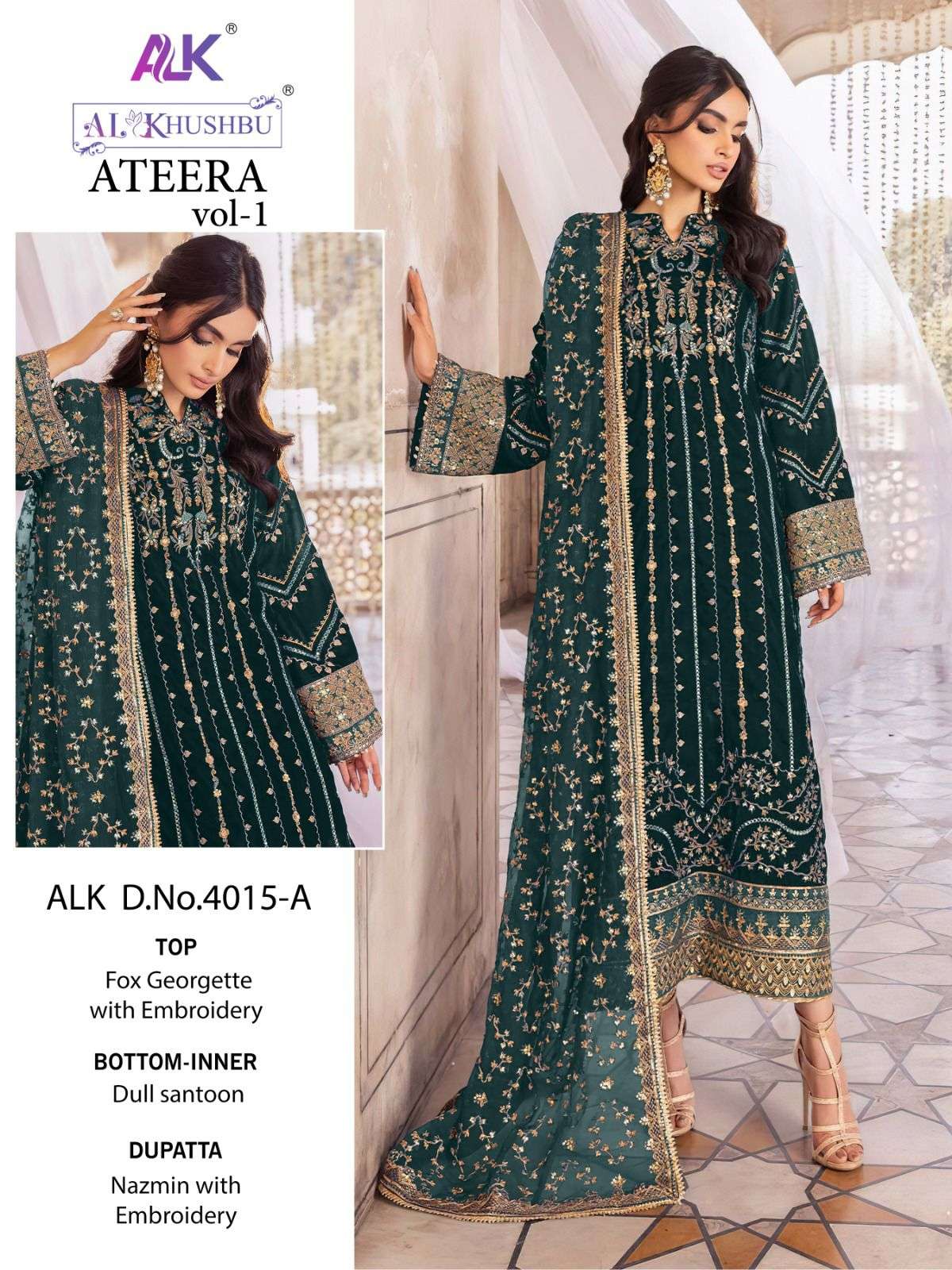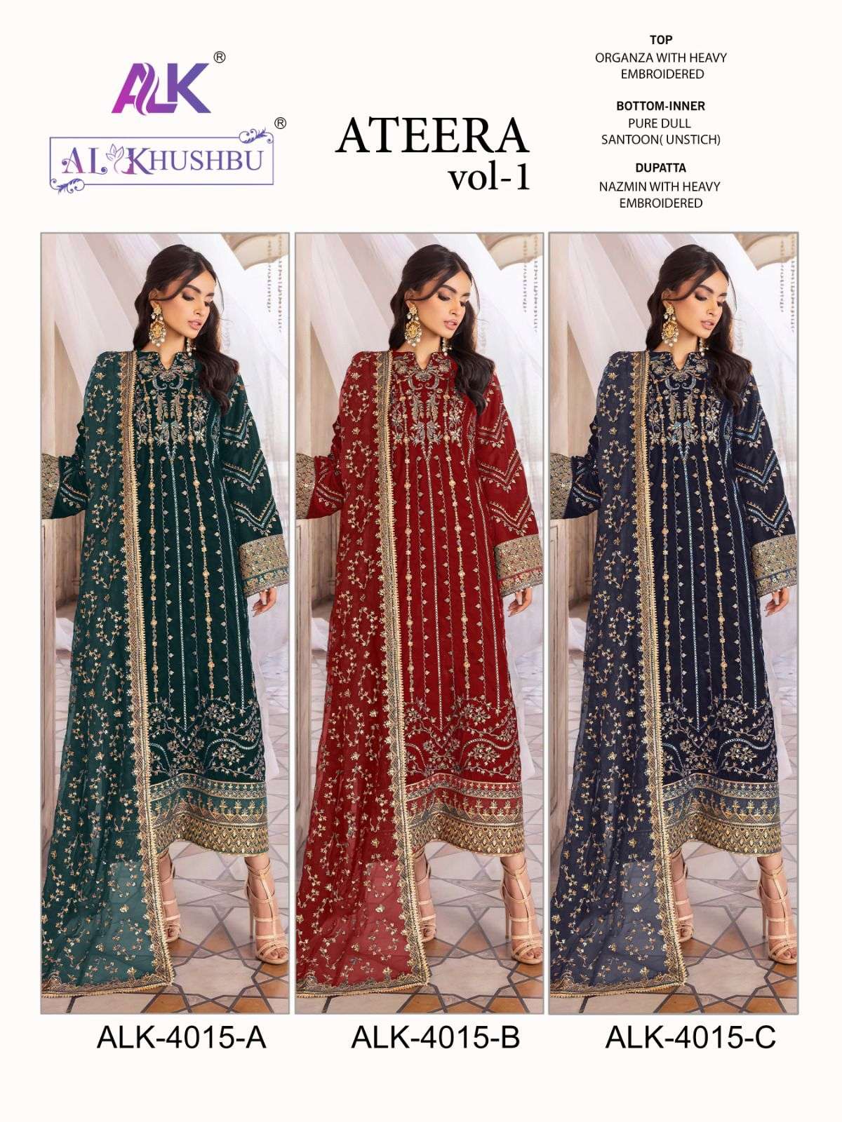 🙏🏻Dear AL_KHUSHBU 💕ATEERA-VOL-1💕 💕*ALK DNO_4015-A-B-C-HITS COLOURS 💕 👇🏻Fabric details 👇🏻 👗 Top : GEORGETTE WITH HEAVY EMBROIDERED 👖Bottom :DULL SANTOON WITH EMBRODERY 🏳️🌈Dupatta : NAZMIN WITH HEAVY EMBROIDERY 🏳️⚧️INNER :- DULL SANTOON