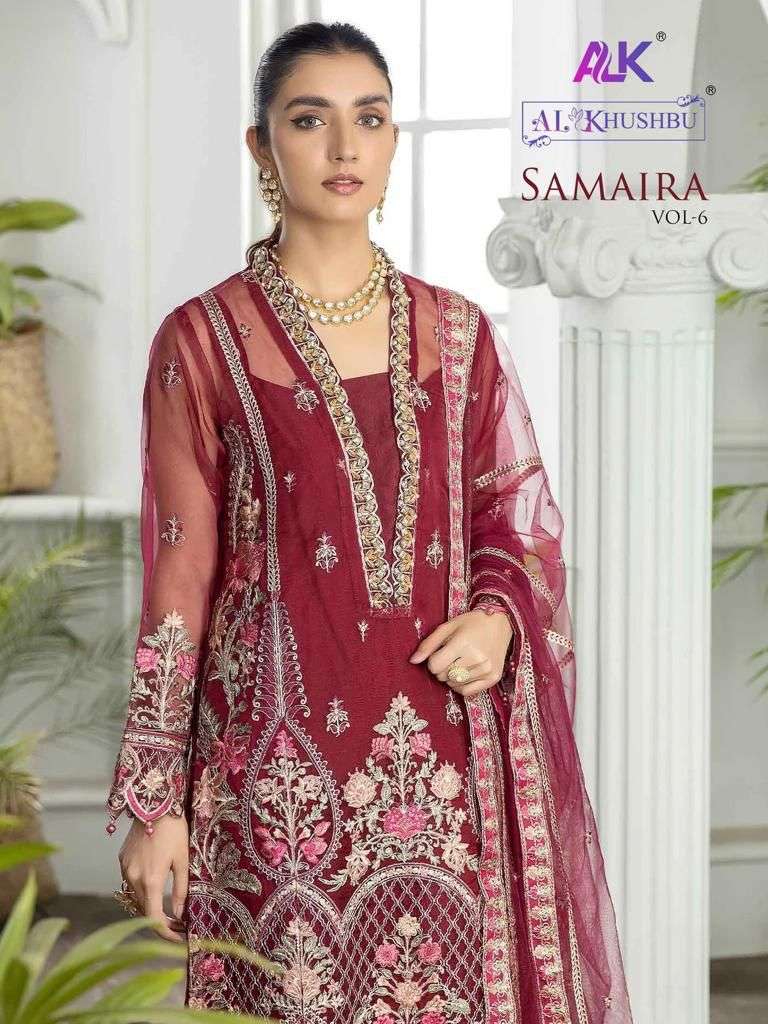 Al khushbu present samaira vol 6 pakistani heavy embrodiery moti work suit material