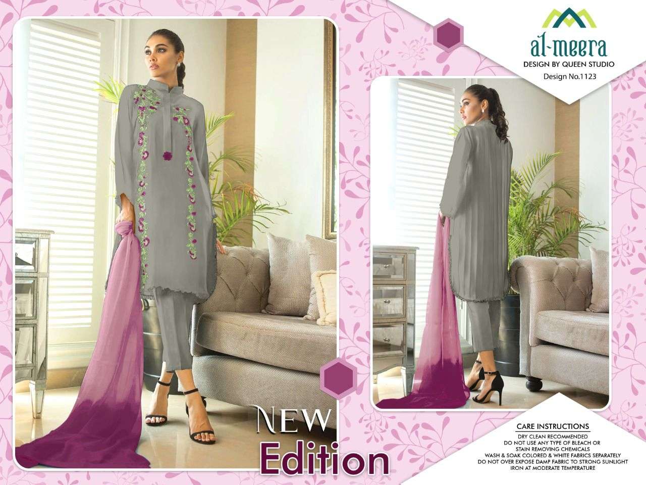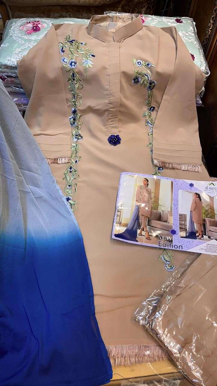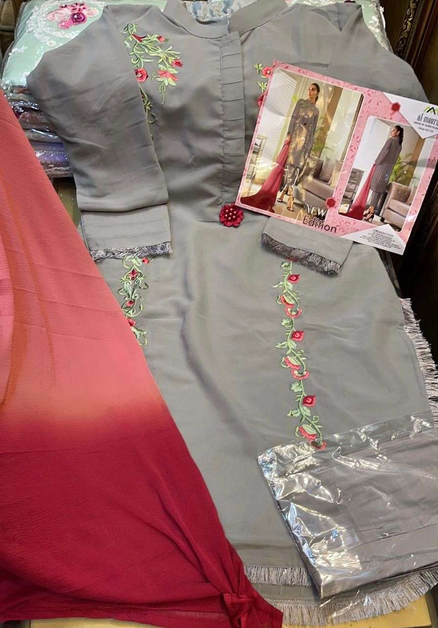 AL-MEERA ( D.NO-1123 ) ( new edition ) We are Introducing our LUXURY PRET COLLECTION To Make You Unique and Classy..       DESIGN BY QUEEN STUDIO Description A black or cream, fox georgette shirt adorned with contrasting coloured embroidery on the front; made complete with frayed edges and pleat detailing, paired with shaded dupatta. Details Top :- fox georgette with inner.(santoon) Bottom :-jaam satin.(100% cotten) dupatta :-nazneen. Colour :- Chiku - Marun, Chiku - Nblue, Grey - Wine, Grey - Marun, Cream - Nblue, Cream - Wine.        Size Chart Top xl size chest (42) Bottom xl size (36-42) Rate:- 999+$ Colour may slightly vary due to light effect Ready To Dispatch |