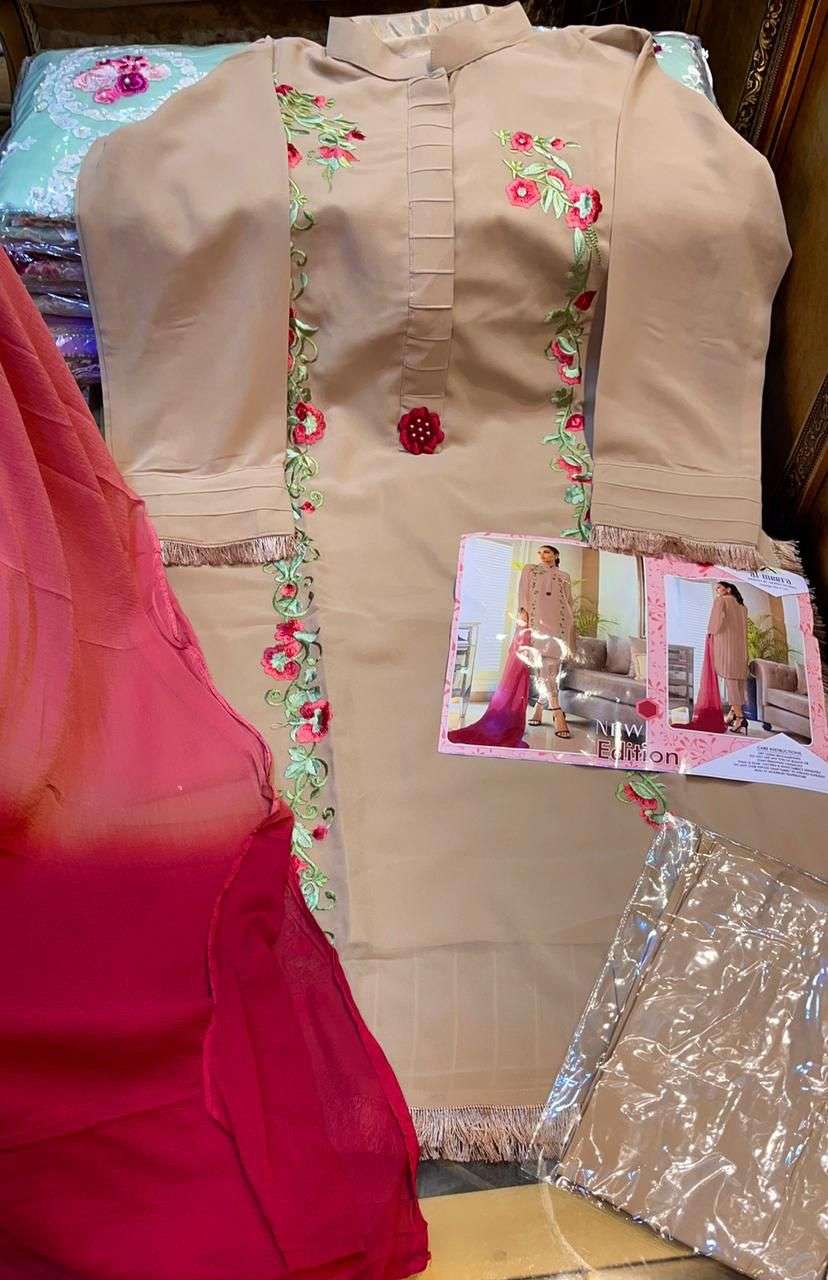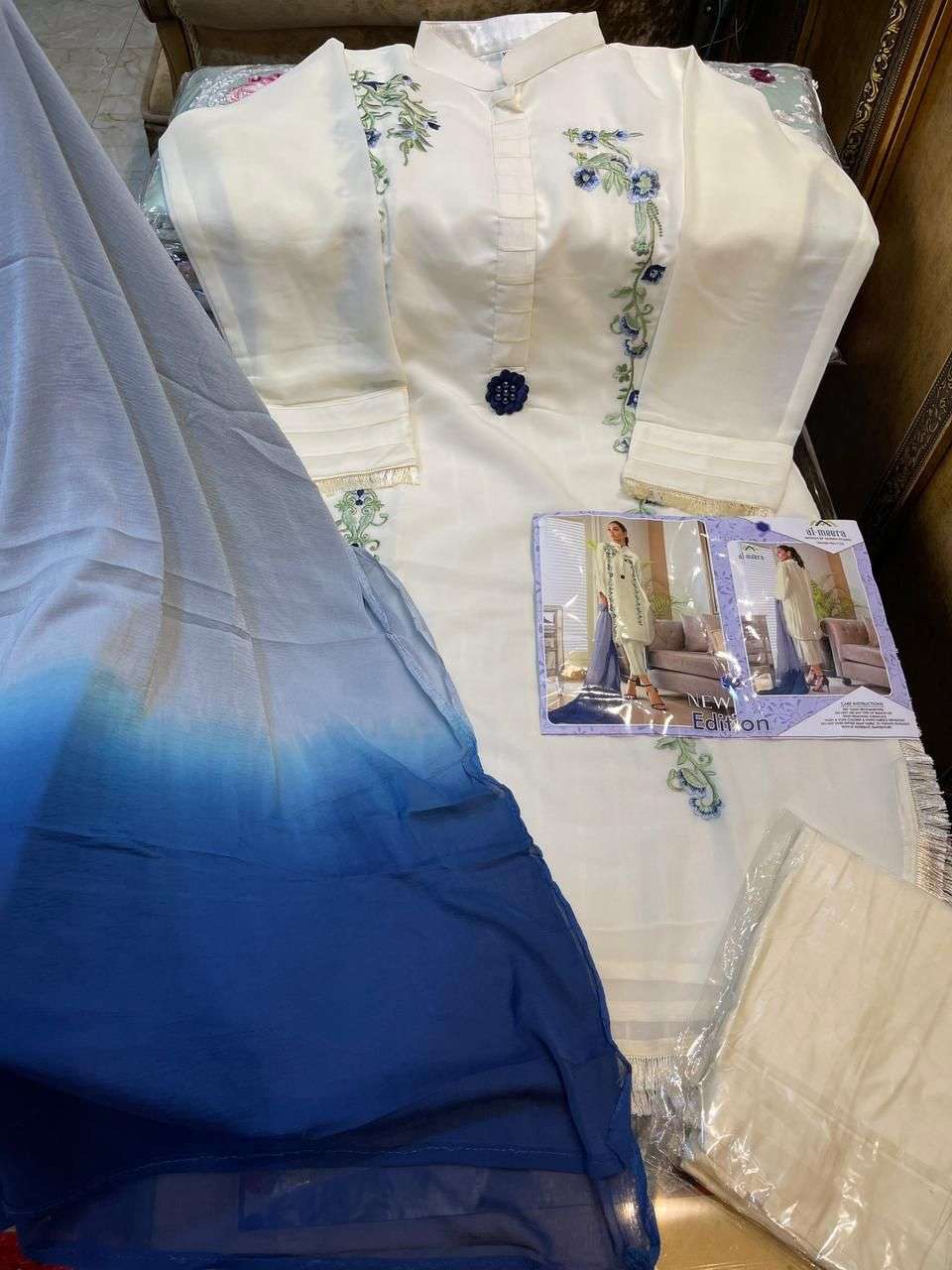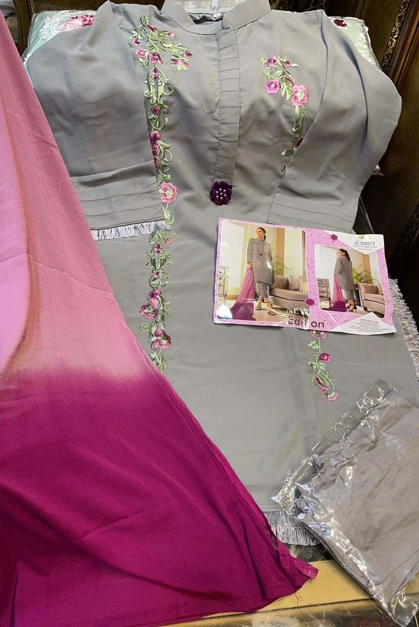 AL-MEERA ( D.NO-1123 ) ( new edition ) We are Introducing our LUXURY PRET COLLECTION To Make You Unique and Classy..       DESIGN BY QUEEN STUDIO Description A black or cream, fox georgette shirt adorned with contrasting coloured embroidery on the front; made complete with frayed edges and pleat detailing, paired with shaded dupatta. Details Top :- fox georgette with inner.(santoon) Bottom :-jaam satin.(100% cotten) dupatta :-nazneen. Colour :- Chiku - Marun, Chiku - Nblue, Grey - Wine, Grey - Marun, Cream - Nblue, Cream - Wine.        Size Chart Top xl size chest (42) Bottom xl size (36-42) Rate:- 999+$ Colour may slightly vary due to light effect Ready To Dispatch |