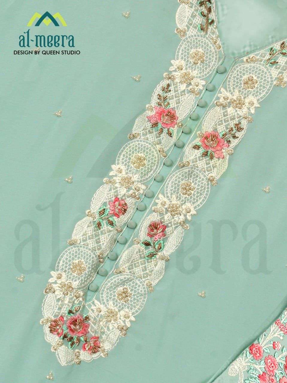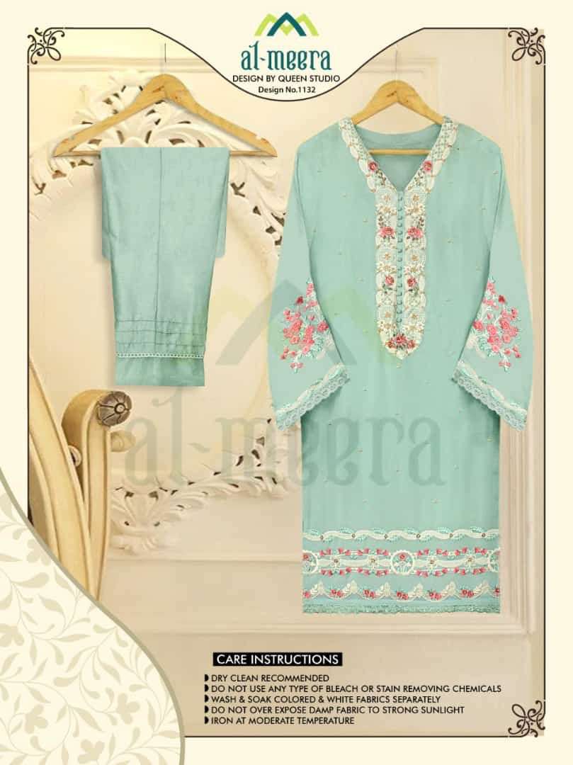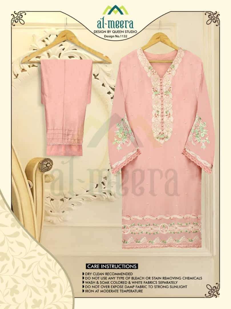 AL-MEERA         ( D.NO-1132 ) We are Introducing our LUXURY PRET COLLECTION To Make You Unique and Classy..       DESIGN BY QUEEN STUDIO Description Beautifully Embroidered Georgette Shirt With Classy Handwork, Paired With Designer Pants. Details Top :- fox georgette with inner.(santoon) Bottom :- jaam satin.(100% cotten) Colour :- peach,c-green        Size Chart Top xl size chest (42) Bottom xl size (36-42) Top xxl size chest (46) Bottom xxl size (40-46) Rate:- 1099/- Colour may slightly vary due to light effect pre-booking open dispatch on Thursday (09-09-2021) |