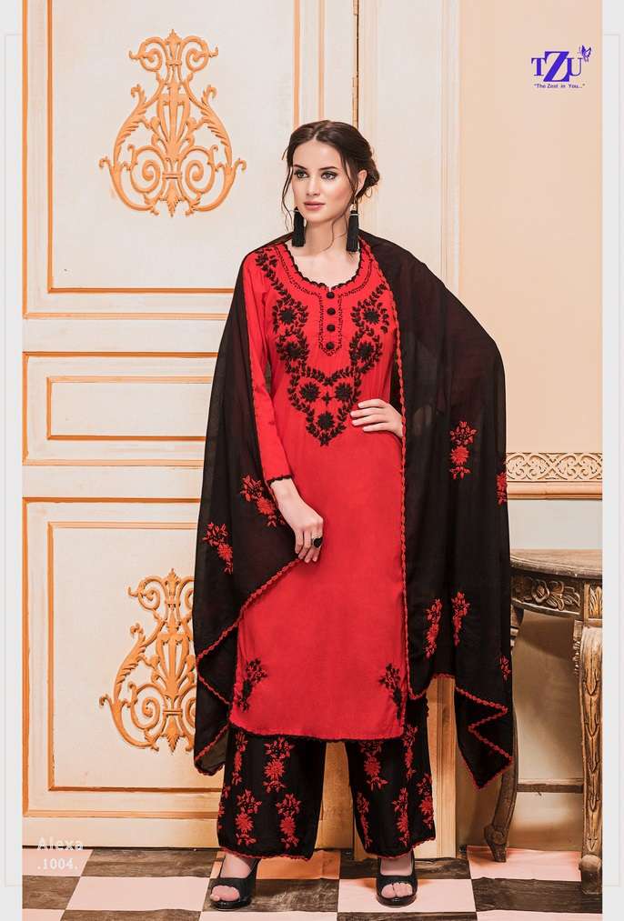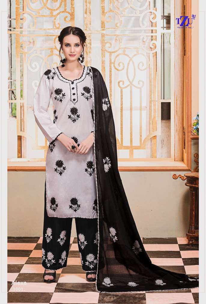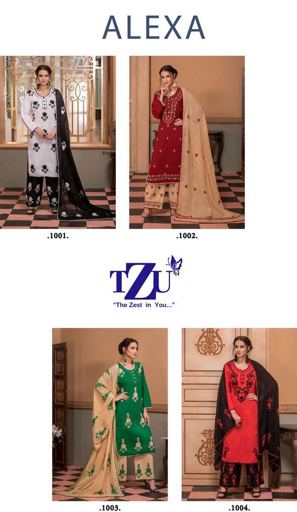 !:!:!:! TZU !:!:!:! INTRODUCING- 🖱️🖱️🖱️🖱️🖱️🖱️🖱️🖱️🖱️🖱️🖱️ ALEXA FABRIC :- SUPERIOR FINE COTTON PATTERN :-HAND WORK EMB.TOP , BOTTOM & DUPATTA LENGTH :- 46 INCH. DESIGNS :-1001 TO 1004 SIZES :-M,L,XL,2XL RATE :- 999/- TOP,BOTTOM GST :- 5% |