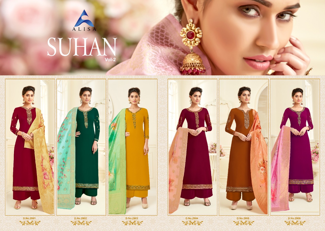 BRAND-ALISA ⤠New launch â SUHAN-2â Digital Dupatta DIGITAL-BANARAS BEAUTY OF MATERIAL PREMIUM RANGE BEST QUALITY BEAUTY OF MODELING After Great success of 1st Cataloge today we bring suhan satin gorgette with Jacard banaras digital dupatta.... â¤SUHAN- vol.2 Digital Jacard dupatta⤠Today we are launching pure satin gorgette straight suit with diamond with heavy Banaras dupatta....... Description:-SUHAN VOL2 âÂÂâÂÂâÂÂâÂÂâÂÂâÂÂâÂÂâÂÂâÂÂâ TOP:-Satin Gorgette With heavy work &Additional diamond work Inner:-Santun Bottom: Japan santun Dupatta:-Digital Banaras Jacard Special:-Satin digital with best rate Design:- 6 Pcs Rate:-1295/- Dispatch:-9 oct 2019 |