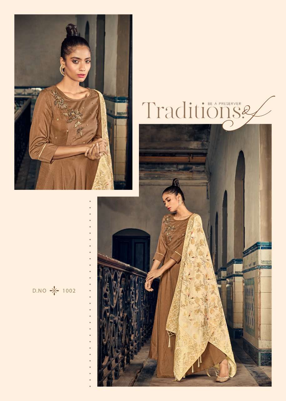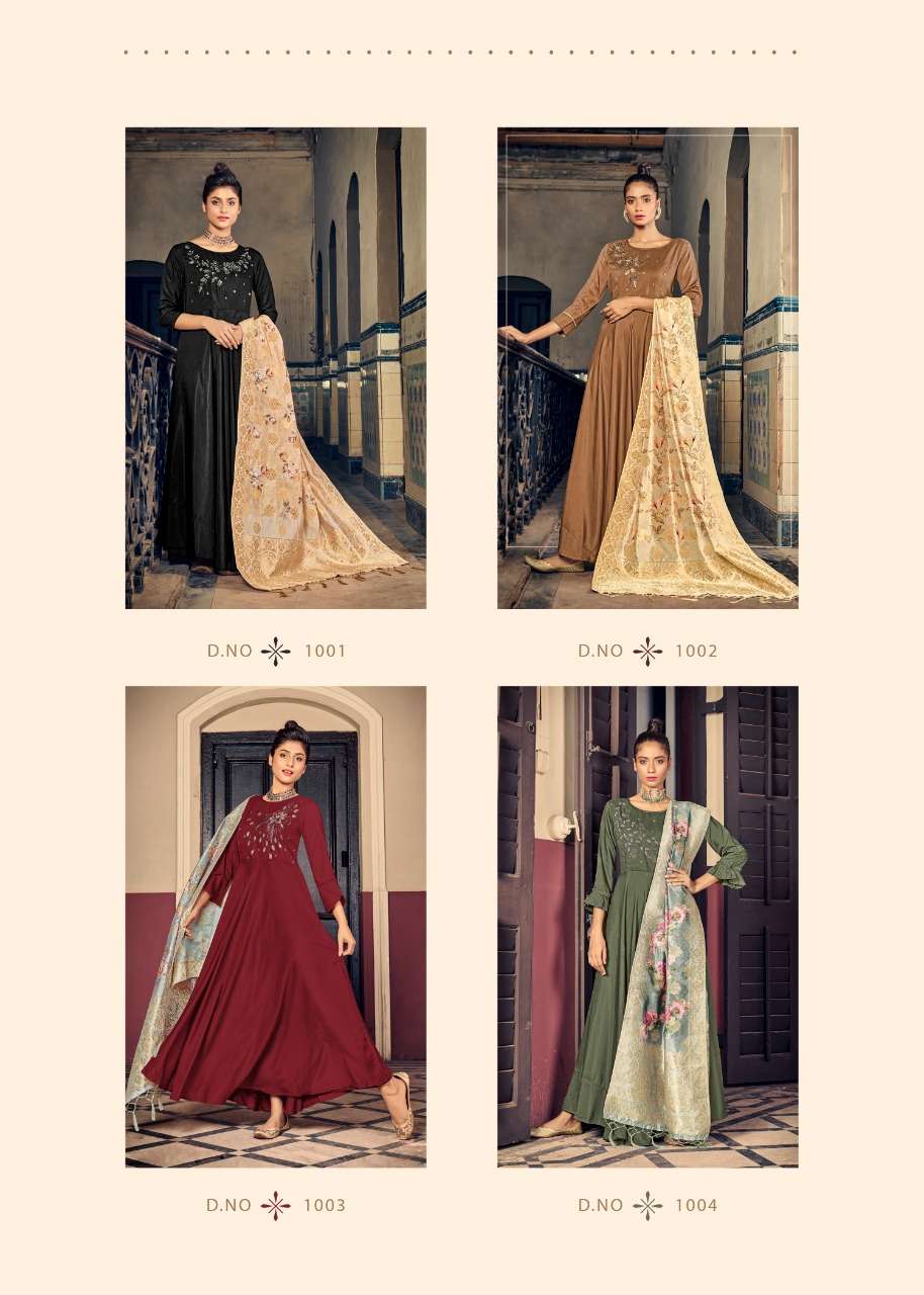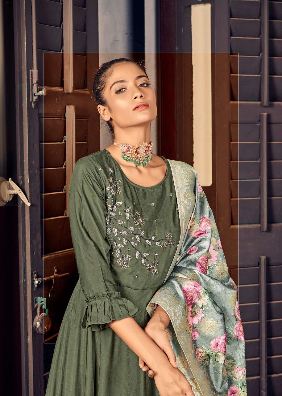 alishka fashion awesome maslin silk long readymade gown with banarasi silk dupatta