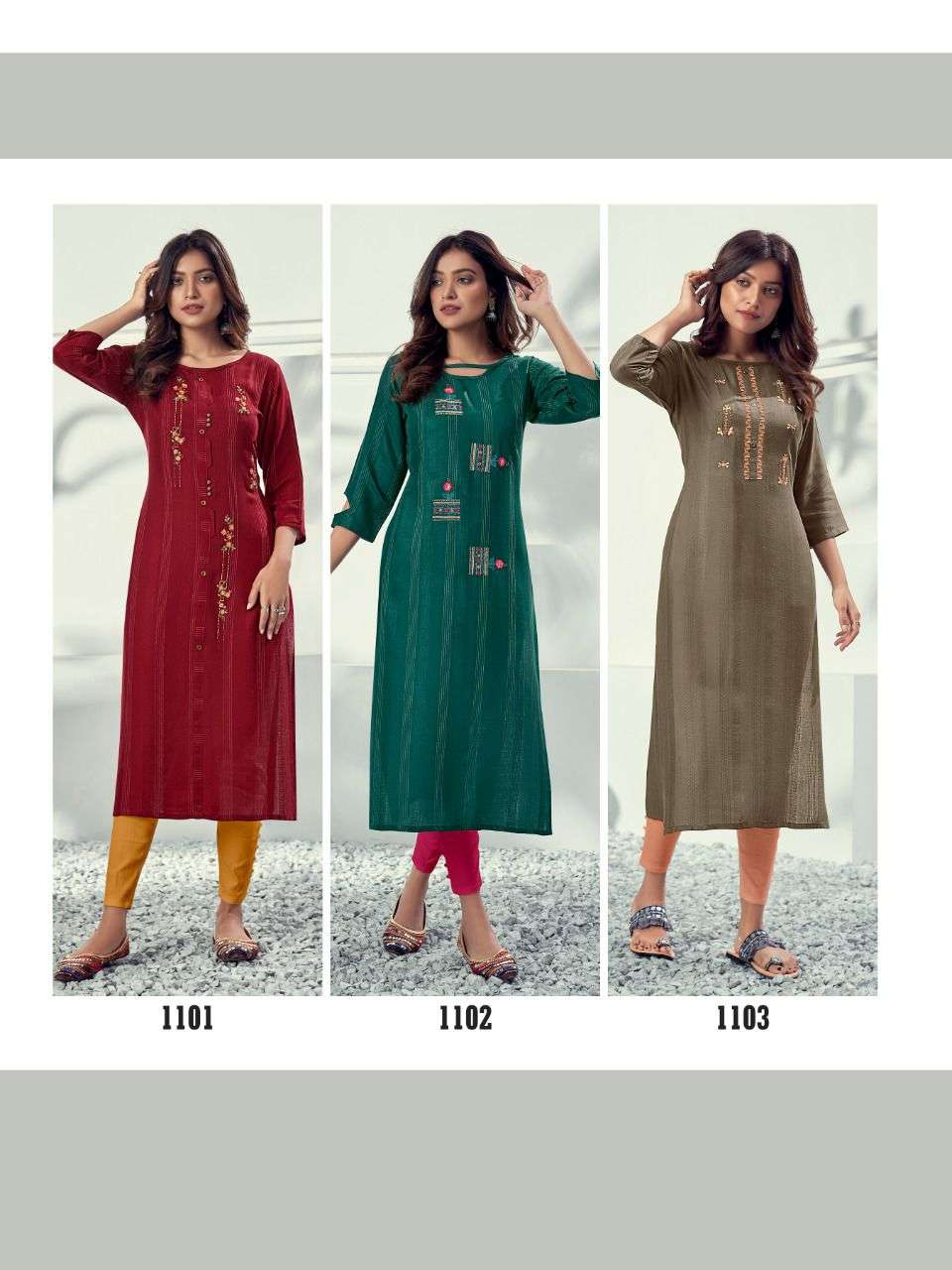 Jai Mata DI Riya Designer  has launched  Catalog name :  Alivia Fabric Details Top :- 100% Fancy Reyon Weaving Pattern With Embrodairy work with khatli work Total Design :- 06 Rate:- Rs.511 + Gst Set to set  Size;- M-(38),L-(40),XL-(42), XXL-(44) |