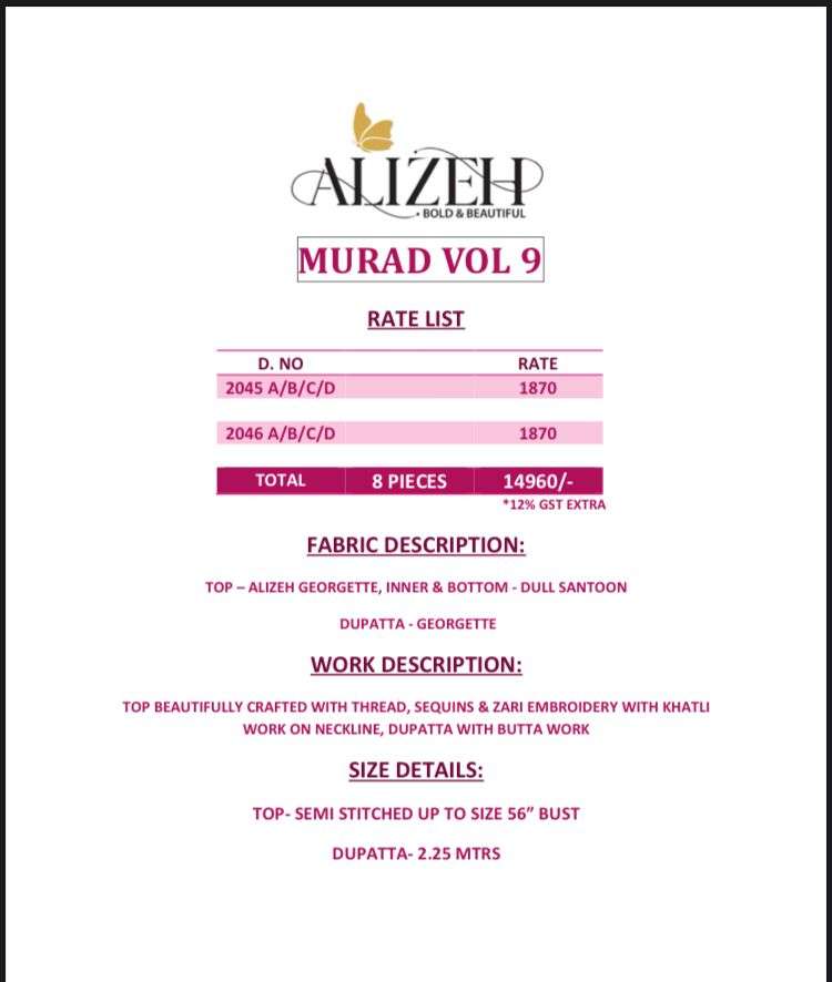 ALIZEH OFFICIAL MURAD VOL - 9 Bringing Elegant And Fashionable Collection With New Designs And Hit Colors To Rock Your Festivals And Weddings!! Embroidered With Multi Thread And Sequins Work Along With Khatli Work. Bust - 56 INCHES GST 12 per extra |