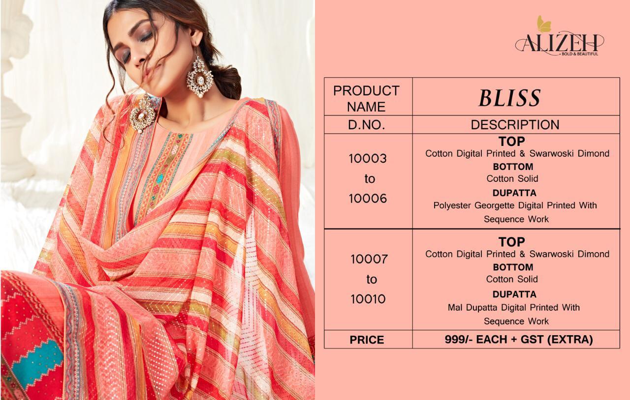BLISS-PREMIUM COTTON SERIES FABRIC DETAILS 10003 To 10006- TOP-COTTON DIGITAL PRINTED WITH SWARWOSKI WORK BOTTOM-COTTON SOLID DUPATTA-POLYESTER GEORGETTE DIGITAL PRINTED WITH SEQUENCE WORK FABRIC DETAILS 10007 To 10010- TOP-COTTON DIGITAL PRINTED WITH SWARWOSKI WORK BOTTOM-COTTON SOLID DUPATTA-MAL DIGITAL PRINTED WITH SEQUENCE WORK SIZE CAN STICH UP TO Upto 60 inches bust RATE - ₹999+5% GST BOOK YOUR ORDERS NOW.!! HIGHER QUALITY AND 100% CUSTOMER SATISFACTION🥳 DELIVERY STARTS IN 2-3 DAYS |