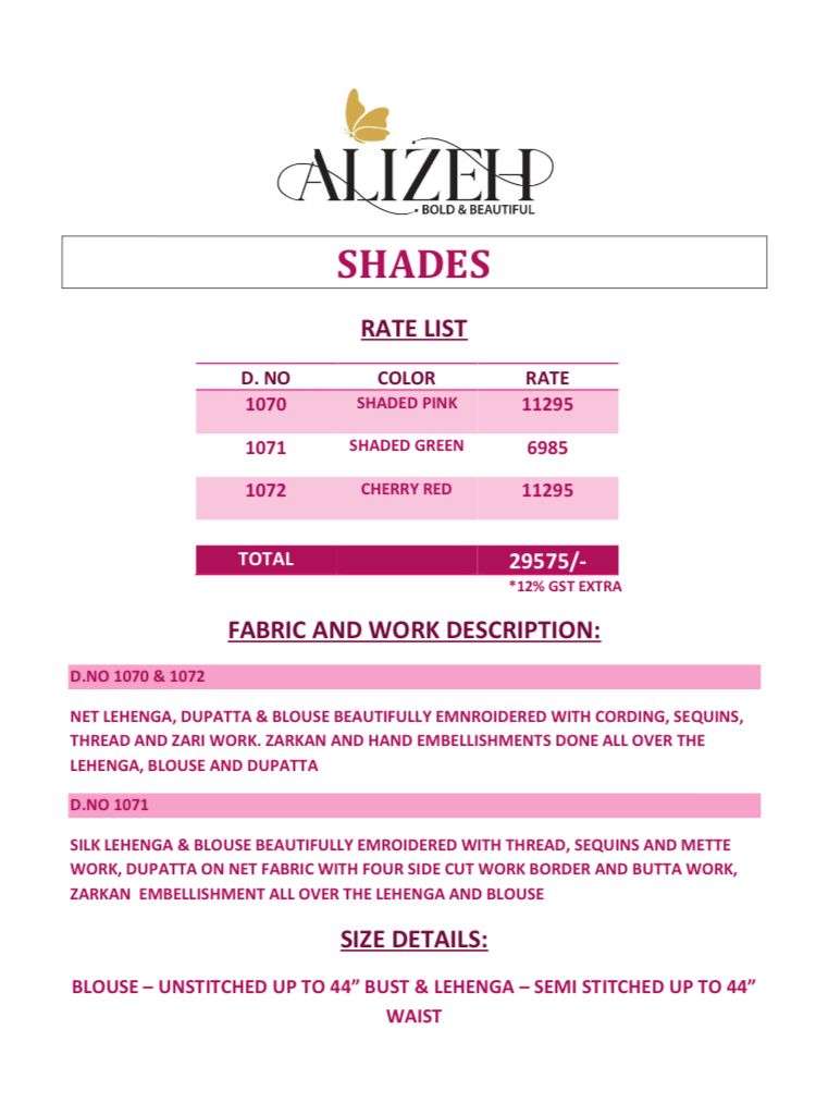 ALIZEH OFFICIAL _ SHADES_ A COLLECTION FULL OF UNIQUE DESIGNS AND COLOR COMBINATIONS TO MAKE YOU LOOK EXTREMELY BEAUTIFUL, THIS COLLECTION HAS DIFFERENT VARIETY OF DESIGNS AND WORK DETAILING WITH LOTS OF HAND EMBELLISHMENTS PRICELIST AND FABRIC DETAILS ATTACHED PRODUCT WEIGHT IS 4.5 KG |