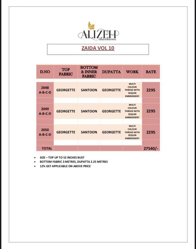 ALIZEH OFFICIAL ✨✨ PRESENTING OUR PREMIUM HEAVY TOP & DUPATTA COLLECTION ✨✨ ZAIDA VOL-10 STYLISH AND COLORFUL SUITS SERIES TO BRIGHTEN UP YOUR OCCASIONS PRICELIST AND FABRIC DETAILS ATTACHED PRODUCT WEIGHT IS 1.5 KG |