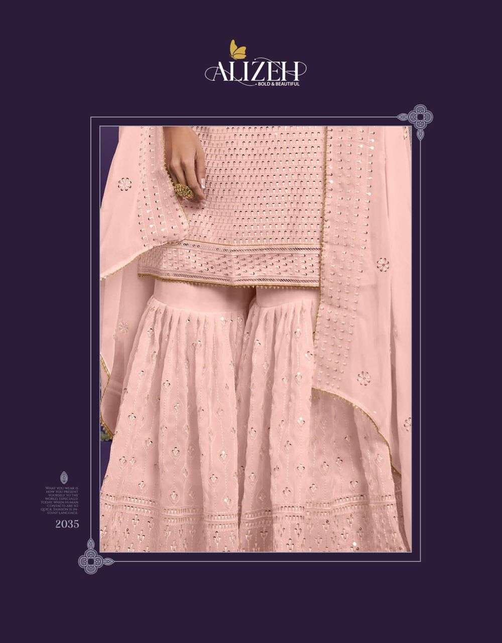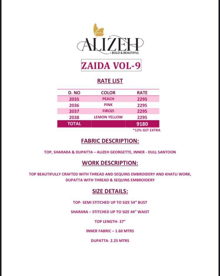 ALIZEH OFFICIAL PREMIUM SHARARA COLLECTION ZAIDA VOL-9 Fabric & Size Details- Top Fabric-Alizeh Pure Georgette Sharara Fabric-Alizeh Pure Georgette Dupatta Fabric-Alizeh Pure Georgette Inner Fabric For Top & Sharara- Dull Santoon Work Details- Top-Heavy Thread & Sequins Embroiedery With Heavy Khatli & Handwork On Neckline Weight-1.5 KG |