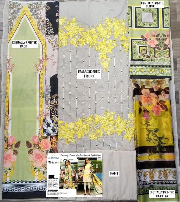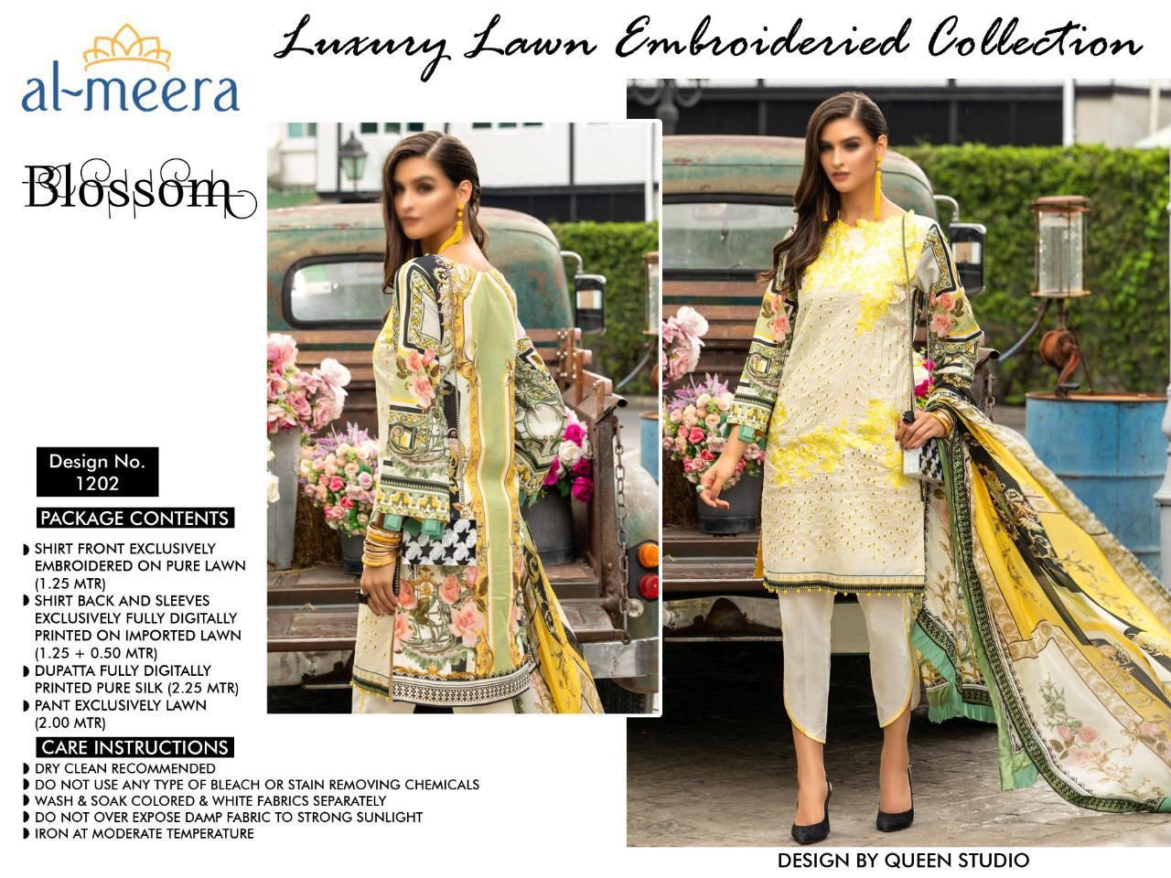 AL-MEERA ⨠(D.NO-1202) (BLOSSOM) We are Introducing our LUXURY LAWN EMBROIDERIED COLLECTION To Make You Unique and Classy.. With Supirier Quality and Affordable Price âÂÂâÂÂâÂÂâÂÂâÂÂâ DESIGN BY QUEEN STUDIO âÂÂâÂÂâÂÂâÂÂâÂÂâ Description ã°ï¸Âã°ï¸Âã°ï¸Âã°ï¸Âã°ï¸Âã°ï¸Âã°︠Designer Embroidery with fully digitally printed lawn Heavy dress Details ã°ï¸Âã°ï¸Âã°ï¸Âã°ï¸Âã°ï¸Âã°ï¸Âã°︠⨠Front:-pure lawn with fully embroidery (1.25 mtr) ⨠Back:- Fully digitally printed imported lawn (1.25 mtr) ⨠Sleeve:- Fully digitally printed imported lawn (0.50 mtr) ⨠Bottom :- pure lawn (2.00 mtr) ⨠Dupatta:- Fully digitally printed pure silk (2.25 mtr) ⨠Rate:- 1195/- Min ~ 3 pcs â¡ï¸Ââ¡ï¸Ââ¡ï¸ÂColour may slightly vary due to light effectâ¡ï¸Ââ¡ï¸Ââ¡︠Book Fast Limited Stock ⨠Dispatch on next Thursday⨠|