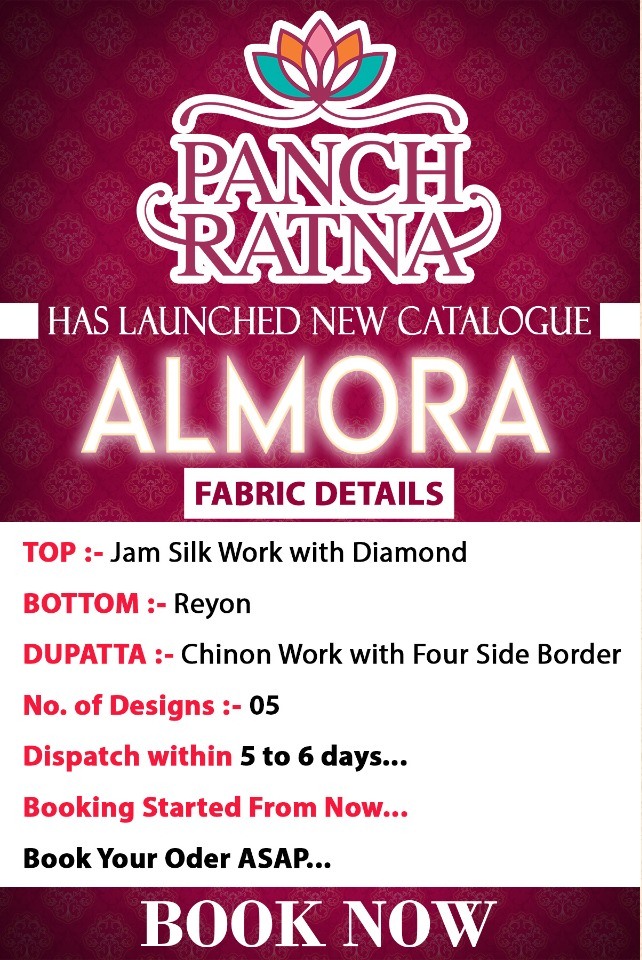 📌 PANCH Ratna has launched Catalog name: ALMORA 🔸 Fabric Details 🔸 ▪Top:- Jam Silk Work with Diamond. ▪Bottom:- Rayon ▪Dupatta:- Chinon Work with Four Side Border ▪Total Design:- 05 ⏰Dispatching 5 to 6 days later 📝Booking started from now... 📞Order yours soon... Rate - 649 per pcs . Set to set . GST 5 Percent Extra. |