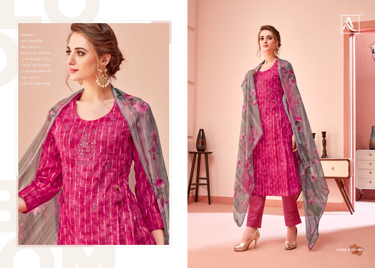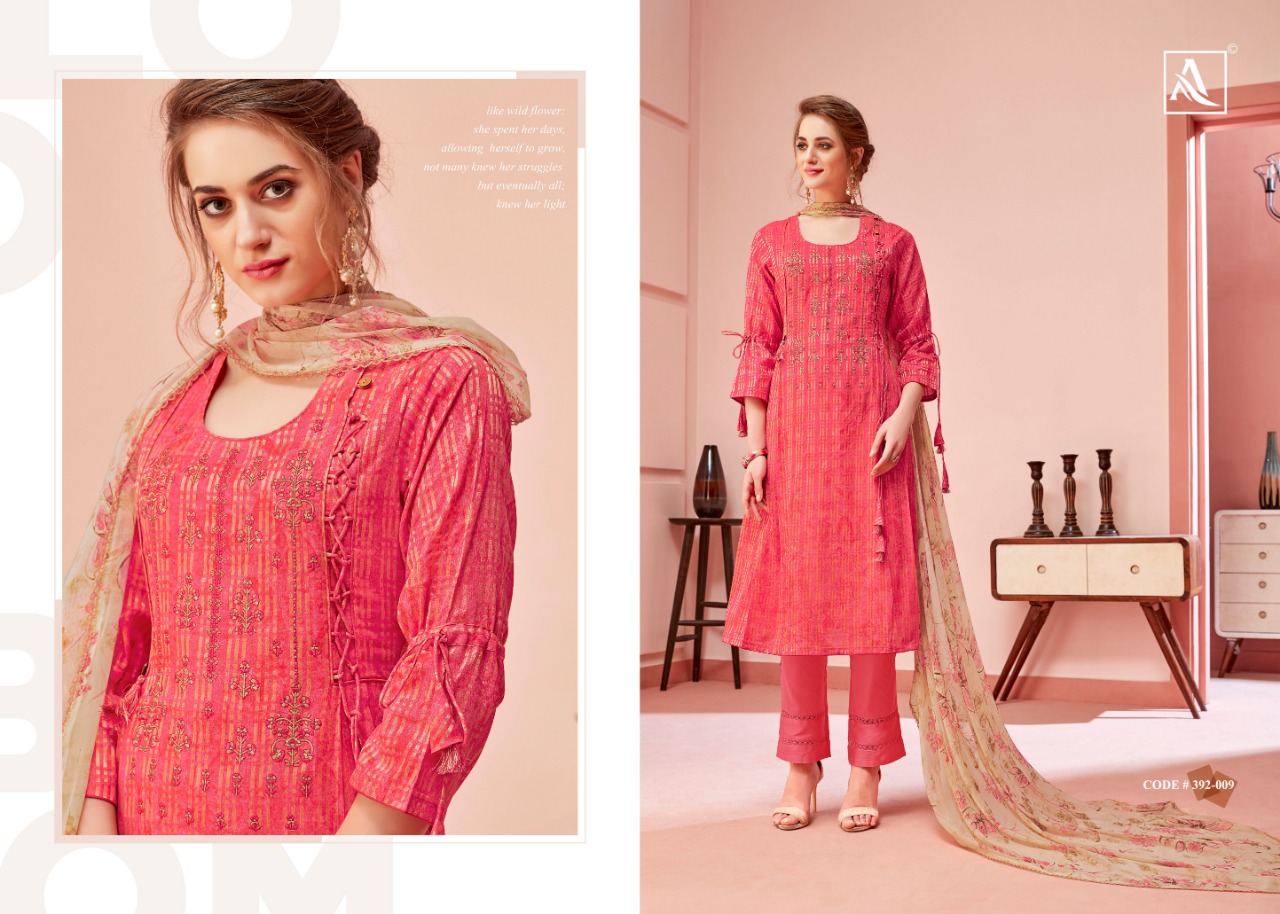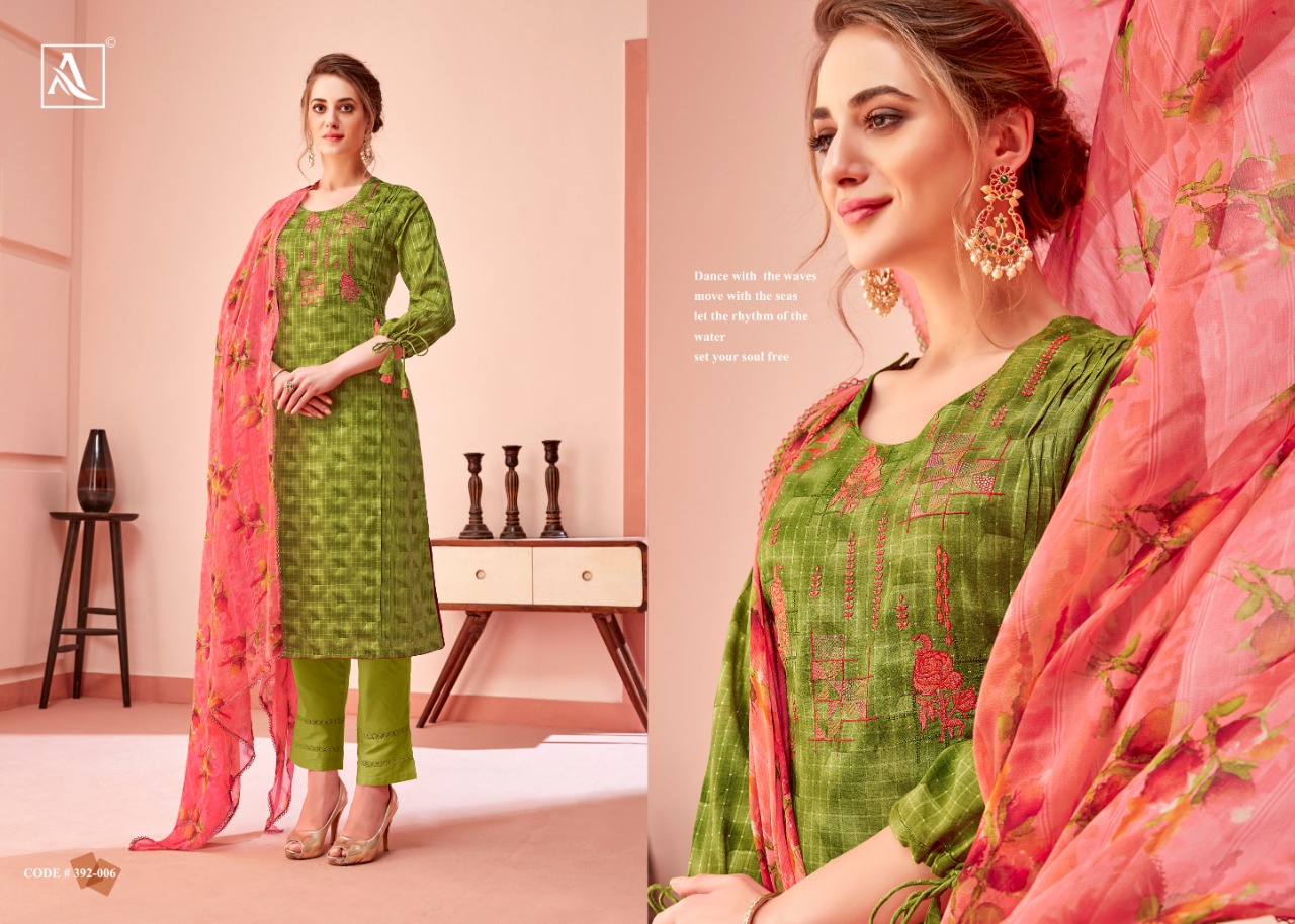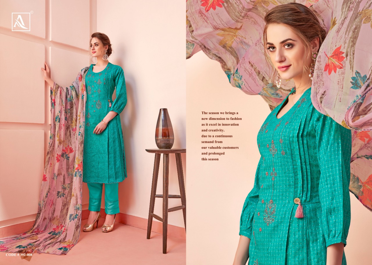 ALOK SUIT MIRAKI - Incredible Designer Embroidery Collection Here Alok Suit presents a very fresh Designer Embroidery Collection - MIRAKI. These Designer Salwar suits are perfect to add elegant look to your ethnic wear to your wardrobe. Fabric Details: Top: Pure Cotton Fancy Pattern with Embroidery & Swarovski Diamond Bottom: Pure Cotton Solid Dupatta: Pure Nazneen Chiffon Fancy Print Dupatta with Four Side Lace The single set of dresses contains: Pcs Make it yours with really affordable rate: ₹ 5⃣9⃣9⃣+ 5⃣% GST |