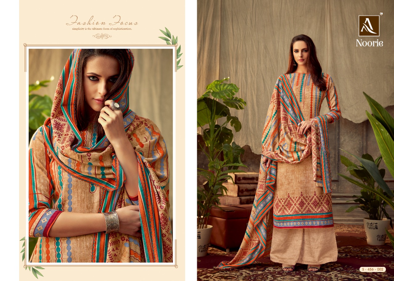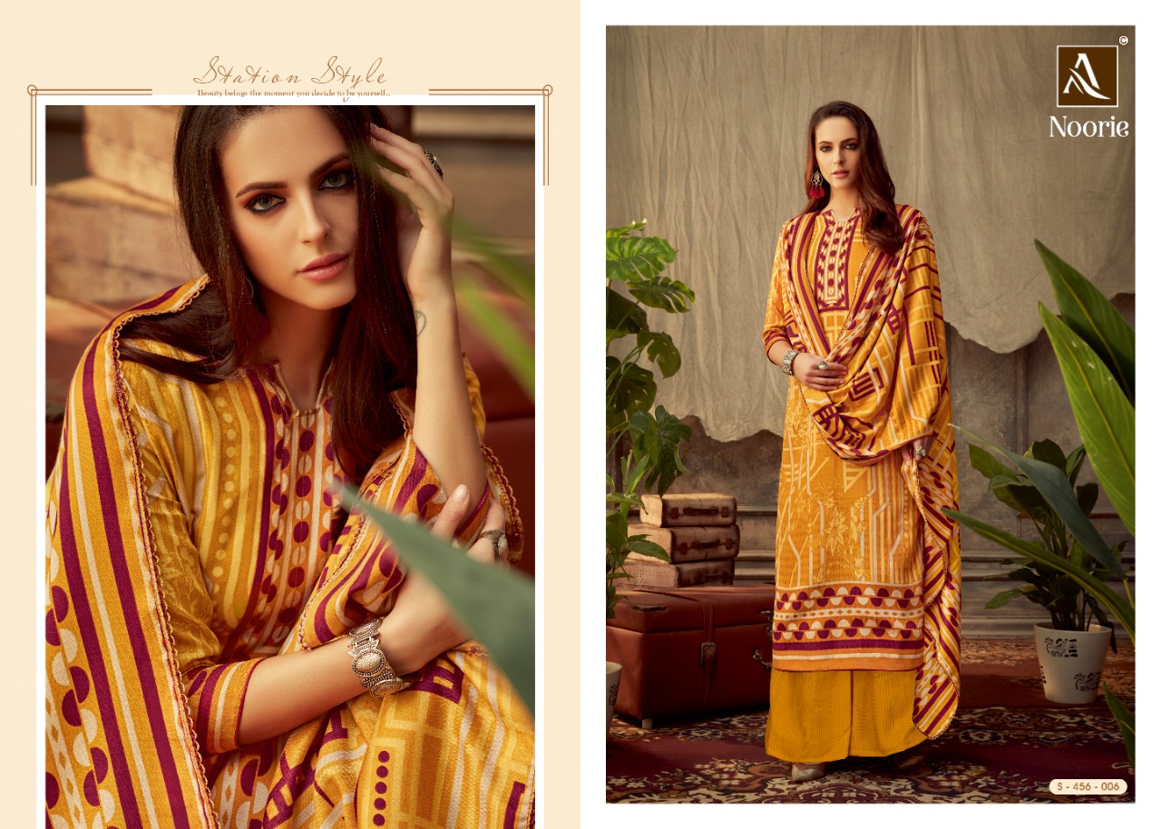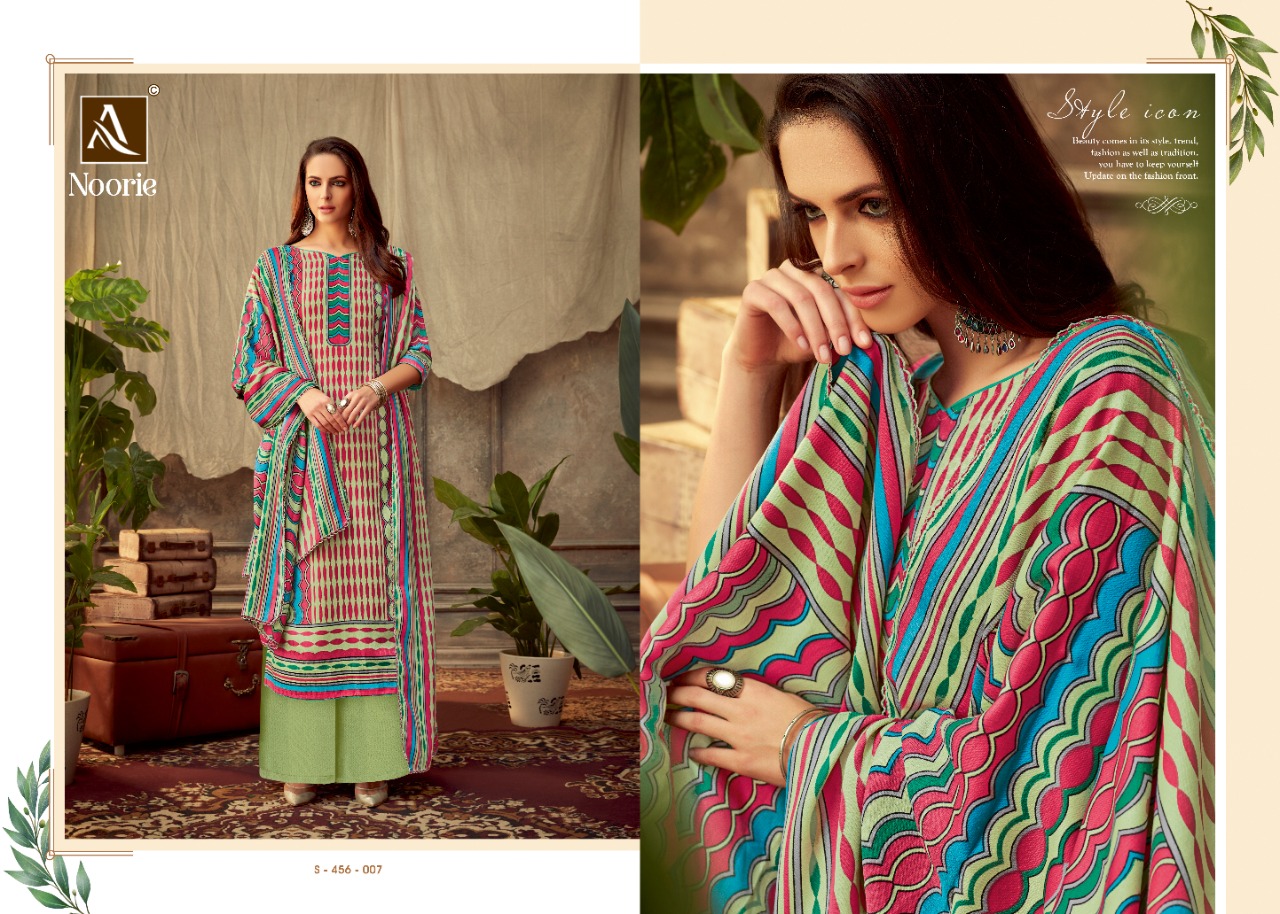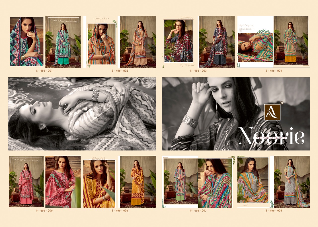 ALOK SUIT NOORIE - Incredible Wool Pashmina Collection Here Alok Suit presents a very fresh Wool Pashmina collection - NOORIE. Chic Pashmina Top with classy bottom and tempting Dupatta is surly going to give you best comfort with style. Fabric Details: Top: Wool Pashmina Jacquard Fancy DIgital Style Print Bottom: Wool Pashmina Self Print Dupatta: Wool Pashmina Shawl Designer Print With four side lace The single set of dresses contains: 8⃣Pcs Make it yours with really affordable rate: *₹*5⃣2⃣5⃣ + 5⃣% GST |
