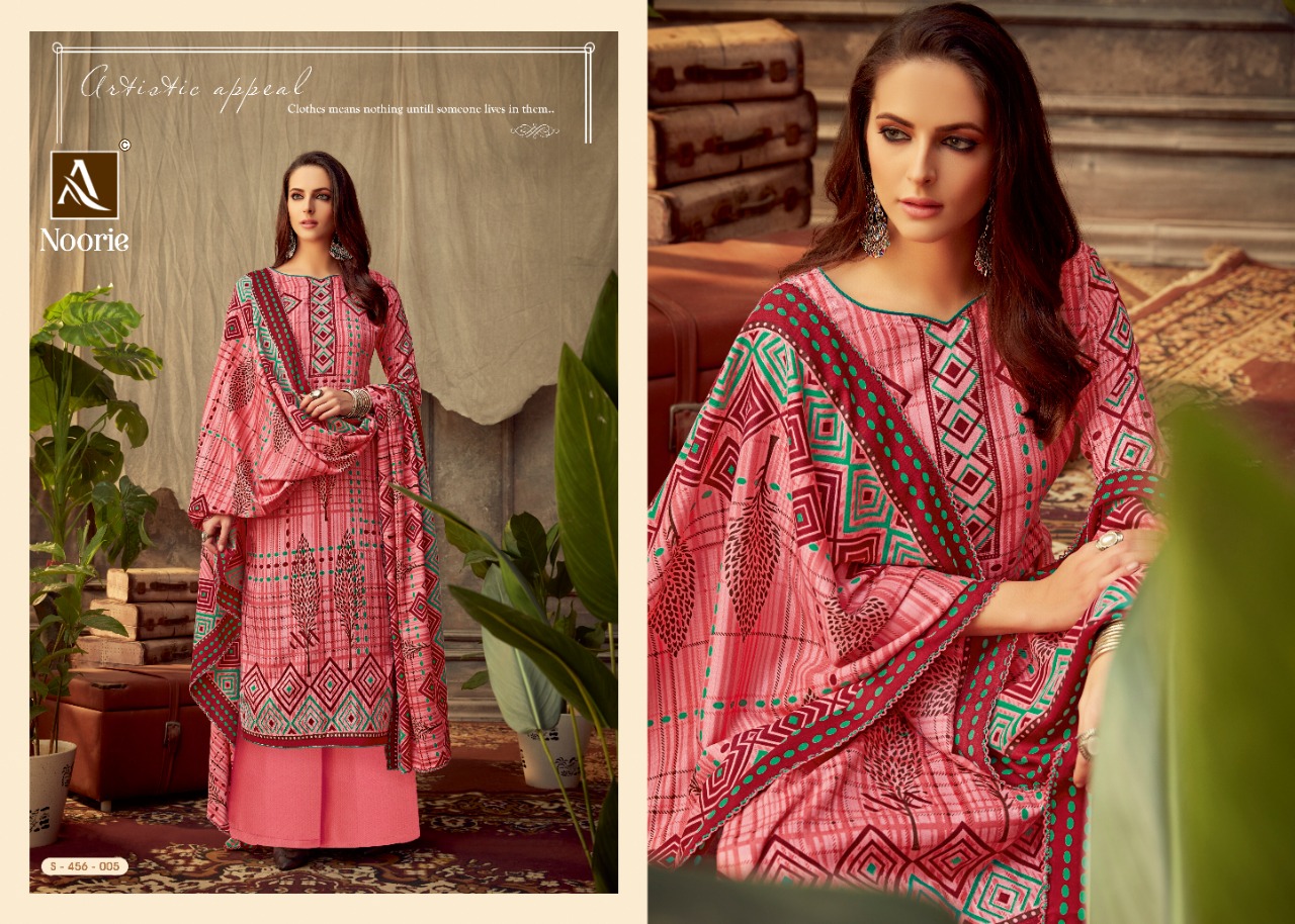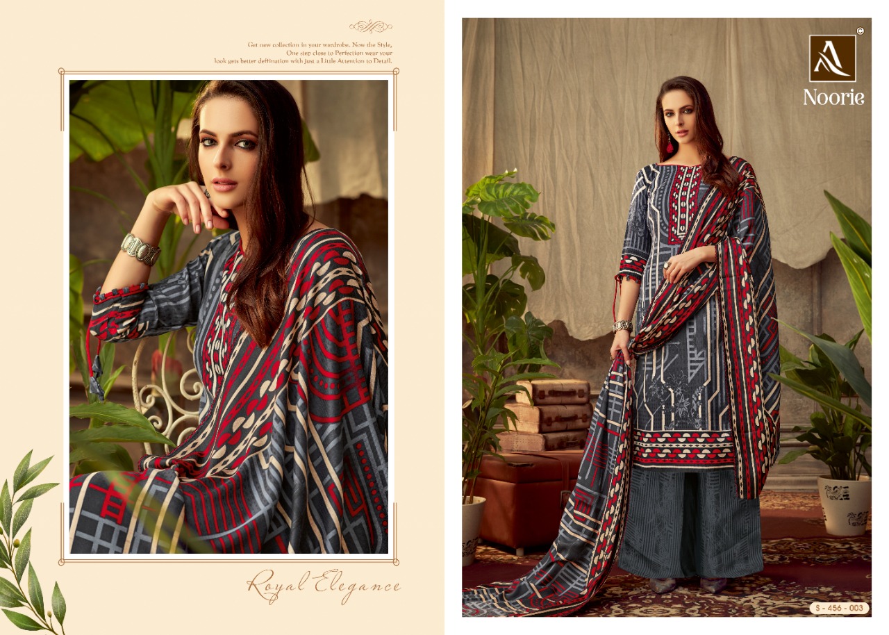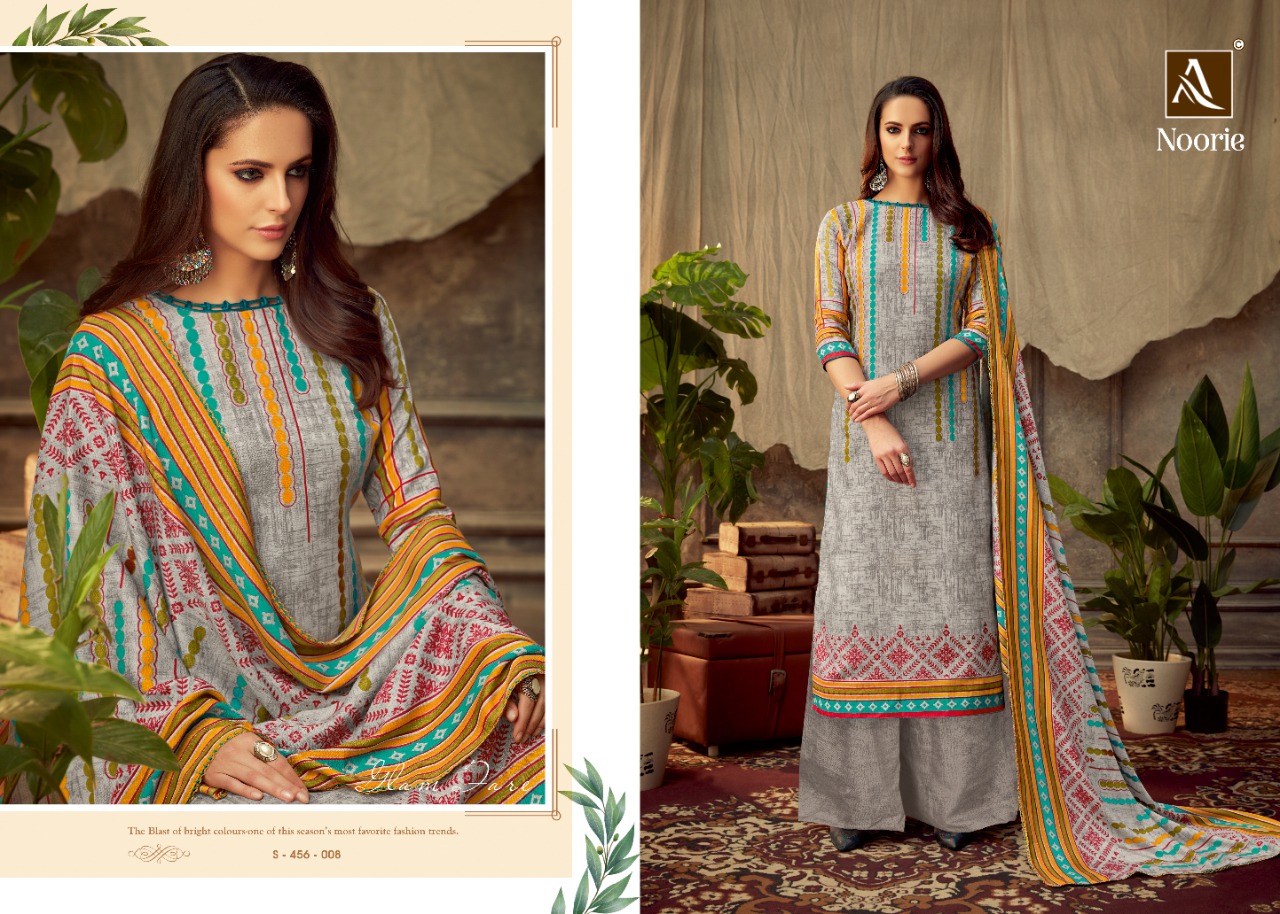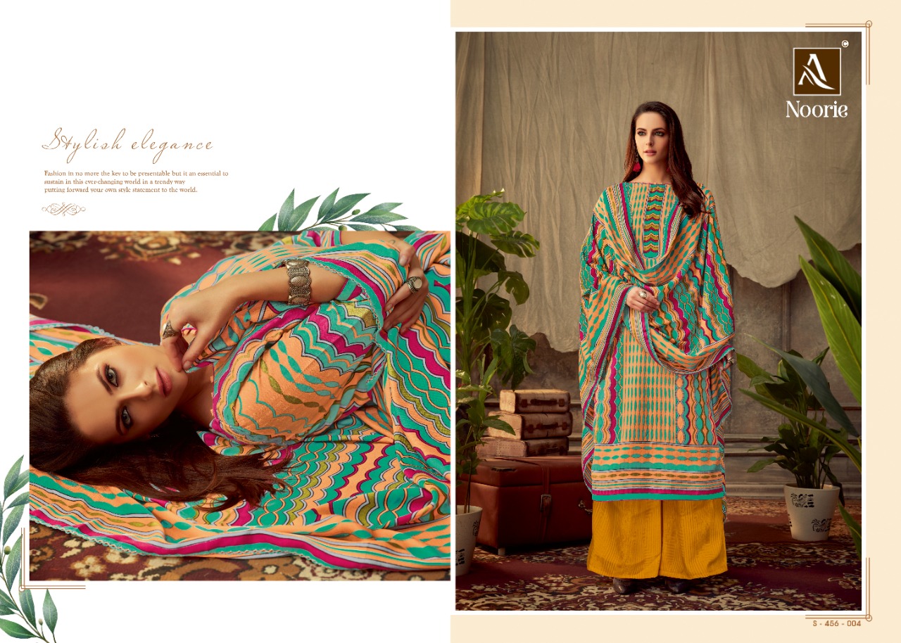 ALOK SUIT NOORIE - Incredible Wool Pashmina Collection Here Alok Suit presents a very fresh Wool Pashmina collection - NOORIE. Chic Pashmina Top with classy bottom and tempting Dupatta is surly going to give you best comfort with style. Fabric Details: Top: Wool Pashmina Jacquard Fancy DIgital Style Print Bottom: Wool Pashmina Self Print Dupatta: Wool Pashmina Shawl Designer Print With four side lace The single set of dresses contains: 8⃣Pcs Make it yours with really affordable rate: *₹*5⃣2⃣5⃣ + 5⃣% GST |