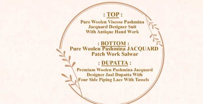 ♥YOUR FAVOURITE BRAND♥ Launches its New Designer Suits : GULMOHAR 🔸 Fabric Details 🔸 👖 Bottom: Pure Woolen Pashmina Jacquard Patch Work Salwar 🏳 Dupatta: Premium Woolen Pashmina Jacquard Designer Jaal Dup with Four Side Piping Lace with Tassels *RATE:*+%GST Pcs Happy Shopping… |