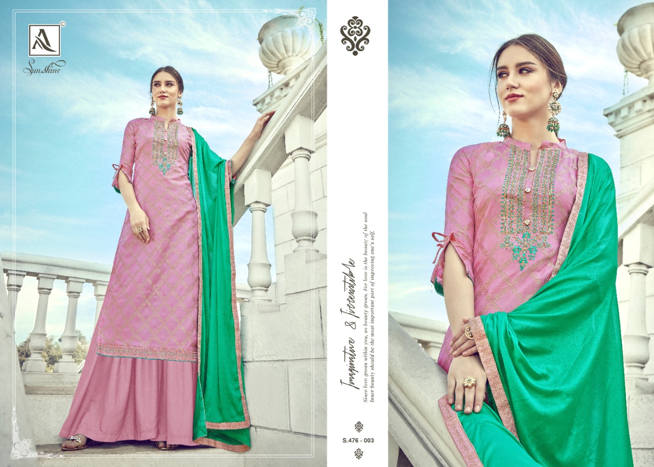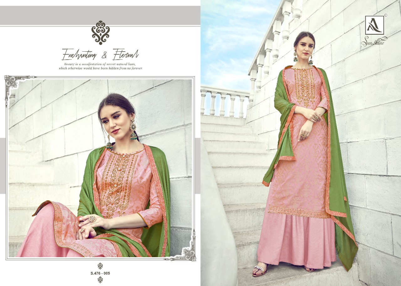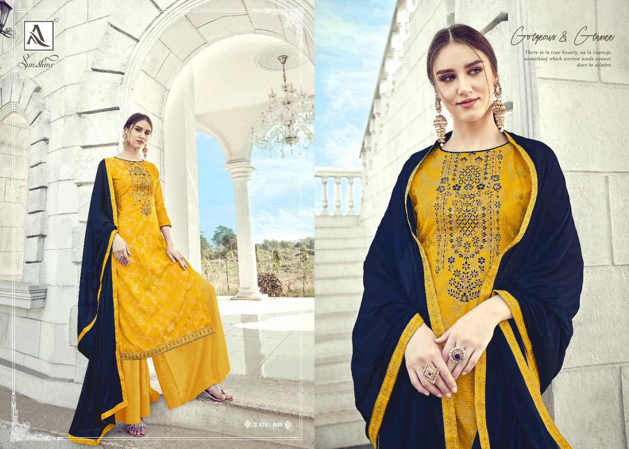ALOK SUIT SUNSHINE - Incredible Banarasi Embroidery Collection Here Alok Suit presents a very fresh Embroidery Collection - SUNSHINE. Chic Designer Top with Stylish bottom and tempting Dupatta is surly going to give you best comfort with style. Fabric Details: Top: Pure Banarsi Jacquard with Embroidery and Fancy Diamond Work Bottom: Pure Santoon Solid Dupatta: Pure Chinnon Solid with Four Side Embroidery Lace The single set of dresses contains: 8⃣Pcs Make it yours with really affordable rate: ₹8⃣4⃣0⃣ + 5⃣% GST |