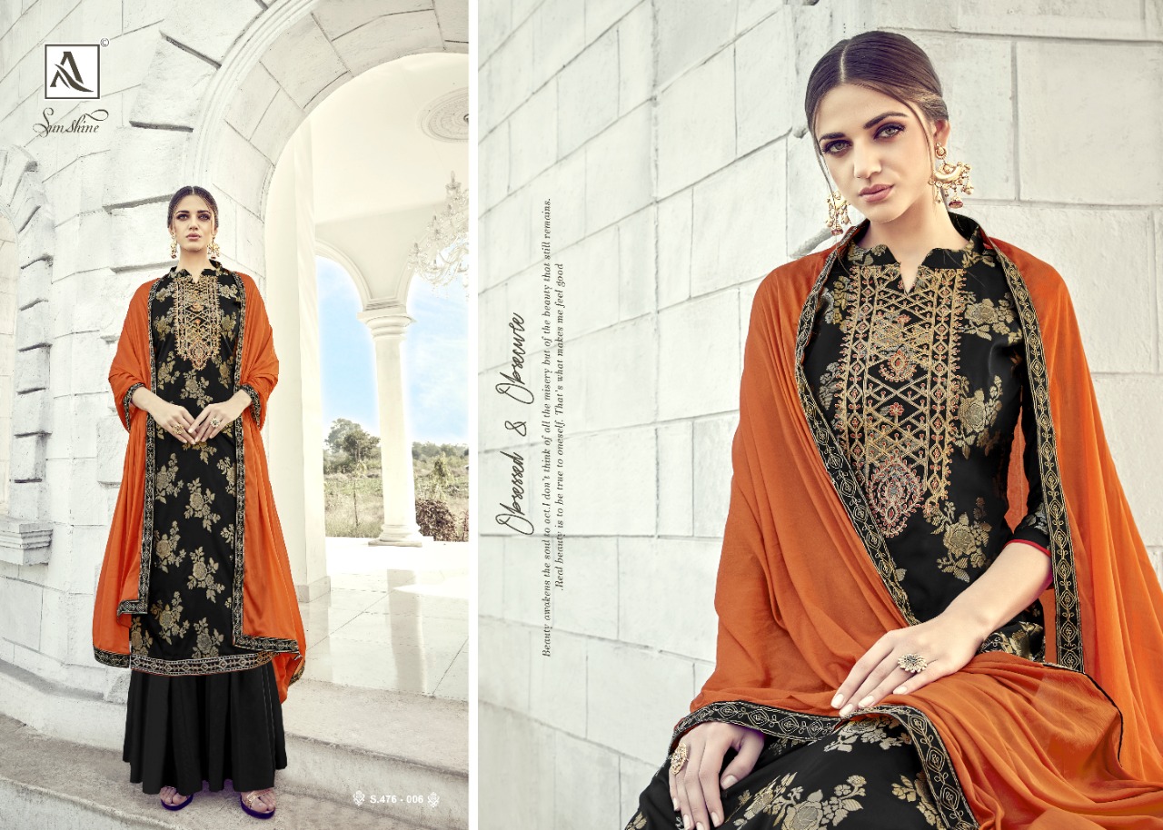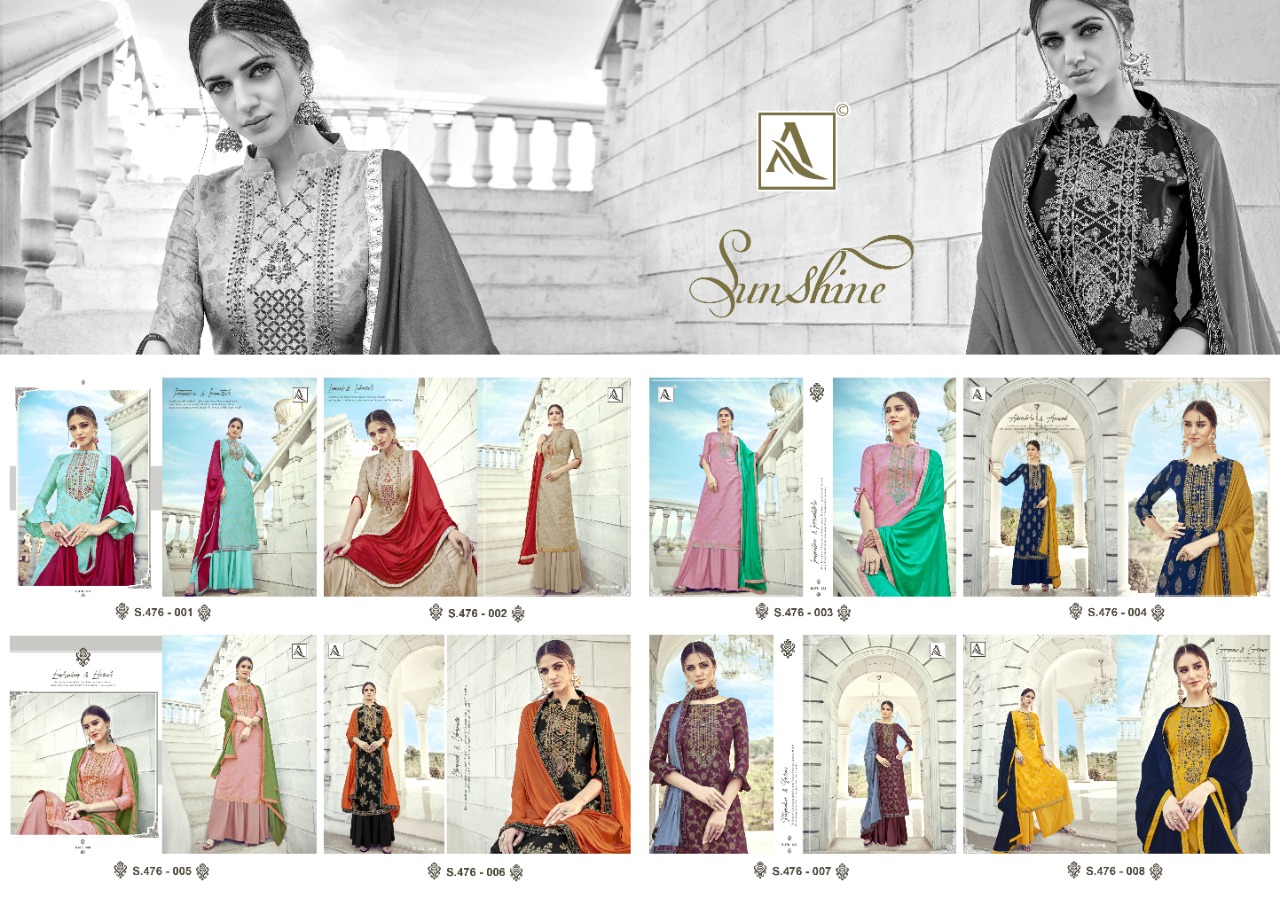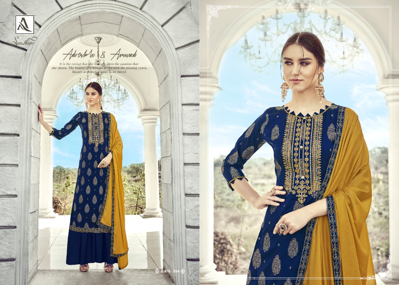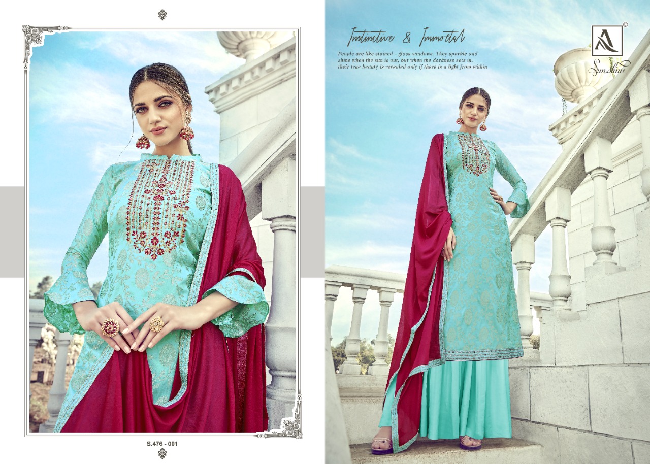 ALOK SUIT SUNSHINE - Incredible Banarasi Embroidery Collection Here Alok Suit presents a very fresh Embroidery Collection - SUNSHINE. Chic Designer Top with Stylish bottom and tempting Dupatta is surly going to give you best comfort with style. Fabric Details: Top: Pure Banarsi Jacquard with Embroidery and Fancy Diamond Work Bottom: Pure Santoon Solid Dupatta: Pure Chinnon Solid with Four Side Embroidery Lace The single set of dresses contains: 8⃣Pcs Make it yours with really affordable rate: ₹8⃣4⃣0⃣ + 5⃣% GST |