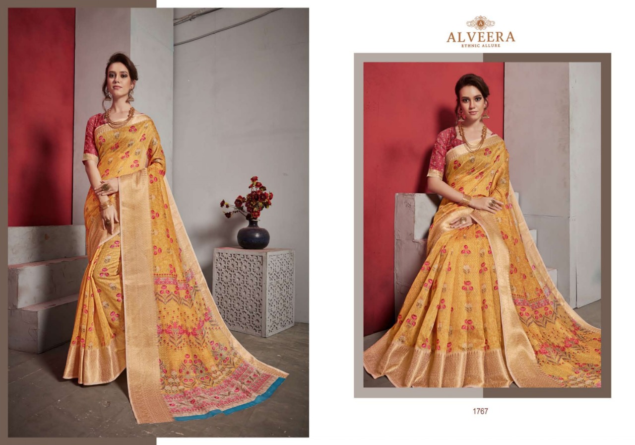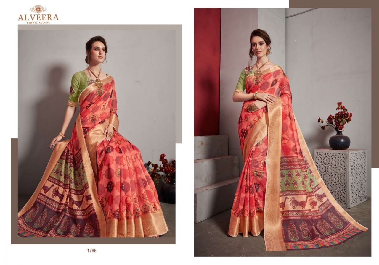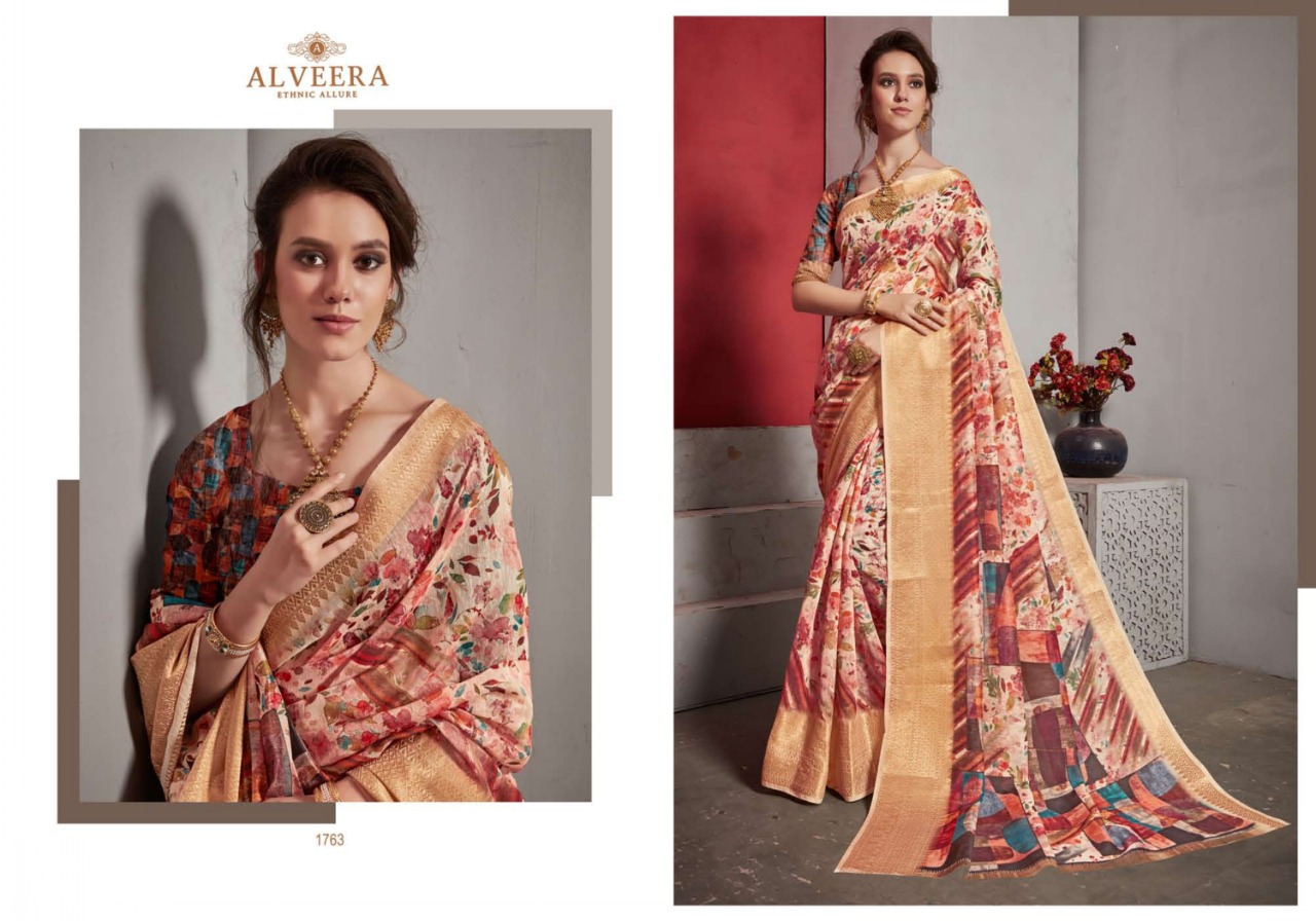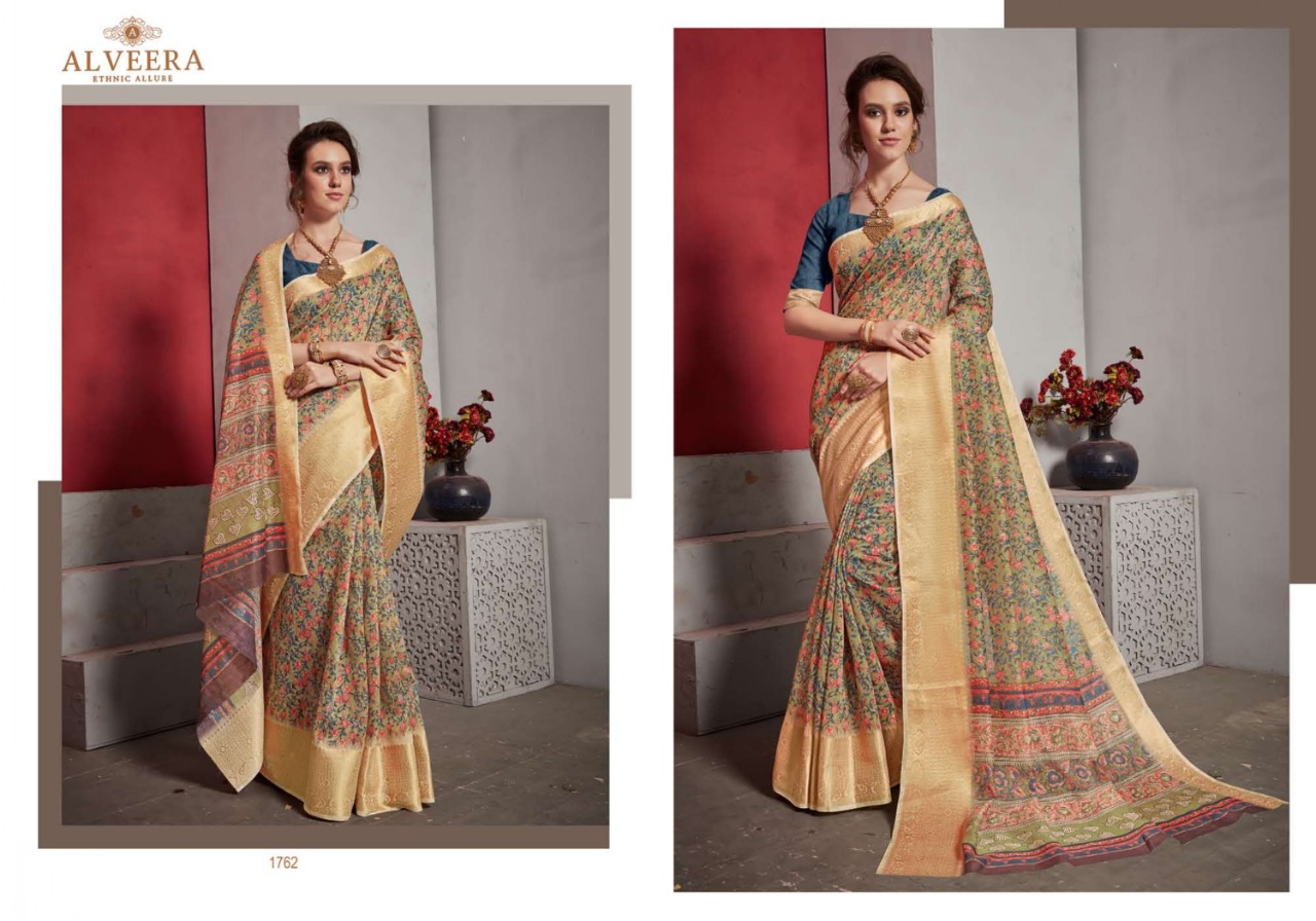 Brand - Alveera . Catlog Name - AASHI . Rate -1050 per pcs Fabric: jacquard weaving lilen saree with digital print Set to set. GST 5 Percent Extra. Delivery 2 days |