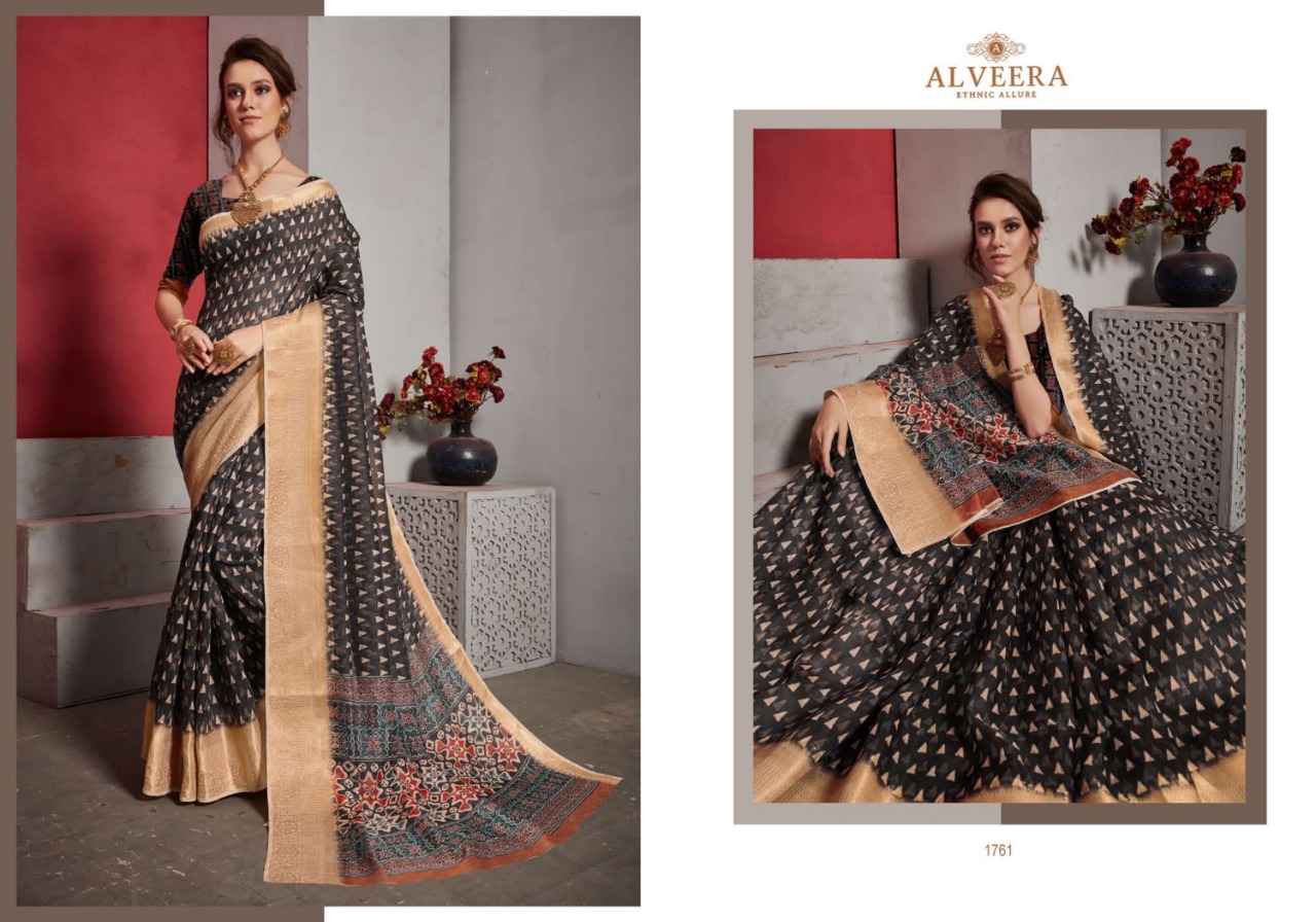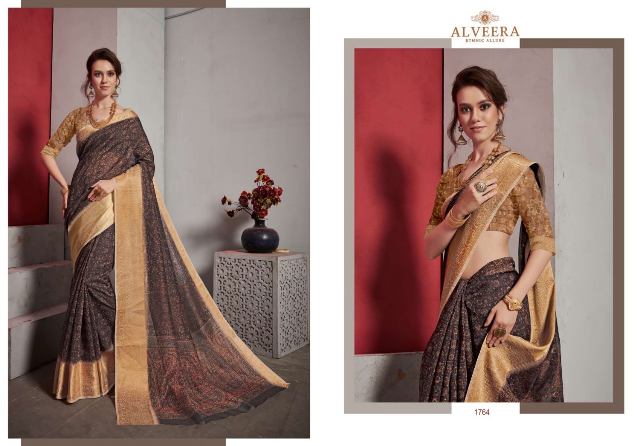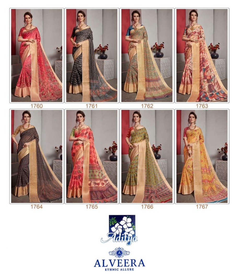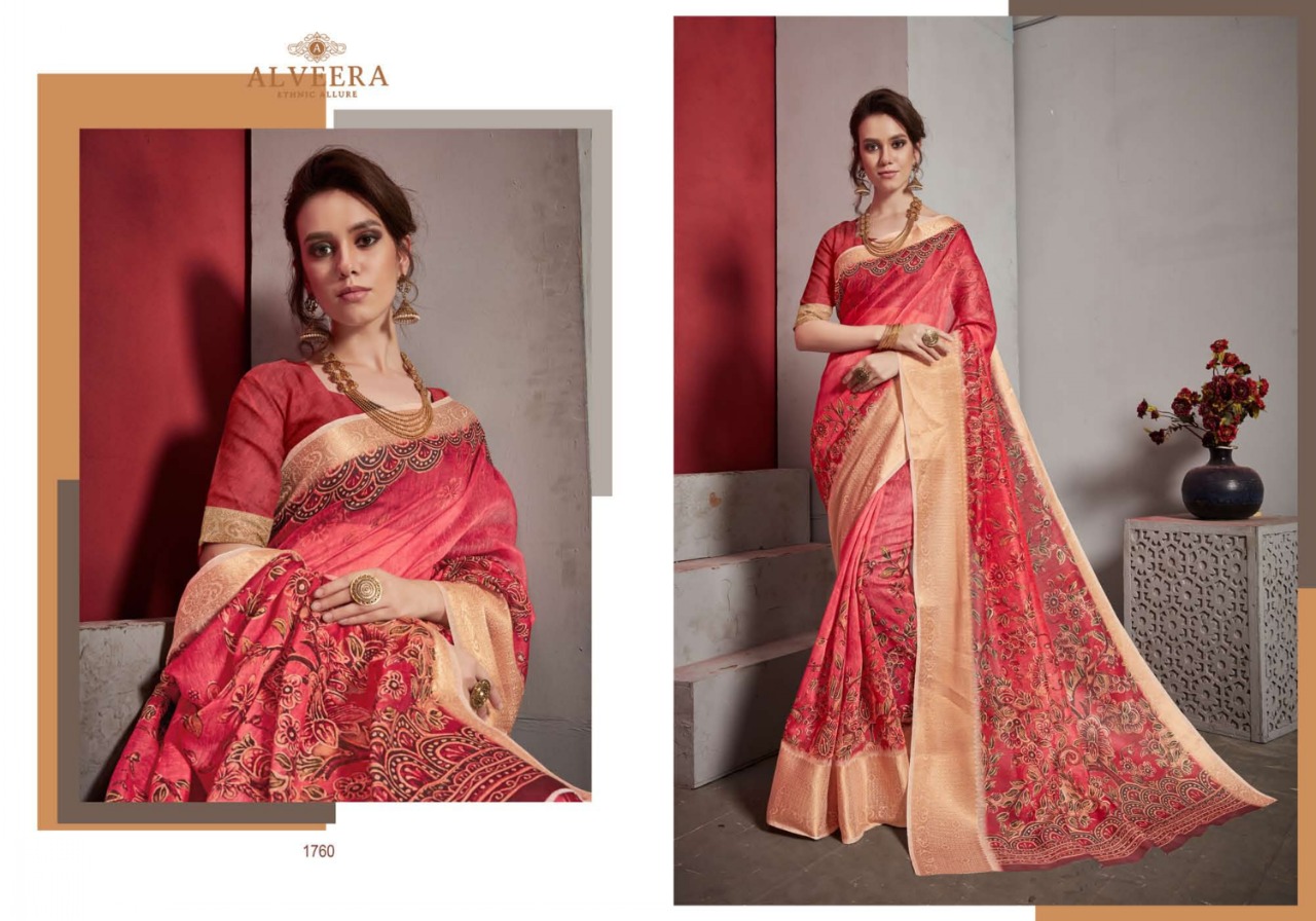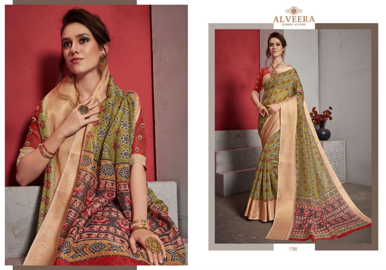 Brand - Alveera . Catlog Name - AASHI . Rate -1050 per pcs Fabric: jacquard weaving lilen saree with digital print Set to set. GST 5 Percent Extra. Delivery 2 days |