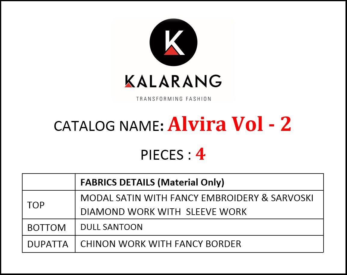 Kalarang. has launched Catalog name : Alvira Vol - 2 Fabric Details âªTop:- MODAL SATIN WITH FANCY EMBROIDERY & SARVOSKI DIAMOND WORK WITH SLEEVE WORK âªBottom:- DULL SANTOON âªDupatta:- CHINON WORK WITH FANCY BORDER âªTotal Design:- 4 Rate -999 per pcs . Set To Set. GST 5 Percent Extra â°Dispatching 5 to 6 days later |